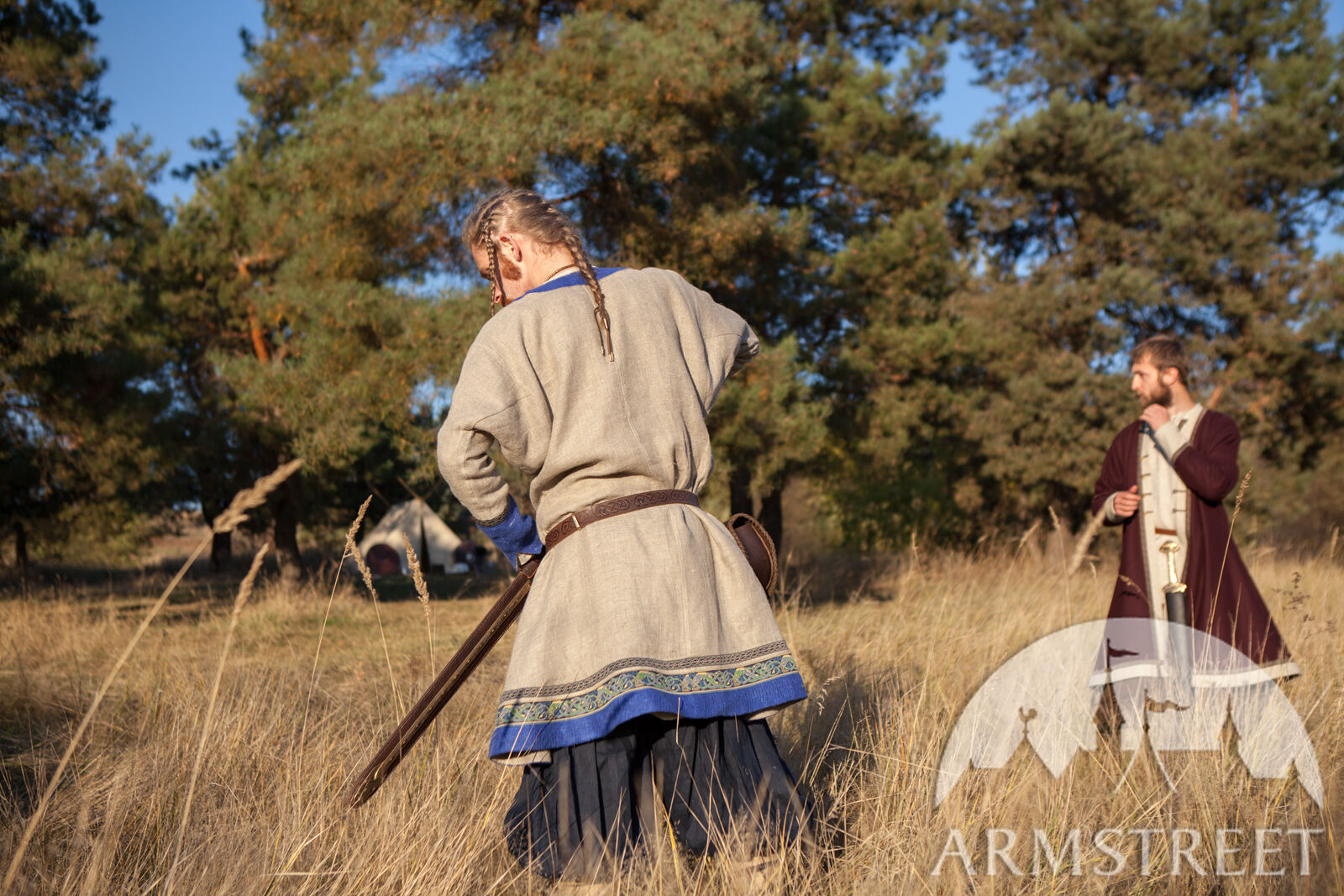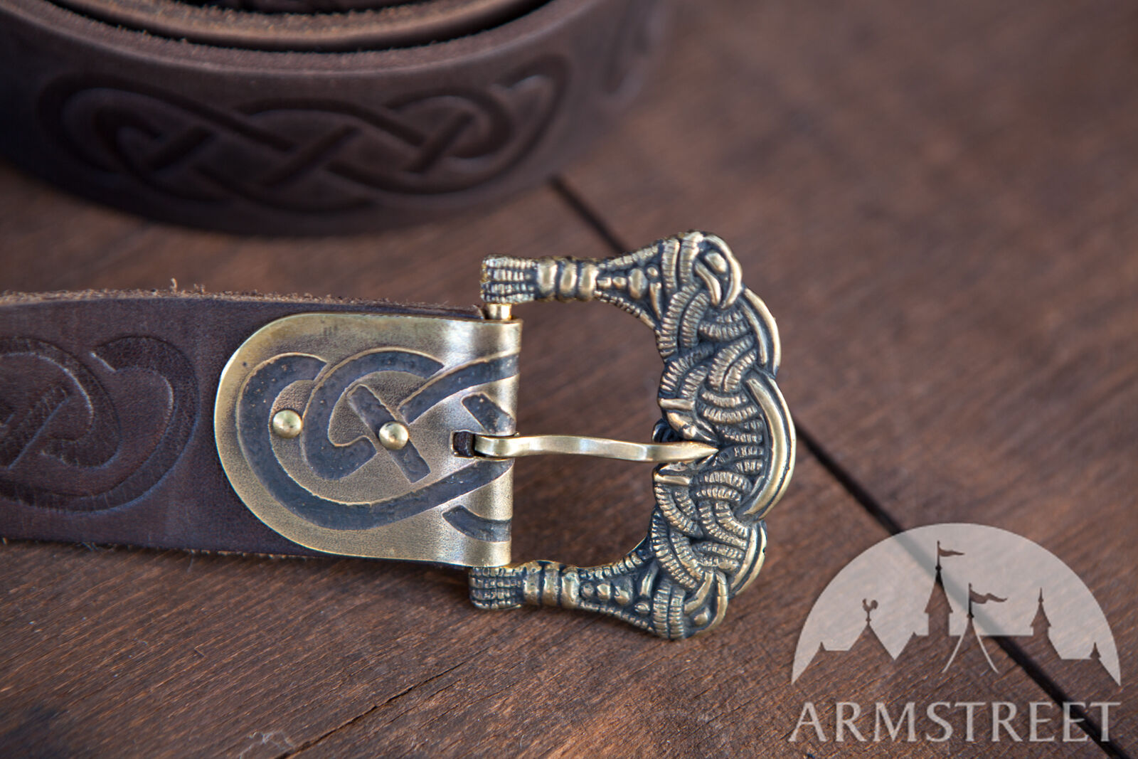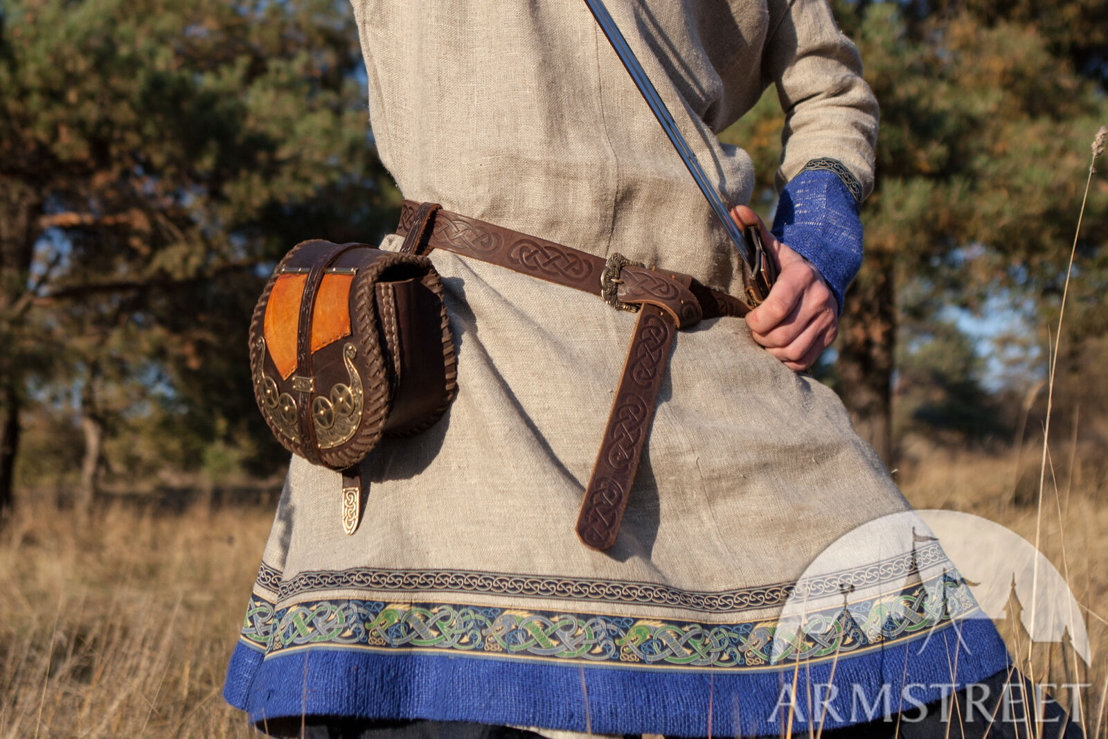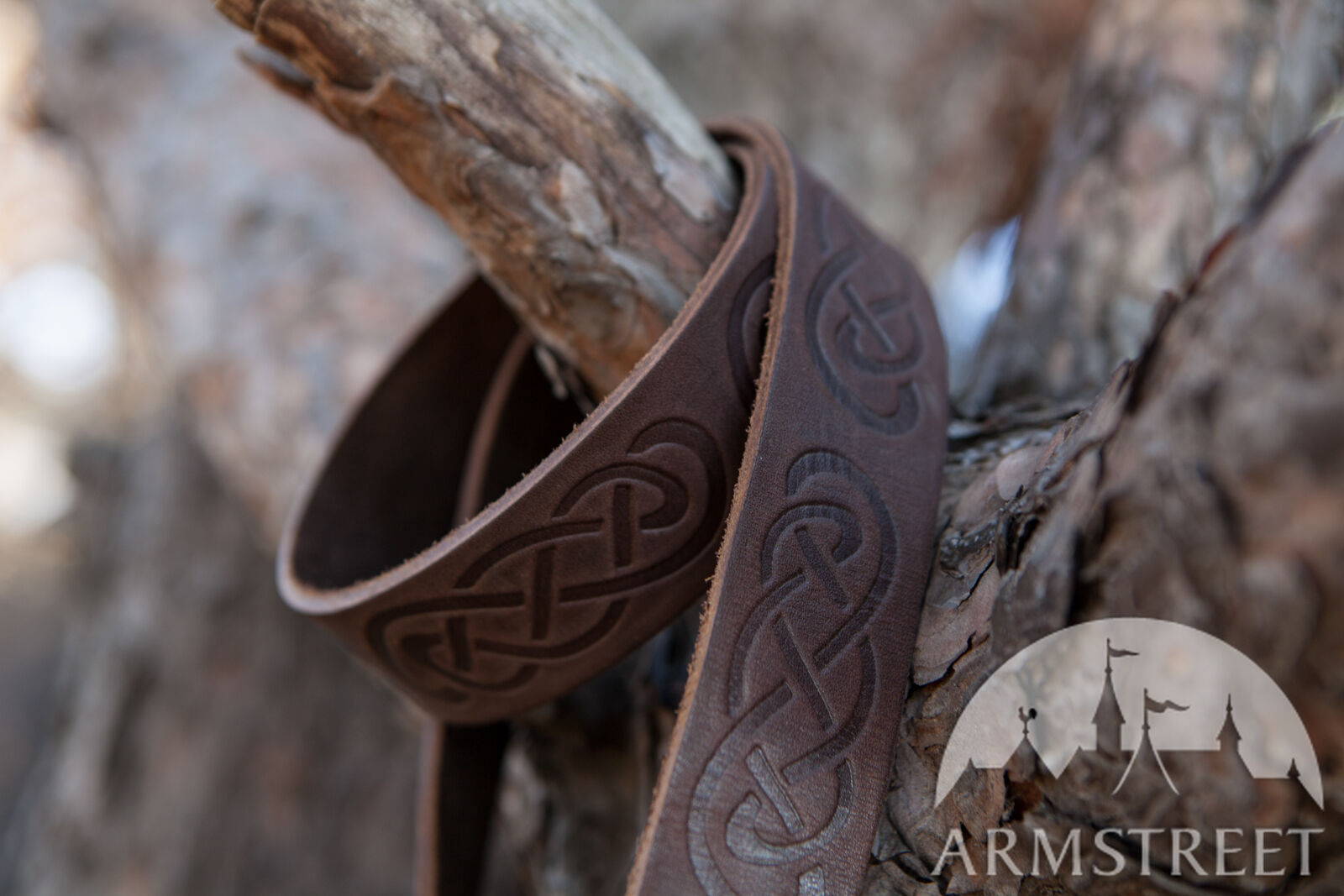 Dieser Gürtel ist ein Teil unserer Wikinger-Kollektion. Es wird mit geprägtem Muster und handgemachten Spangen aus Messing verziert. Ein hervorragender stilvoller Teil Ihrer Mittelalter-Garderobe!