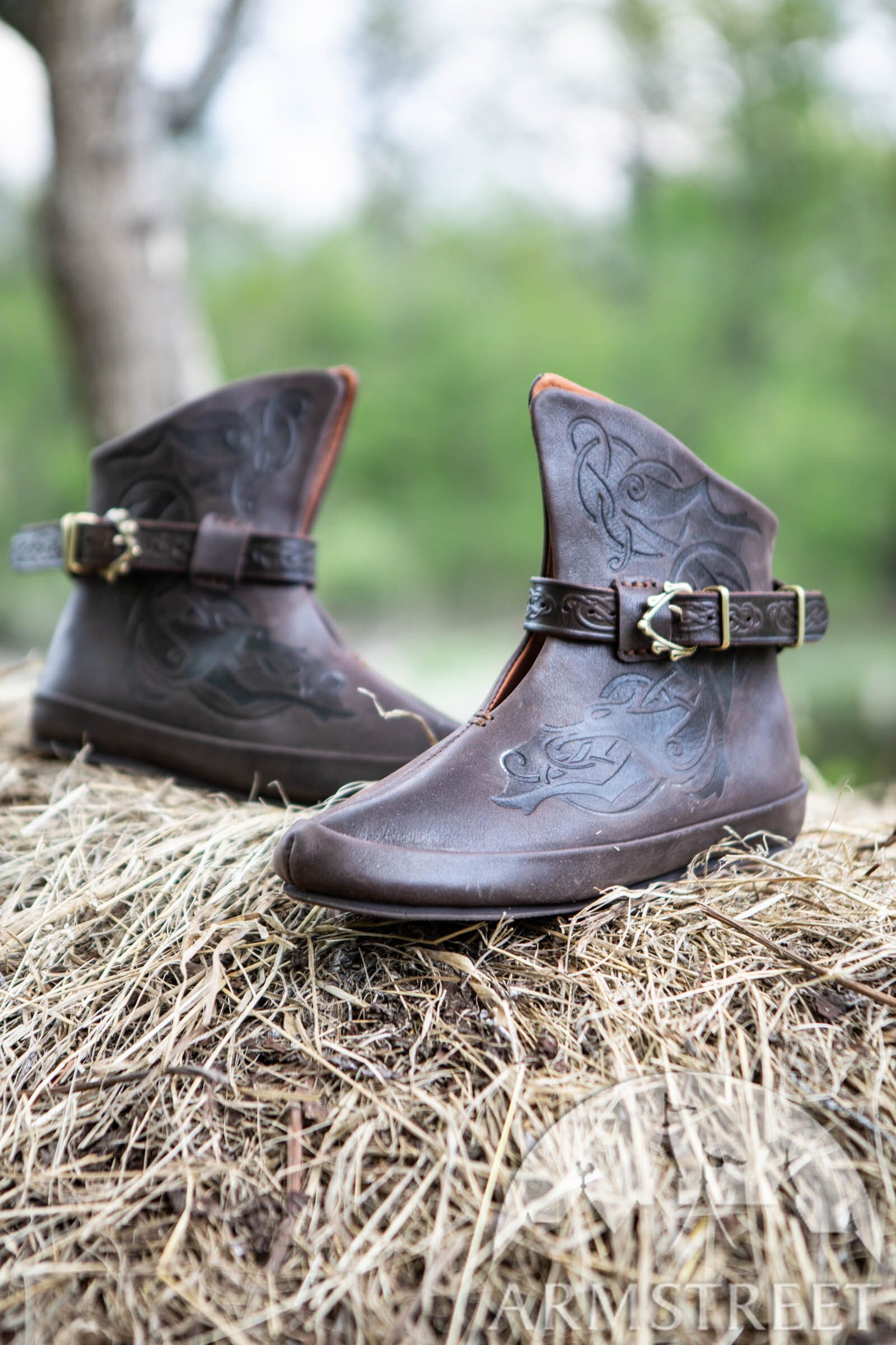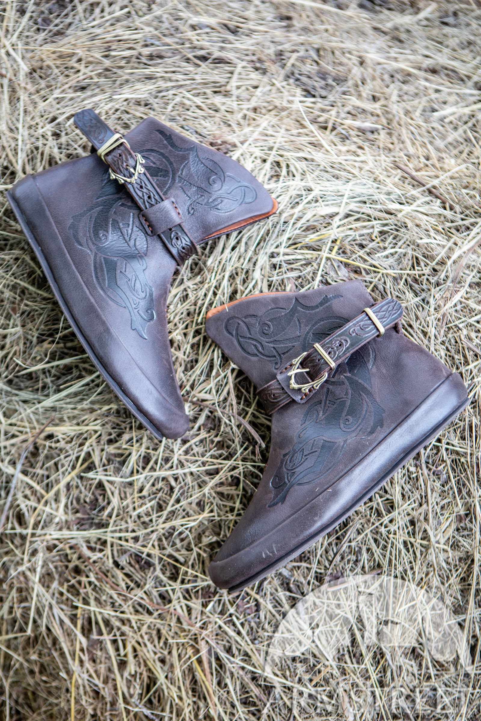 Die Prägung dieser Schuhe ist so auffällig, weil wir ein schönes Leder mit einem leicht matten Finish verwendet haben, das flexibel, aber stark ist. Die Entwürfe sind Wölfe, inspiriert von der Wikinger Kunst und Knotenmustern und von unserem Team von Grafikdesignern entworfen. Ein kontrastfarbenes Leder wird verwendet, um die Innenseite des Schuhs auszukleiden, und durchgehend wurden Maschinennähte verwendet, um sicherzustellen, dass alle Nähte schön sind. Ein Lederband mit Knotenprägung hält die Schuhe geschlossen - dazu eine attraktive Messinggussschnalle.