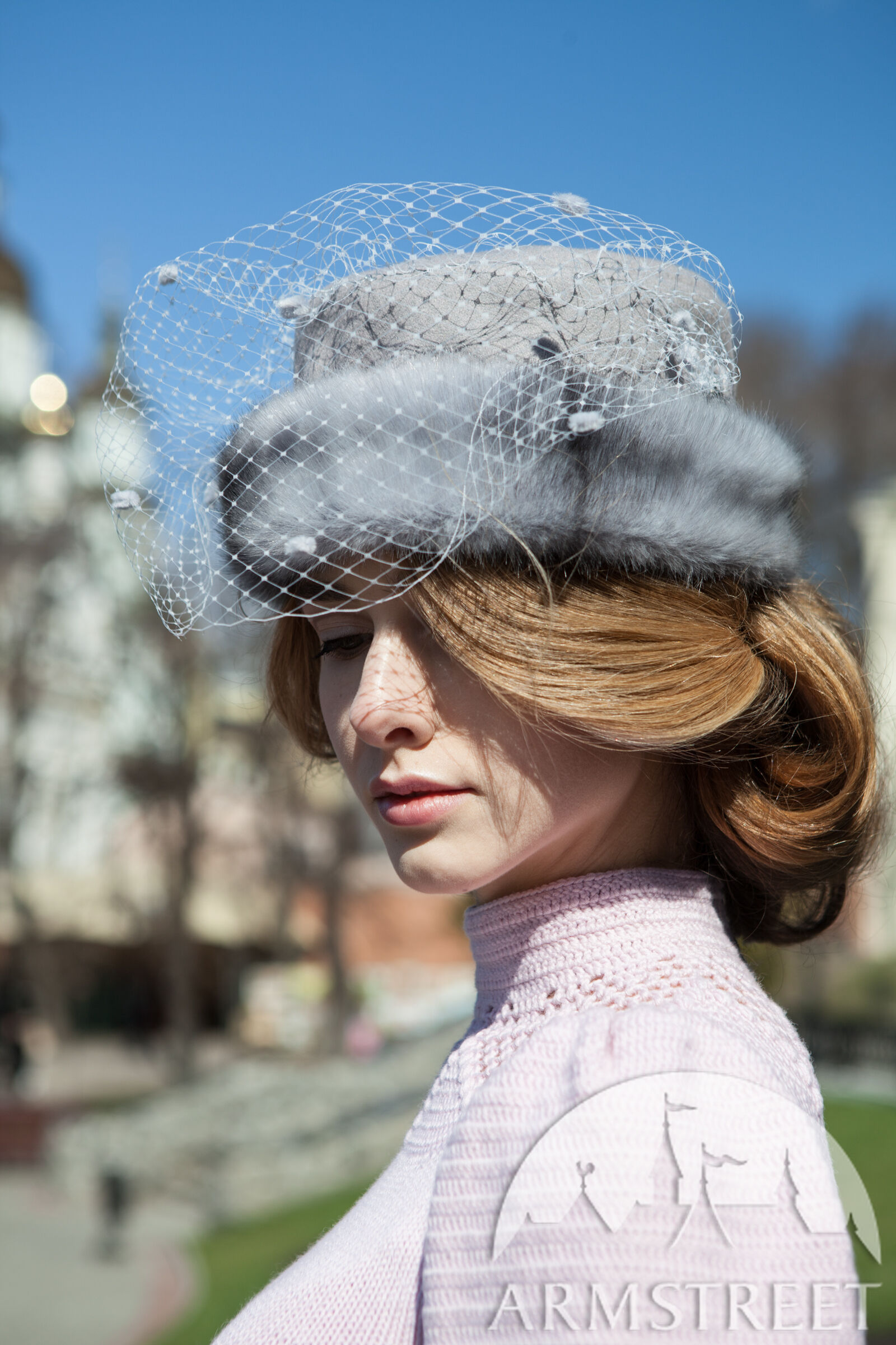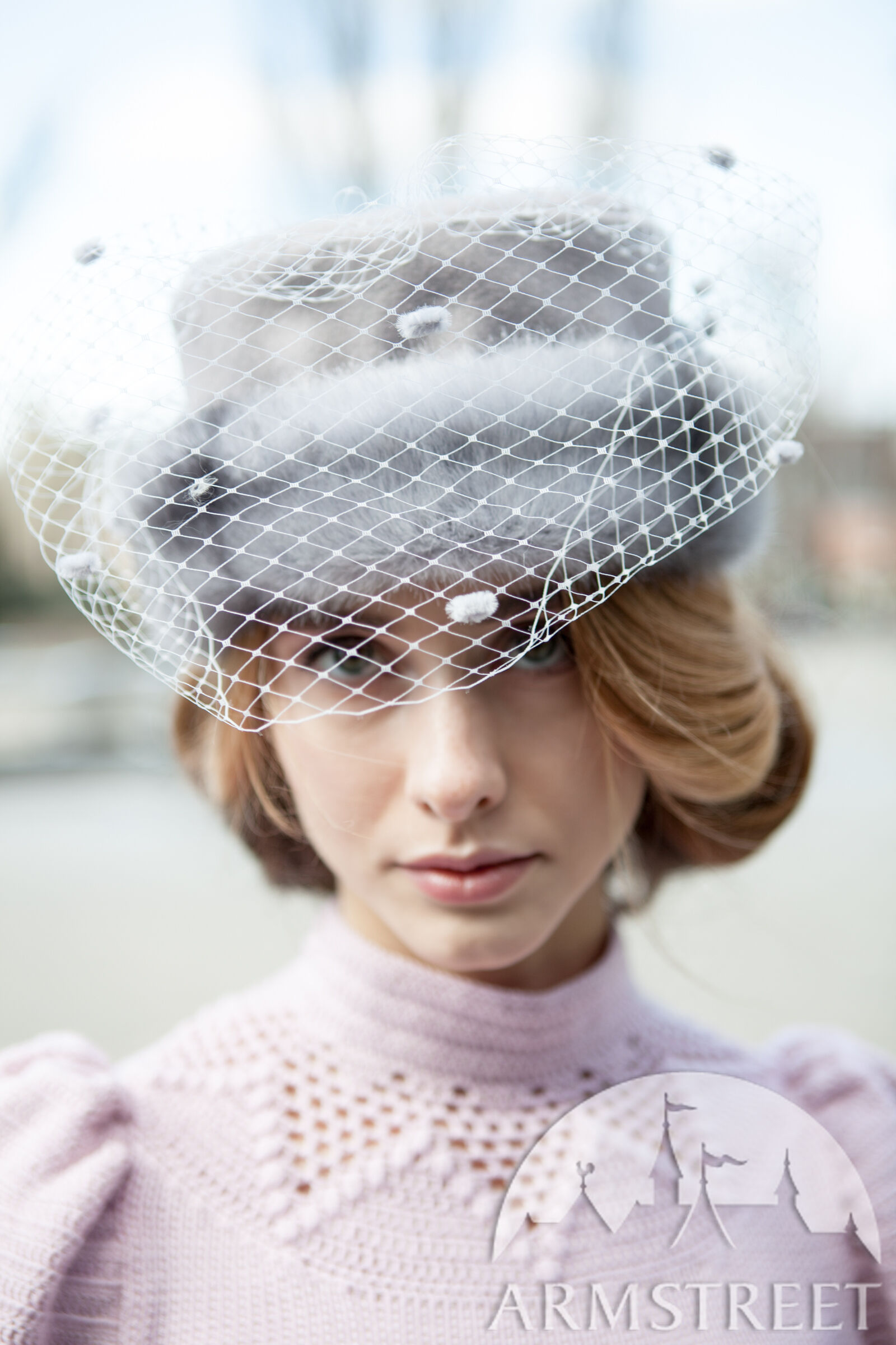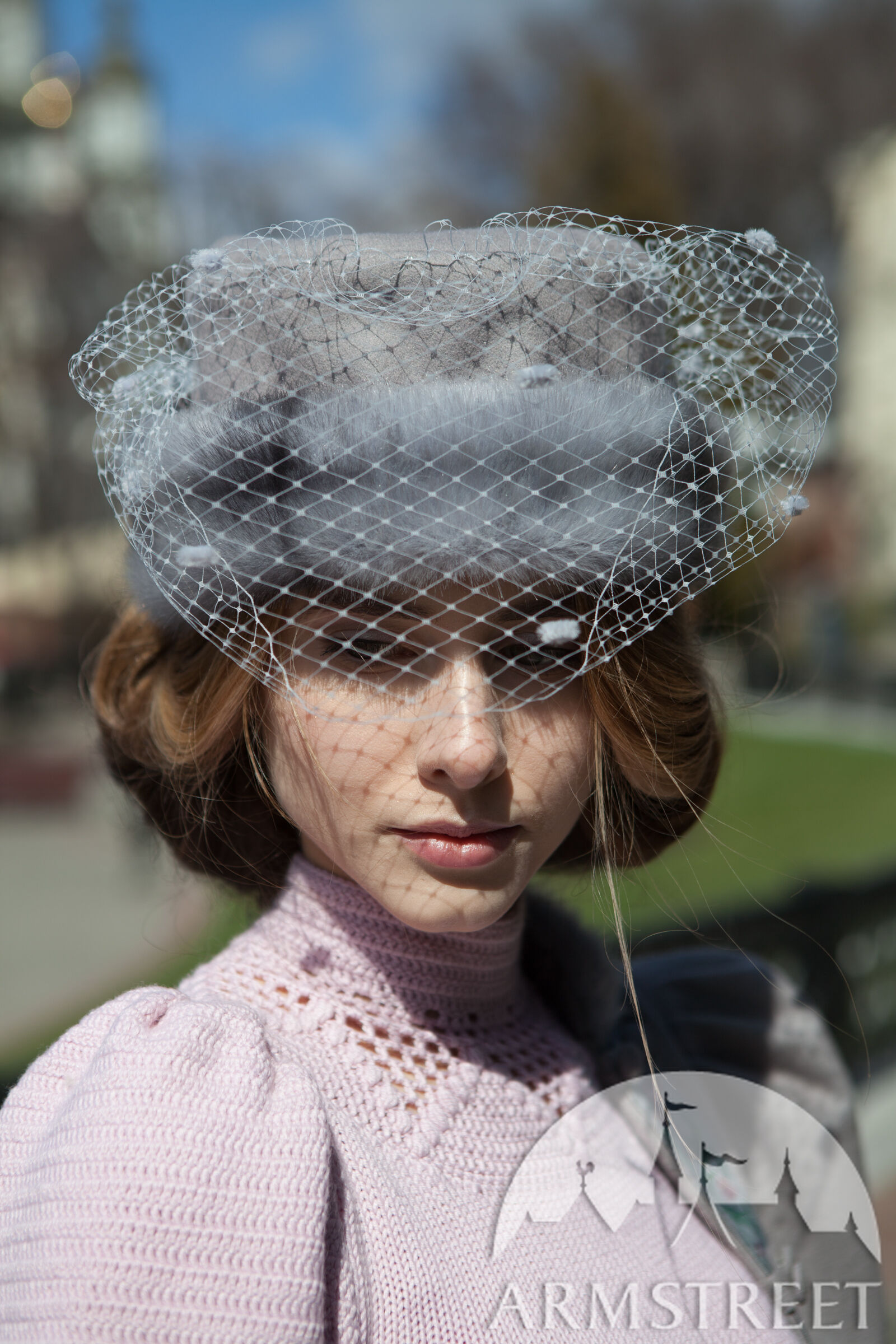 Dies ist eine Art von einem kleinen runden Hut aus natürlicher Wolle gefaltet in Form ohne Krempe. Es hat ein Fell als das Band und ist mit einem gemusterten Jacquard-Futter von der Unterseite verziert. Es hat einen zarten weißen Schleier, um die Augen zu decken. Es ist mit kleinen Punkten und mit einem Paar von Wolle-bezogenen Knöpfen an den Seiten verziert.
