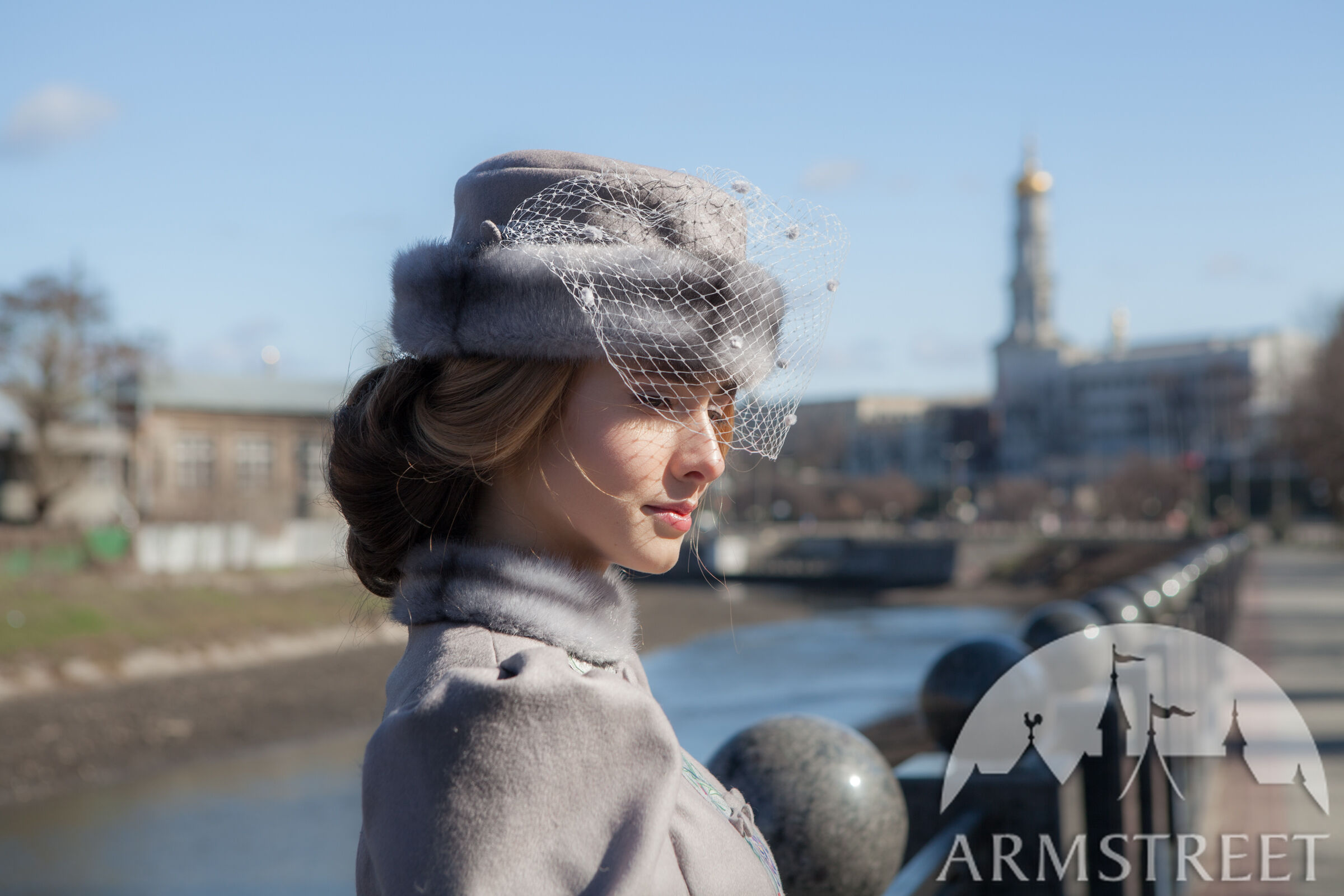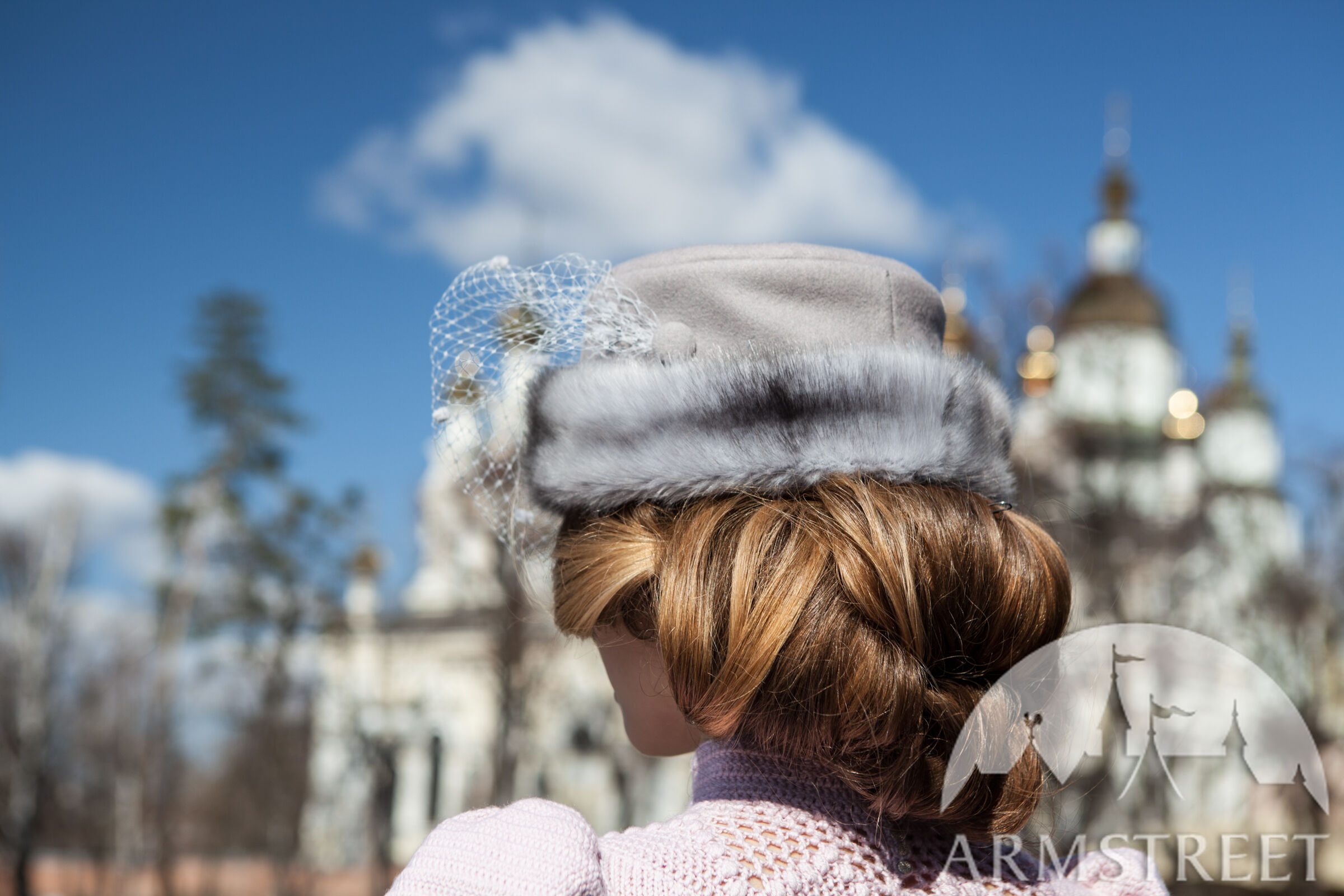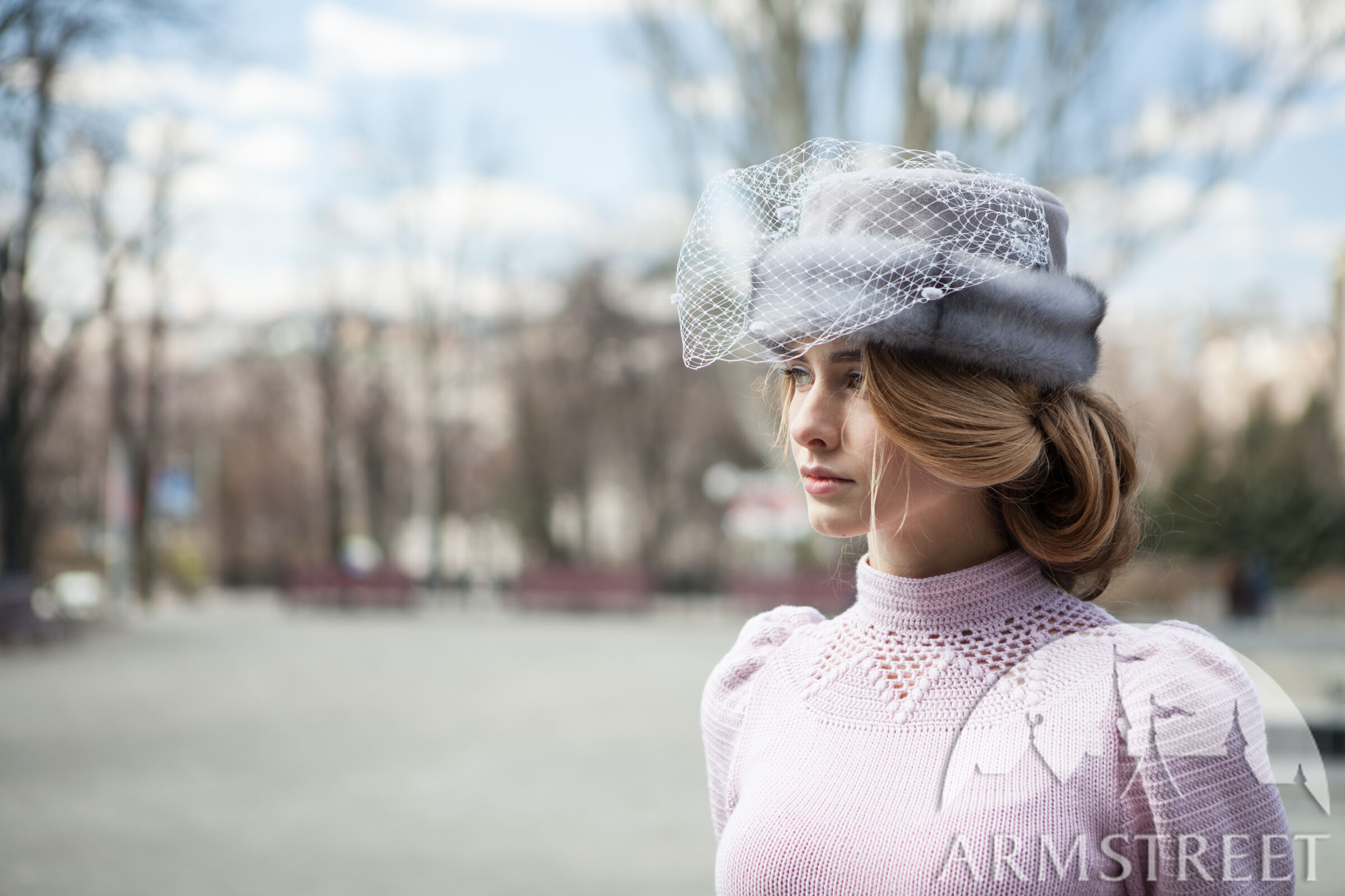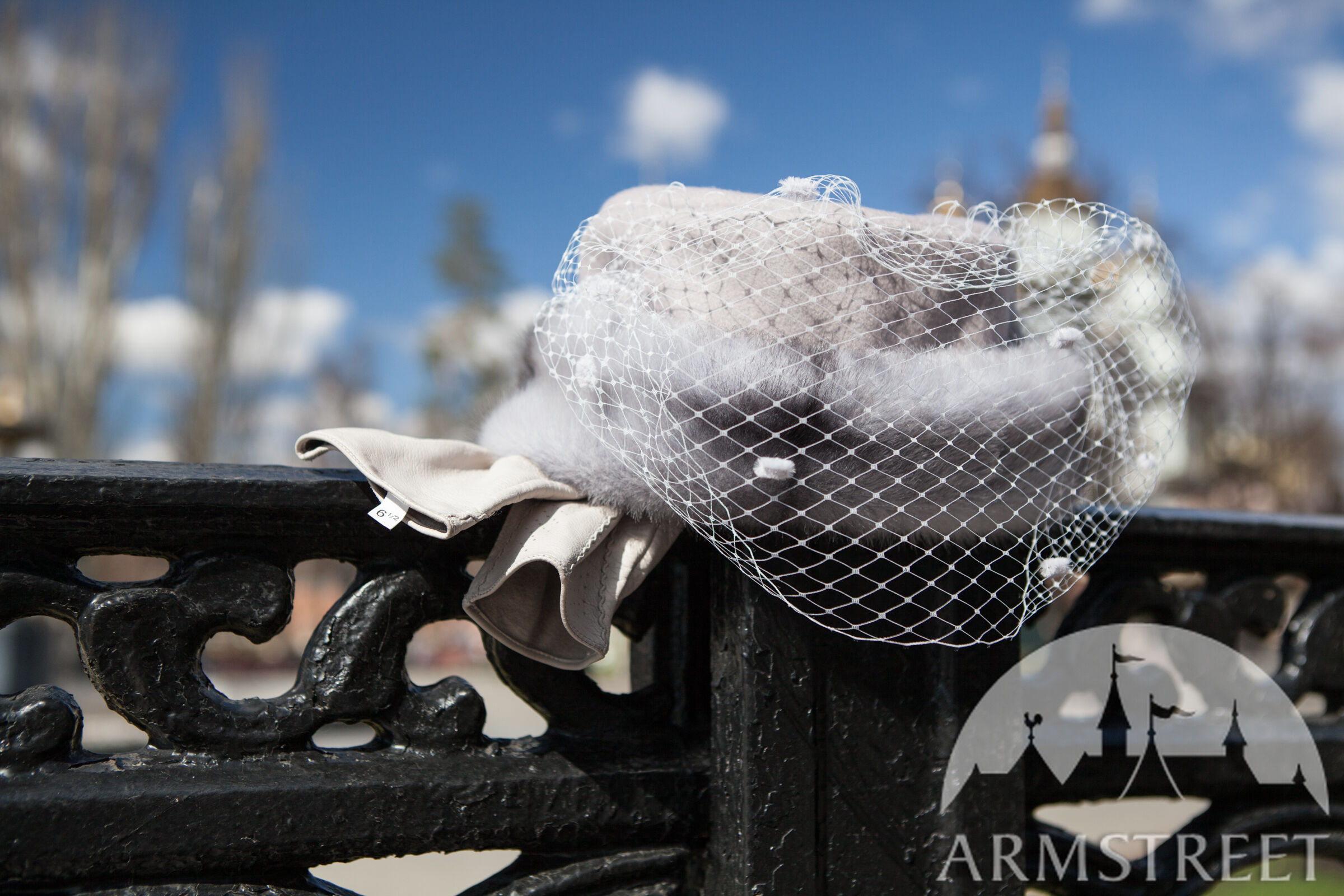Dies ist eine Art von einem kleinen runden Hut aus natürlicher Wolle gefaltet in Form ohne Krempe. Es hat ein Fell als das Band und ist mit einem gemusterten Jacquard-Futter von der Unterseite verziert. Es hat einen zarten weißen Schleier, um die Augen zu decken. Es ist mit kleinen Punkten und mit einem Paar von Wolle-bezogenen Knöpfen an den Seiten verziert.