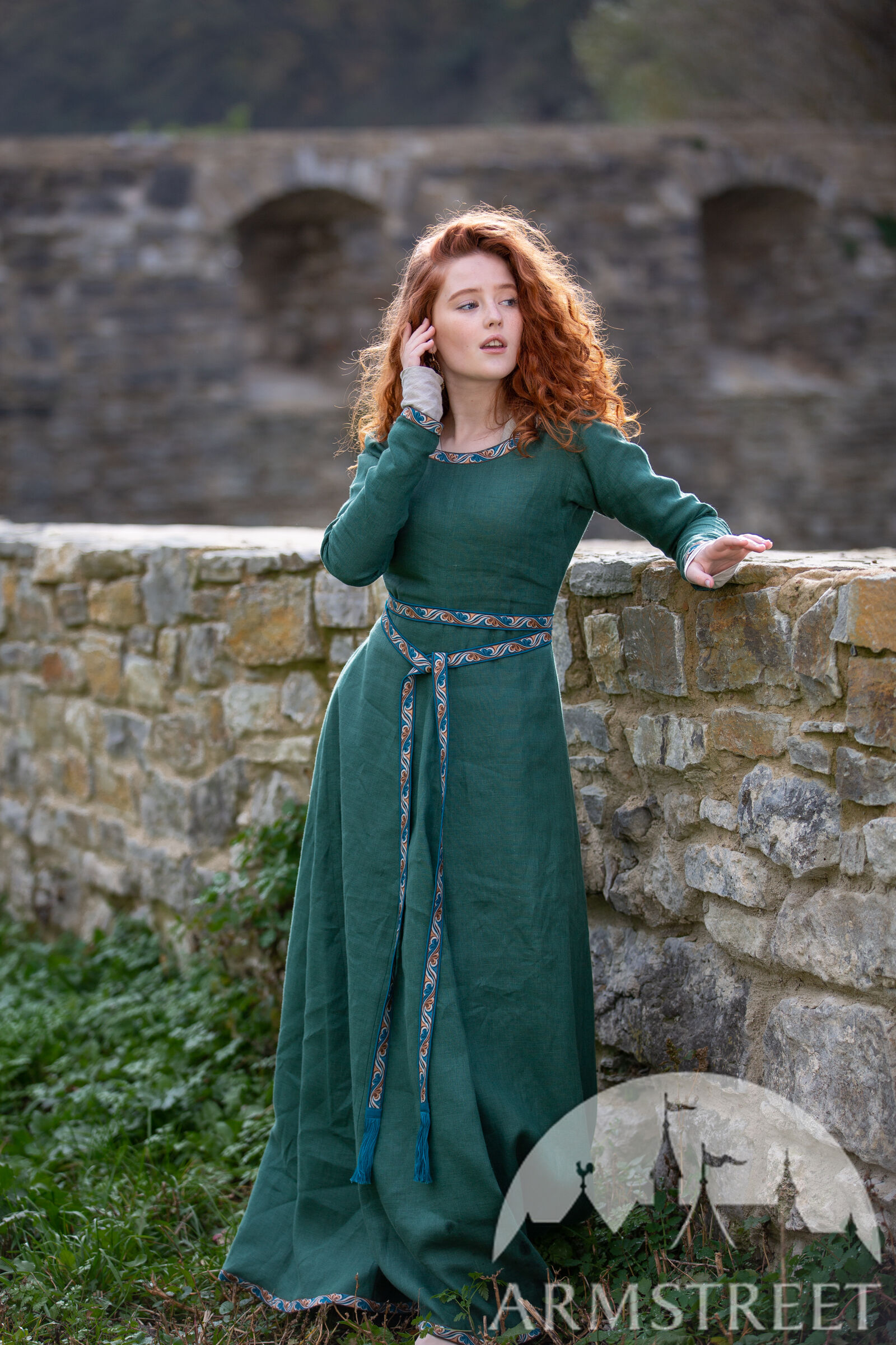 Dieses Kleid ist bodenlang und um die Taille etwas enger geschnitten als eine traditionelle Tunika, obwohl es immer noch frühmittelalterlichen Tuniken und Kleidern nahe kommt. Das Muster ist einer traditionellen Wikinger T-Tunika ziemlich ähnlich, mit Zwickeln unter den Armen für Bewegung und ein paar Keilen im Kleid, um ihm etwas mehr Volumen zu verleihen, ohne es umständlich zu machen. Es hat einen geschöpften Ausschnitt, der weder hoch noch niedrig ist und im Unterarm viel Platz für Bewegung und Tanz bietet. Die Ärmel sind lang und lockerer an der Schulter und verjüngen sich am Handgelenk.