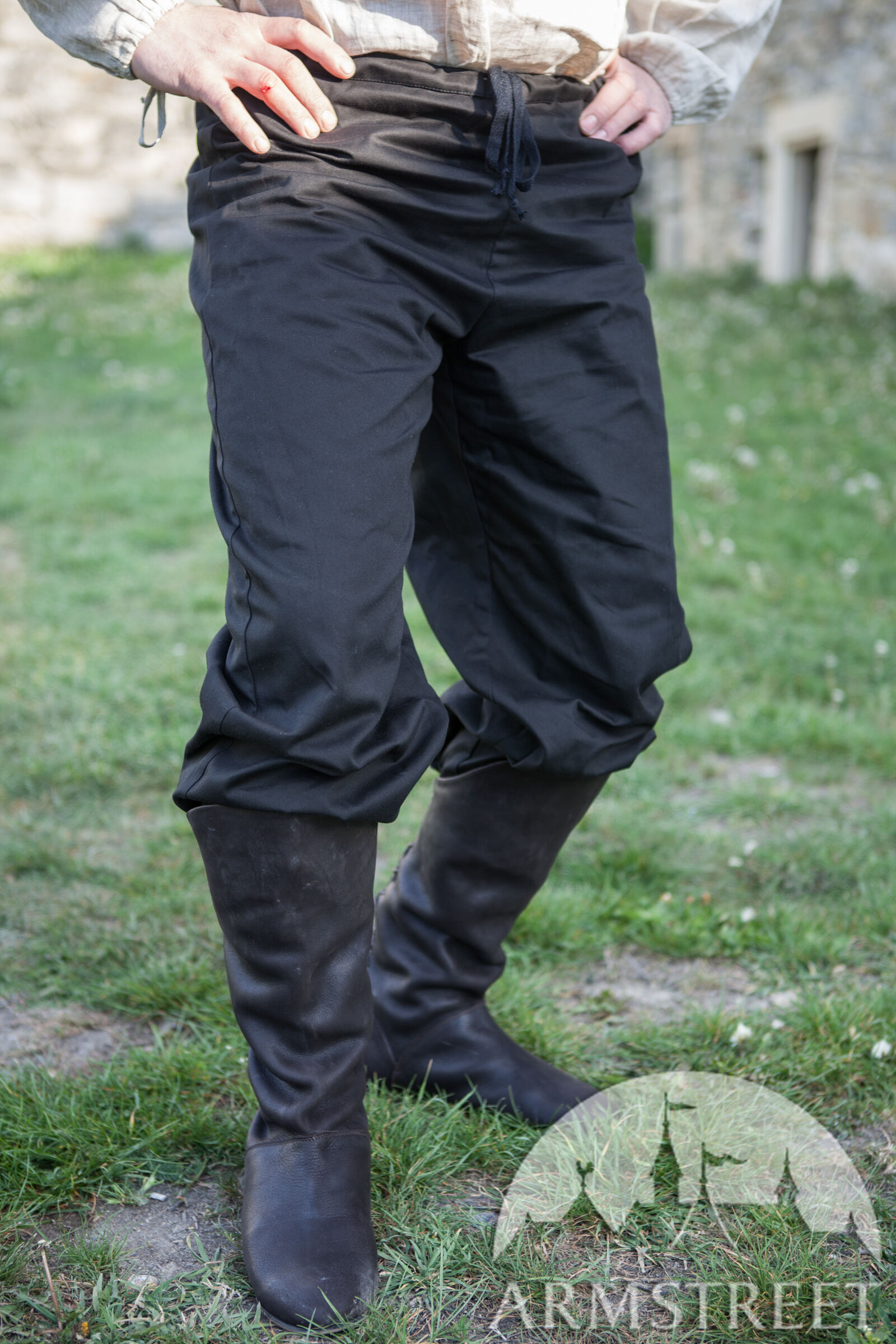 Schwarze Mittelalter Baumwollhose. Als erfahrene LARP-Spieler und Teilnehmer an historischen Veranstaltungen erinnern wir uns, wie schwierig es ist, einfache Hosen ohne all diese modernen Verschlüsse, Nieten und Stiche zu finden. Deshalb bieten wir einfache Baumwollhosen an, die nach dem klassischen Muster hergestellt wurden. Sie bestehen aus 100% natürlicher Baumwolle und können mit jeder Art von Mittelalter Schuhen oder Stiefeln getragen werden.