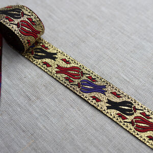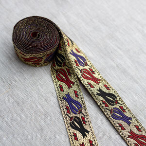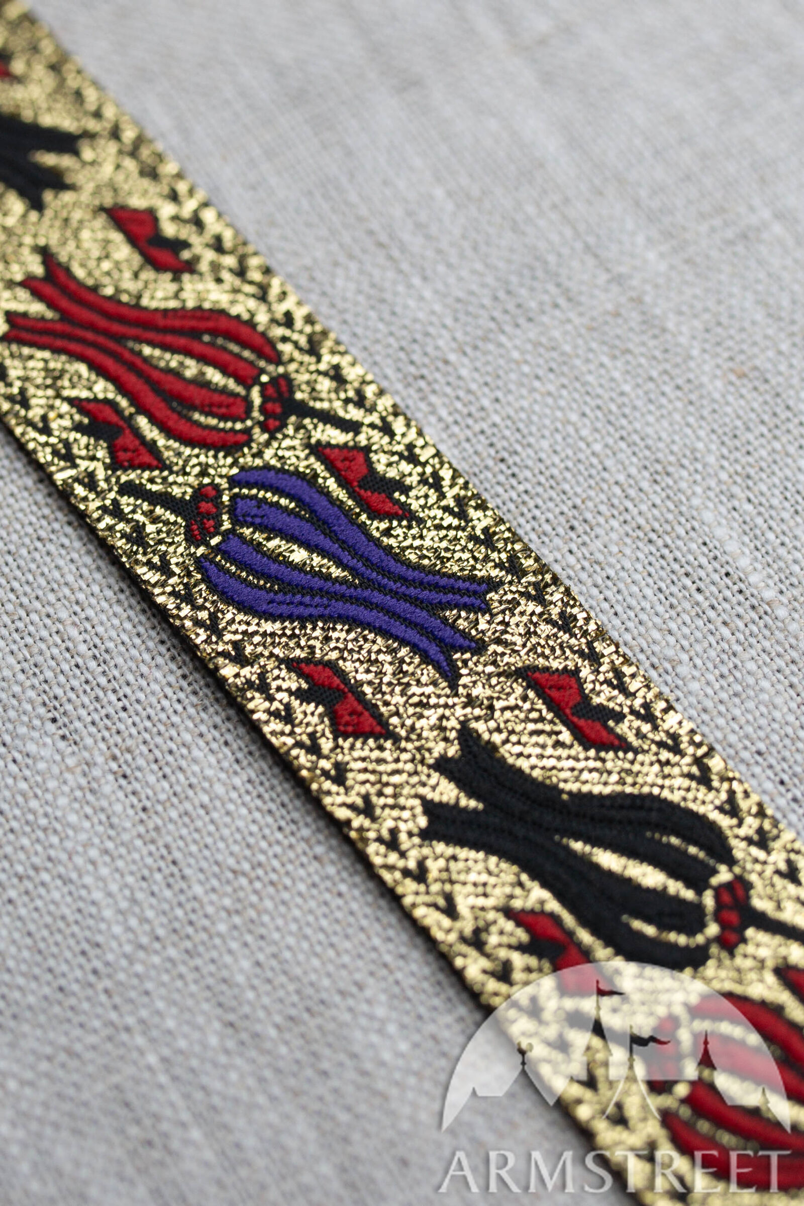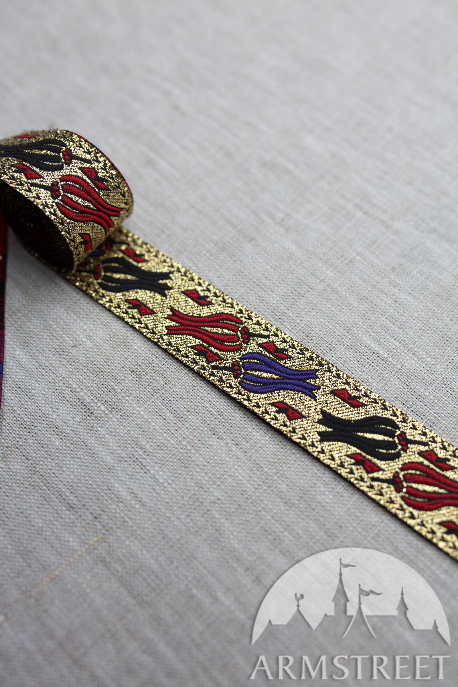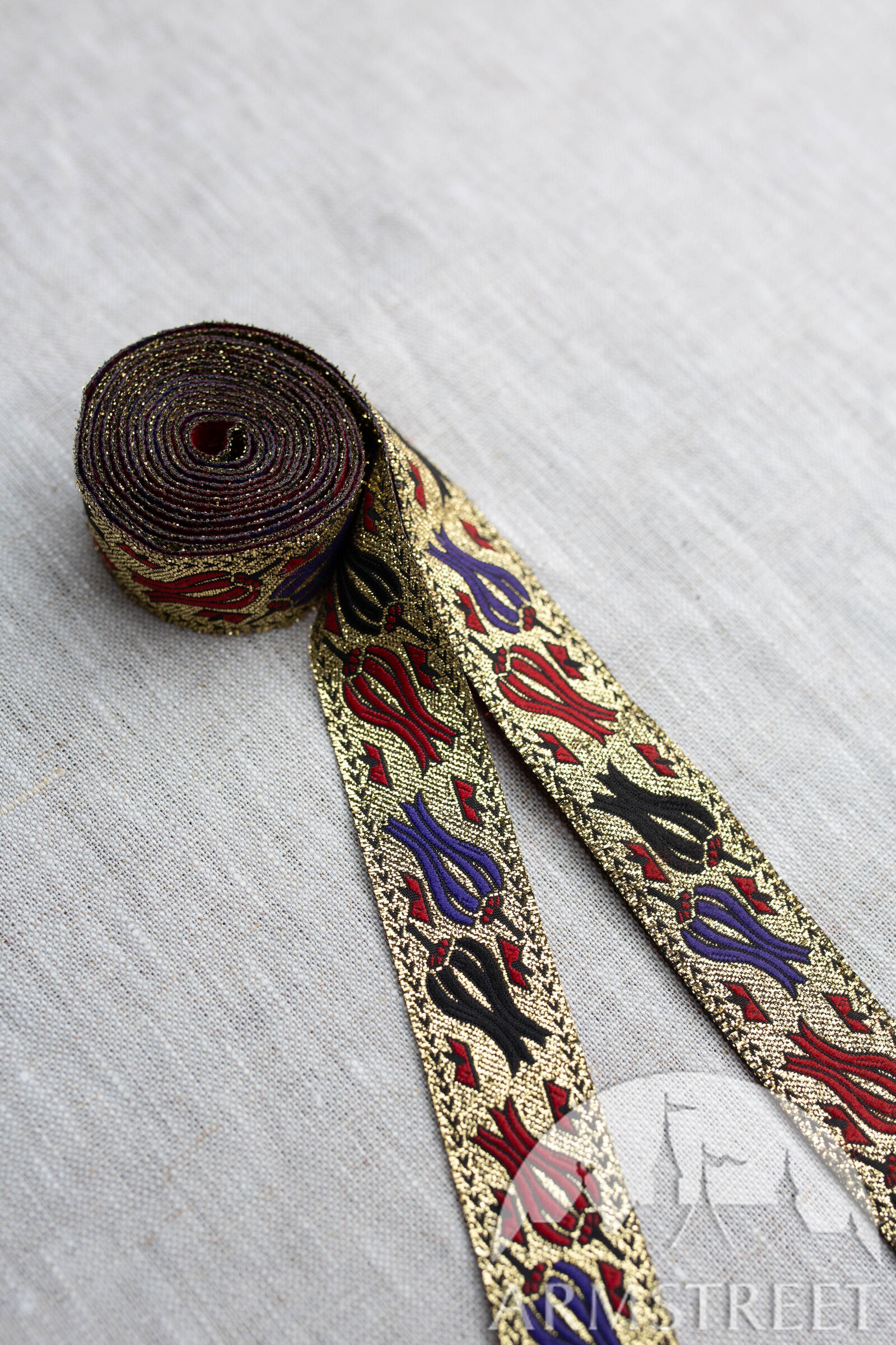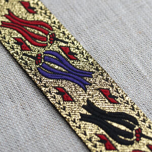 Diese Borte mit kontrastierendem Blumenmuster passt perfekt zu vielen verschiedenen Persönlichkeiten und verleiht Ihrem mittelalterlichen DIY-Projekt dank des leuchtend goldenen Hintergrunds und der roten, blauen und schwarzen Tulpen darüber einen auffälligen Akzent. Sehen Sie sich nur diese Farben an!