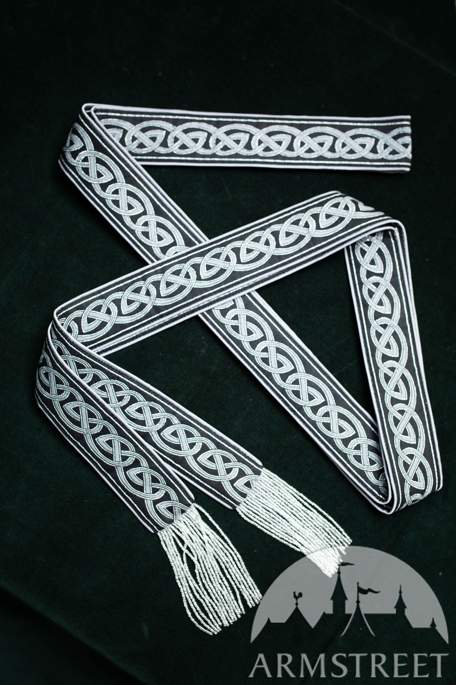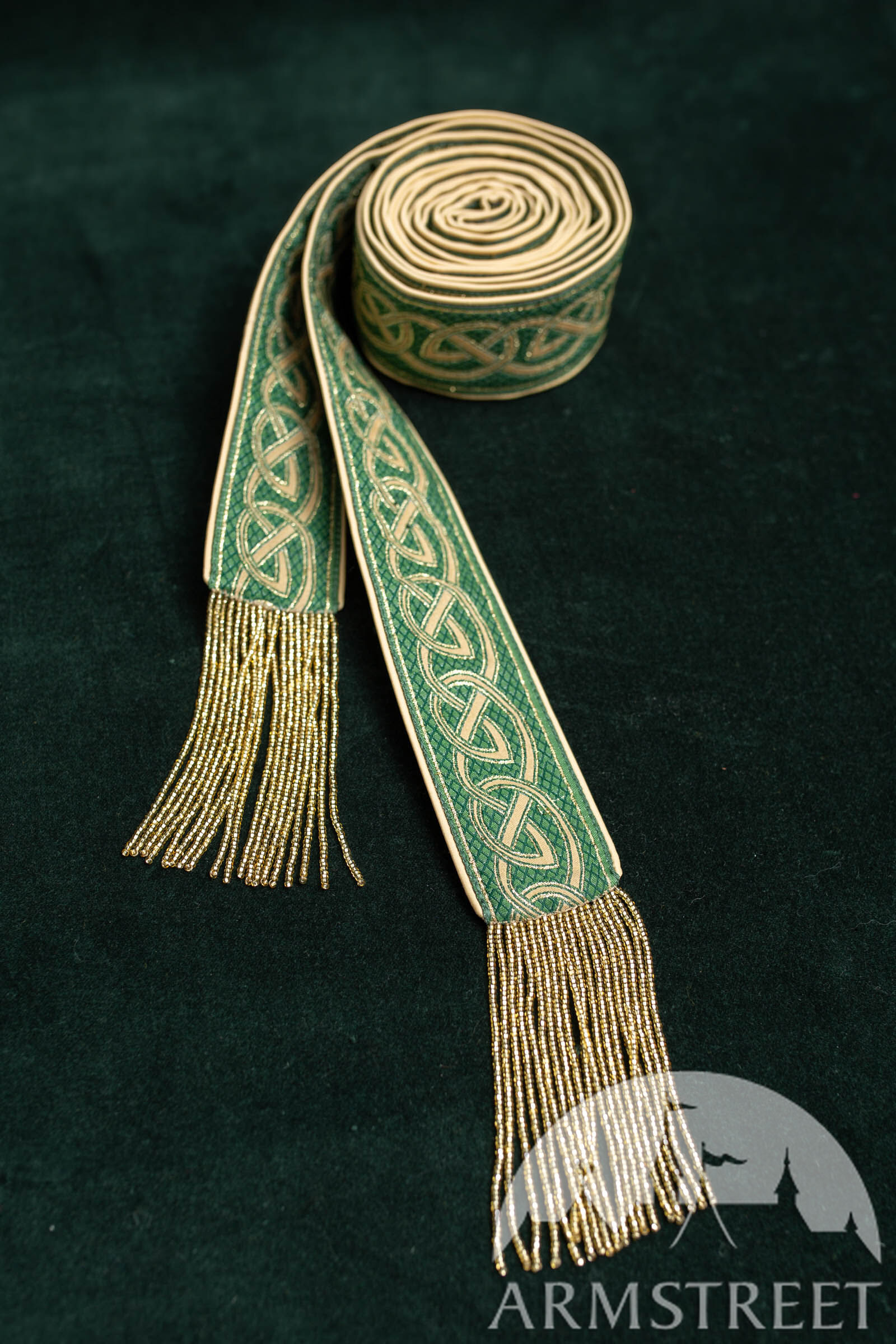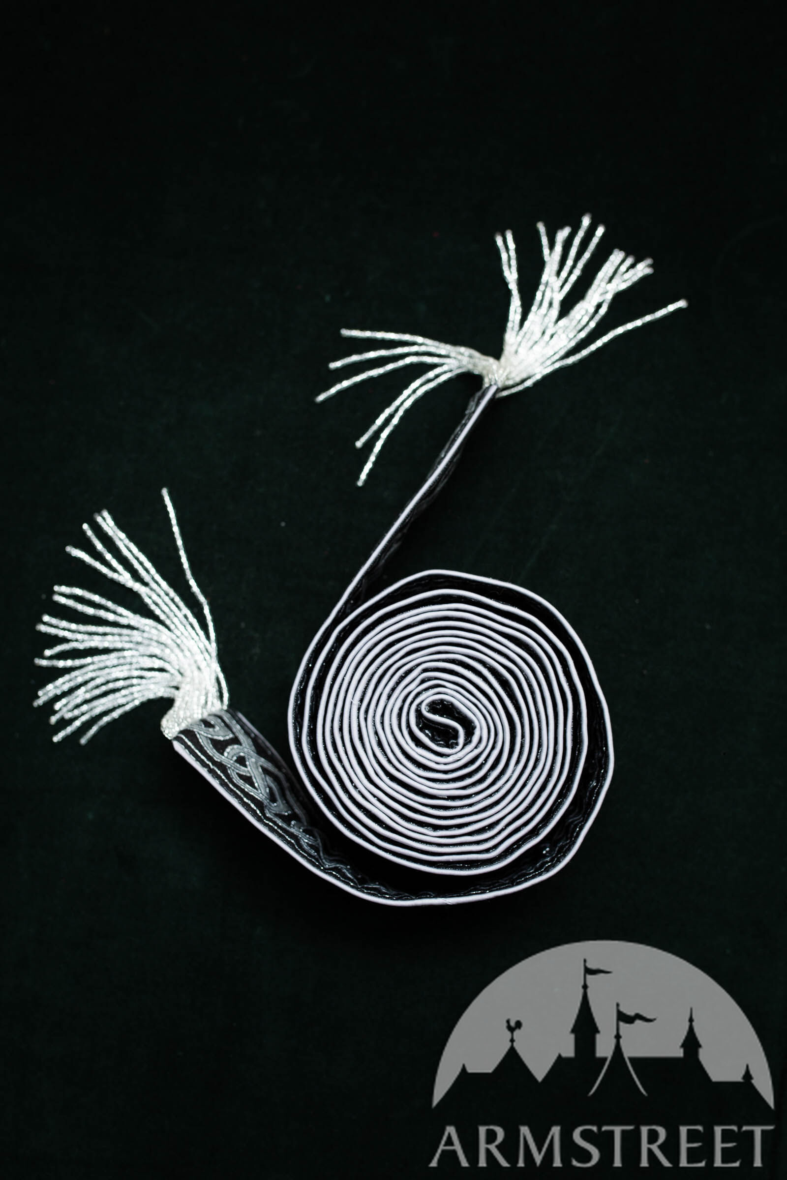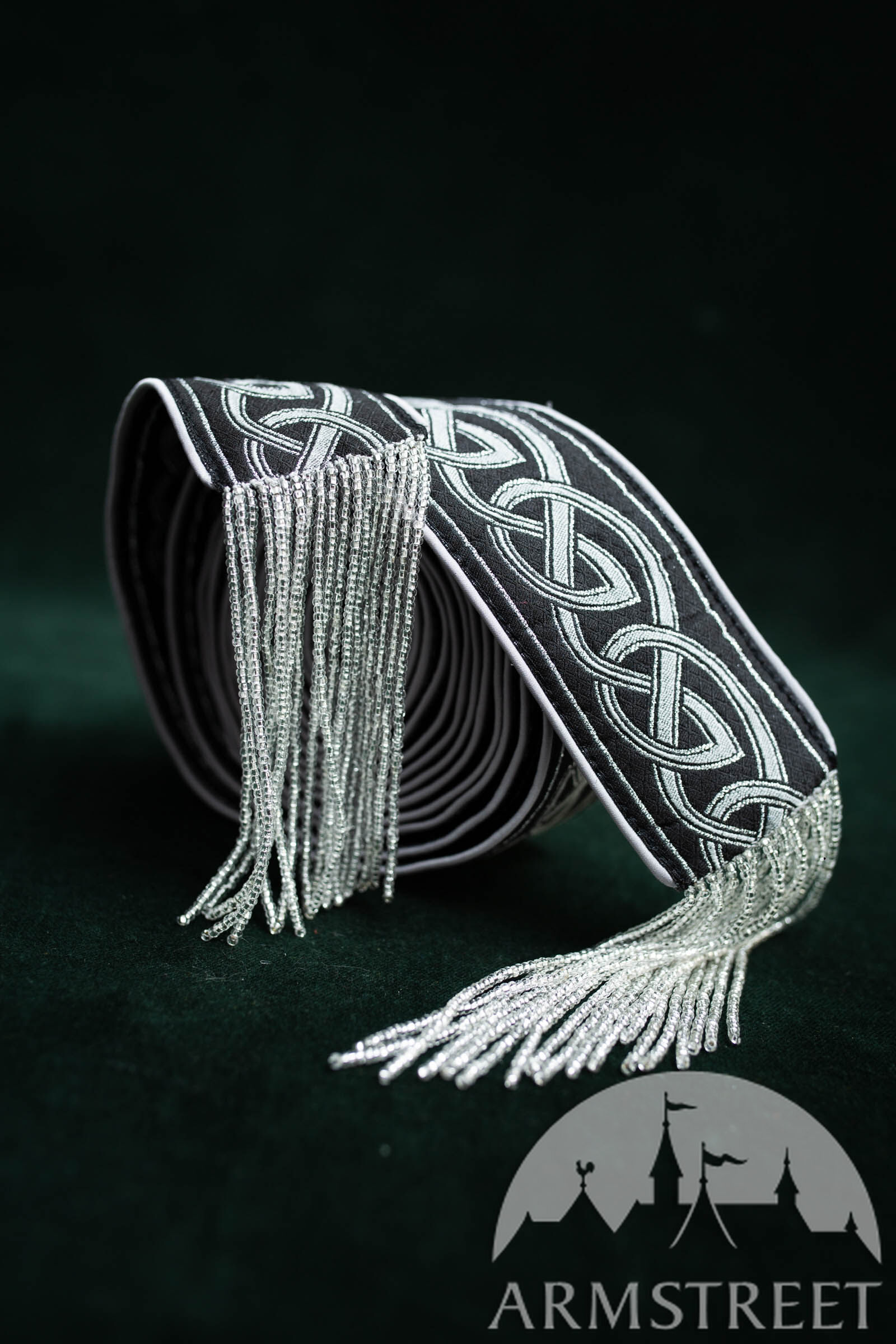 Dieses Modell ist besonders schick, breit (5 cm) und lang. Er ist beidseitig mit einer Borte verziert, was ihn sehr vielseitig macht, und verfügt über tolle Details wie Perlenfransen und eine Kordelverzierung am Rand, die die Kanten voluminöser wirken lässt und Stil und Qualität unterstreicht. Insgesamt ein perfekt universeller Gürtel, der als raffiniertes Accessoire dient und Ihrem Outfit Tiefe verleiht.