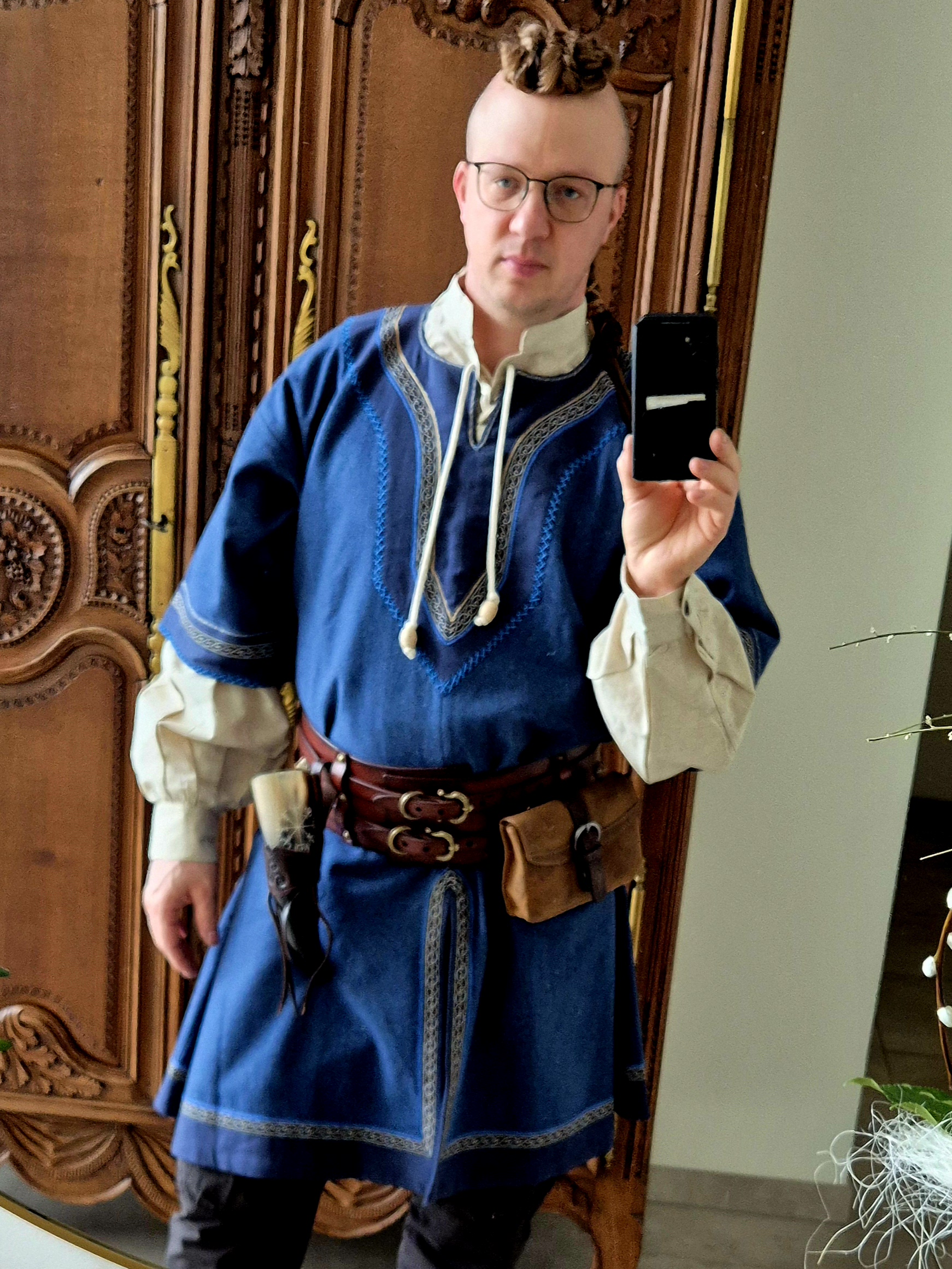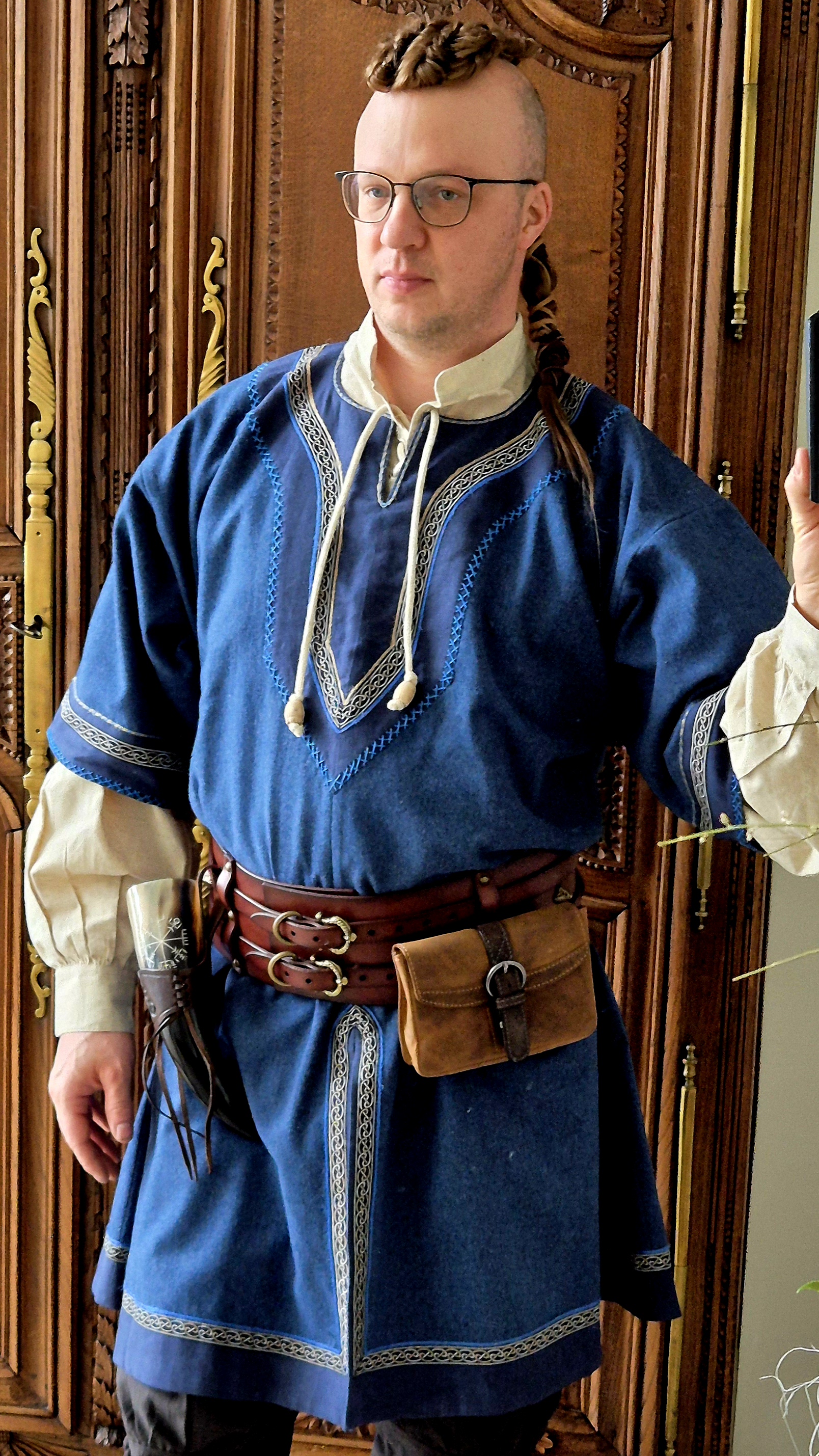 This is real comfortable and I really liked the colour of the green wool with the blue and yellow. Goes great with a leather belt or sash with an undershirt.