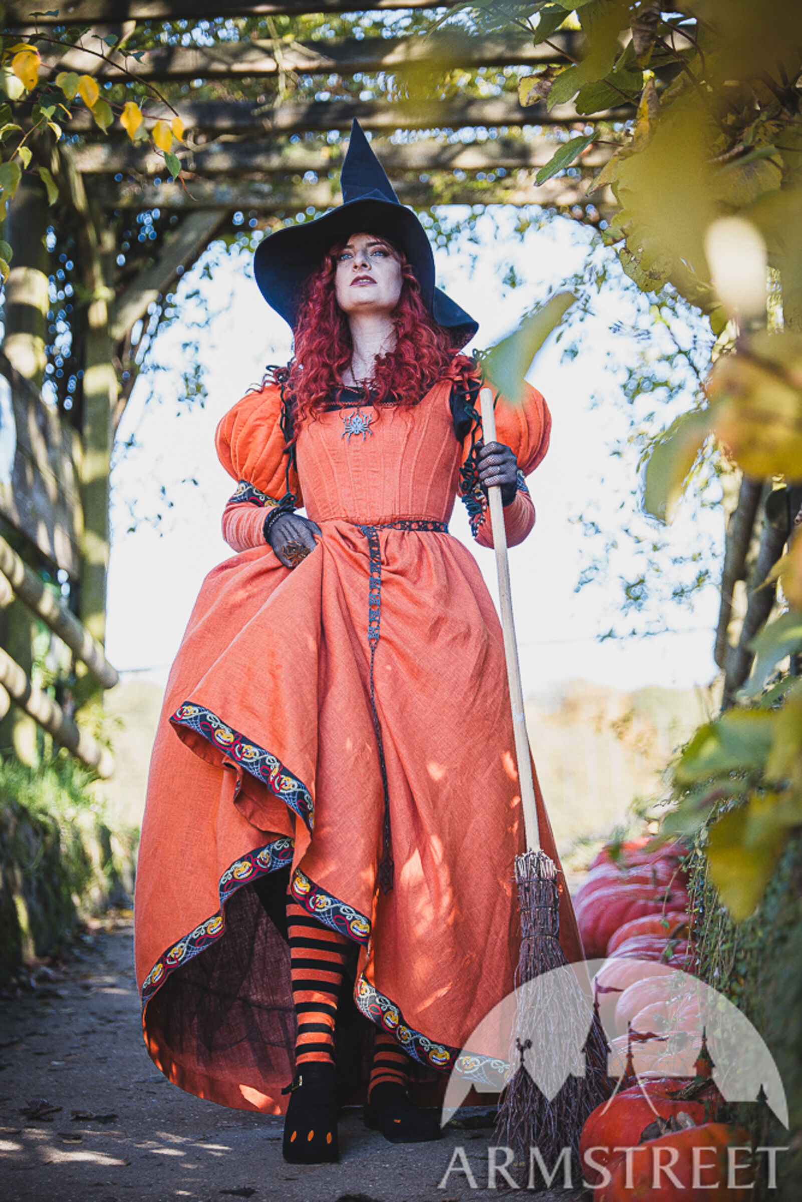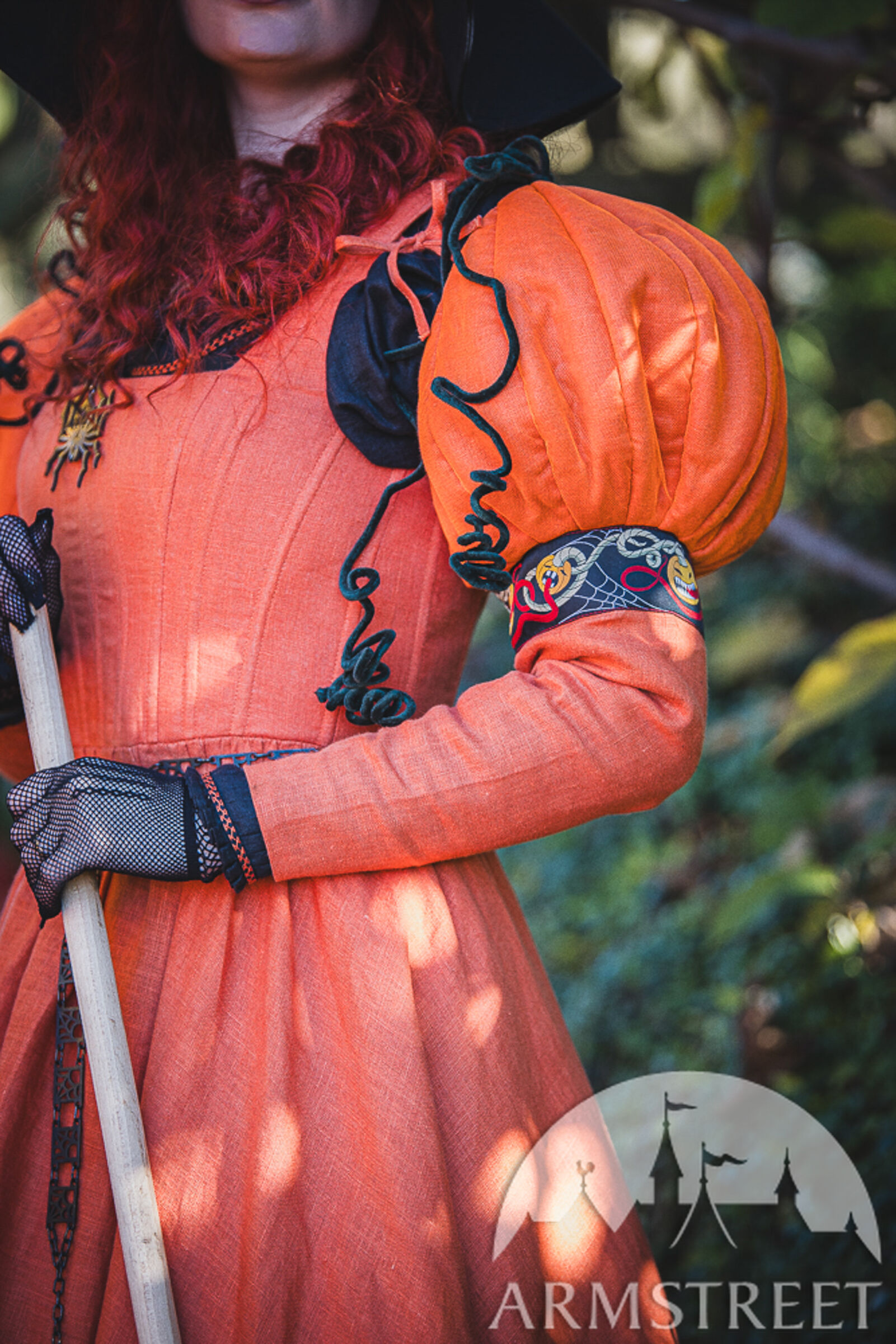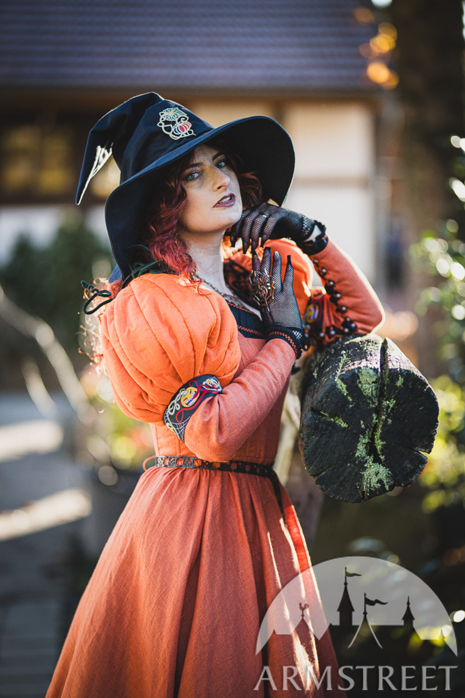 Dieses hübsche und fröhliche Hexenkleid besticht durch seine bauschigen, kürbisförmigen Ärmel. Diese textilen Meisterwerke sind mit Schnürungen an dem korsettierten Kleid im Kittelstil befestigt. Die mittleren Samtschnüre ahmen den grünen Stiel nach und sind mit einem Draht verstärkt, der die Spiralform erhält. Die beiden anderen Schnürungen sind aus Leinen gefertigt und farblich auf das Kleid abgestimmt, wodurch ein harmonisches Gesamtbild entsteht. Die innere Struktur der Kürbisse vereint verschiedene Materialien und Techniken und ist das Ergebnis wochenlanger Entwicklungsarbeit unserer Abteilung – alles für eine dauerhafte Formstabilität.