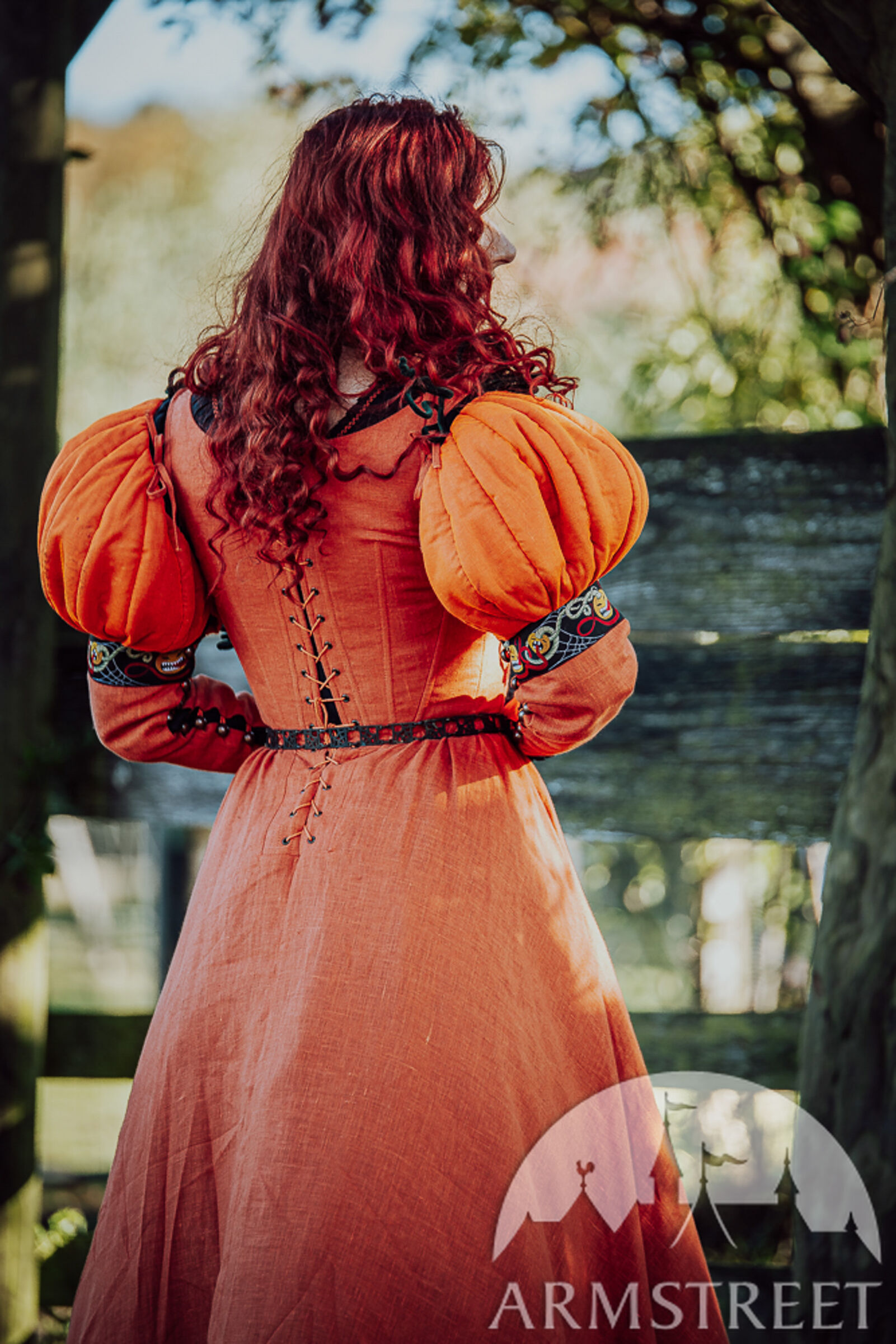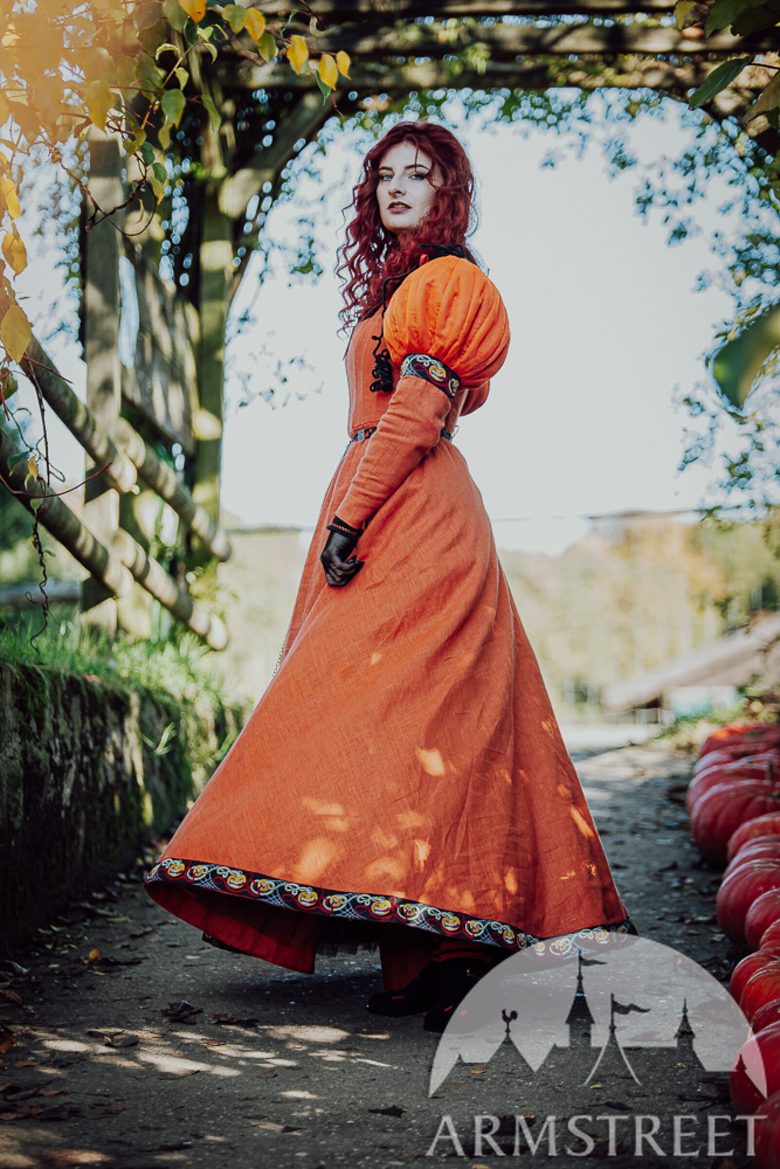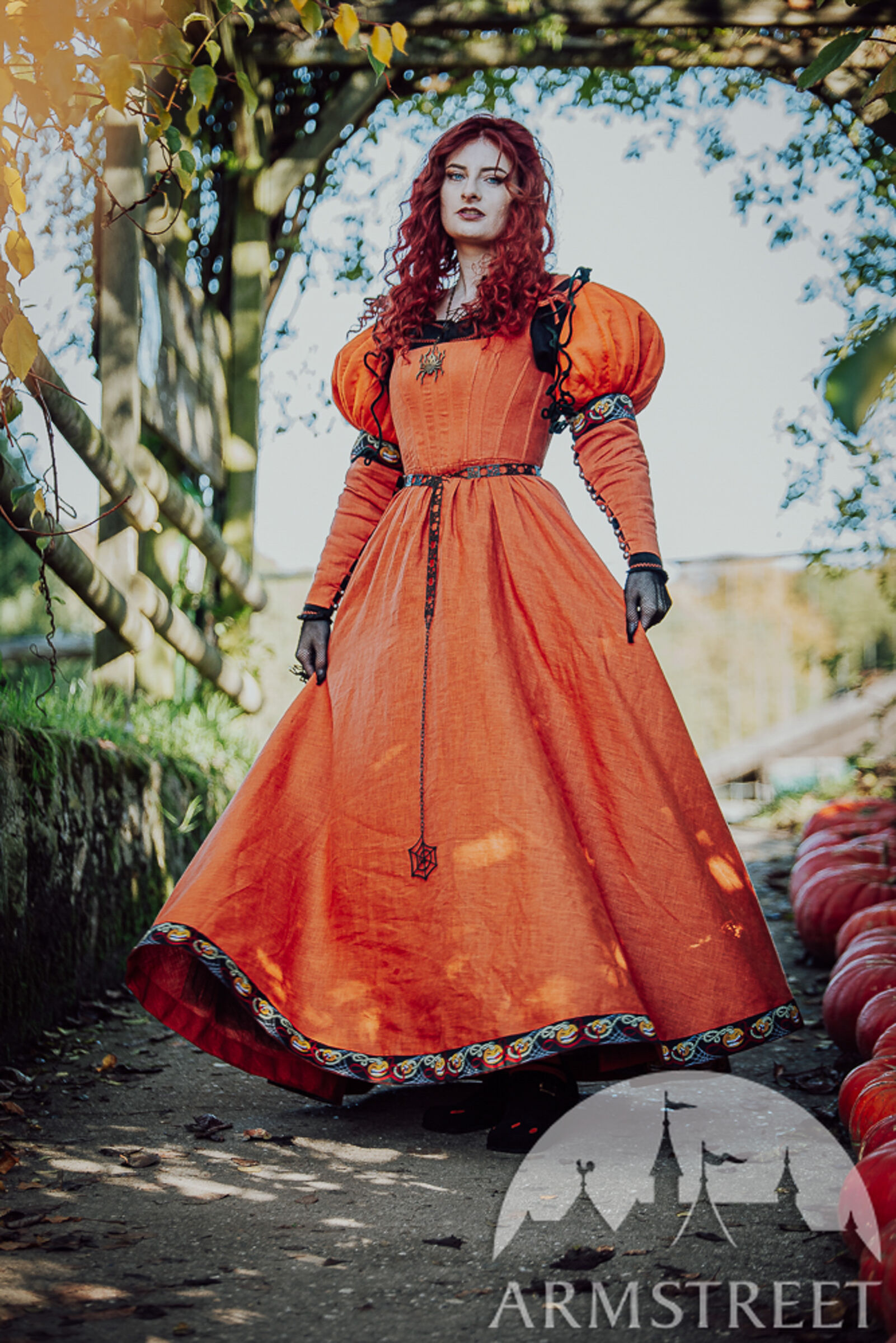 Die Silhouette des Kleides wird unseren Kundinnen dank der Serie „Deutsche Rose” vertraut vorkommen: Innenliegende Kunststoffstäbchen und eine Schnürung im Rücken sorgen für optimale Passform, ein langer, weit schwingender Leinenrock und eine einzigartige, eigens entwickelte Kürbisborte. Ärmel und Oberteil sind mit feinem schwarzem Kaliko gefüttert.