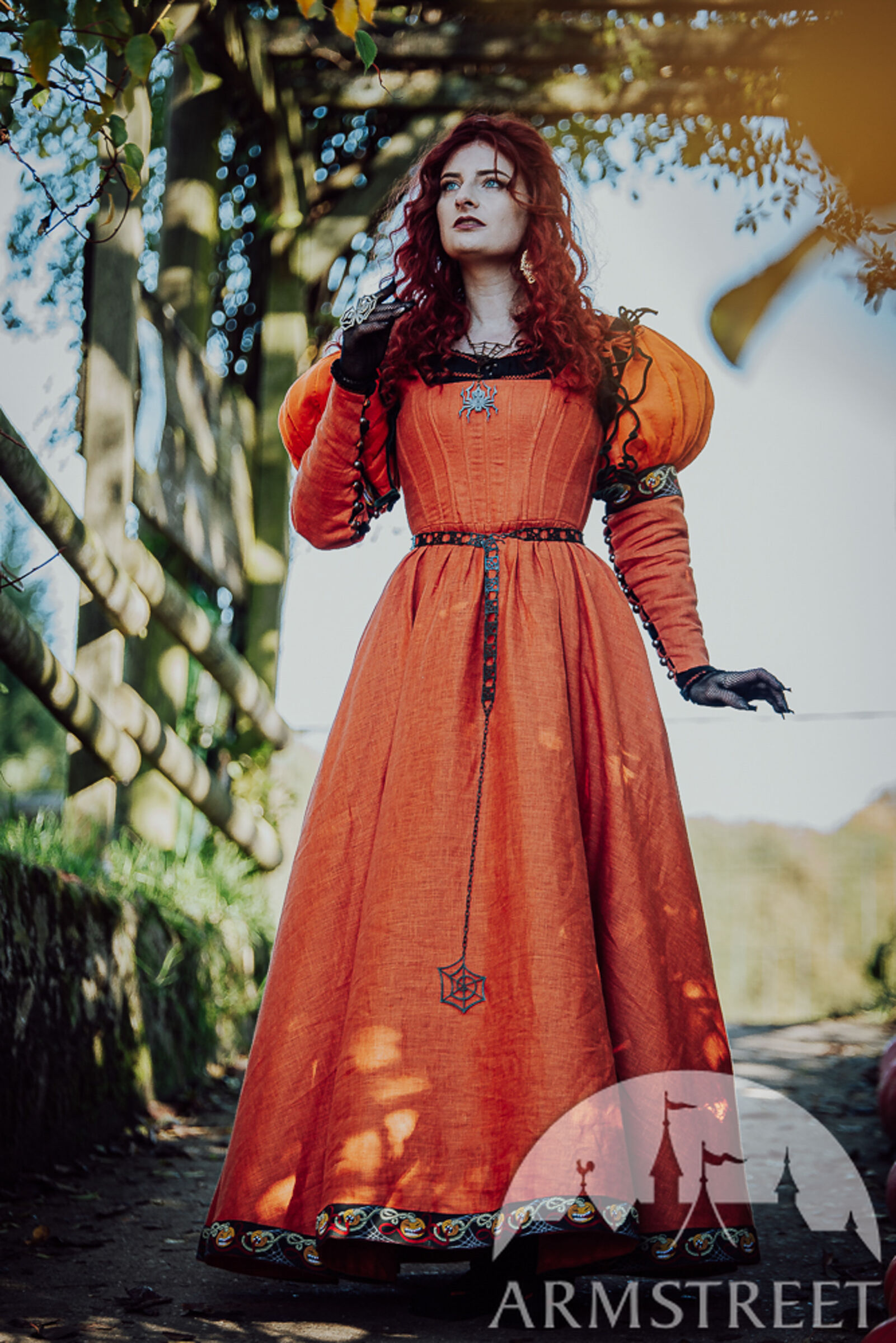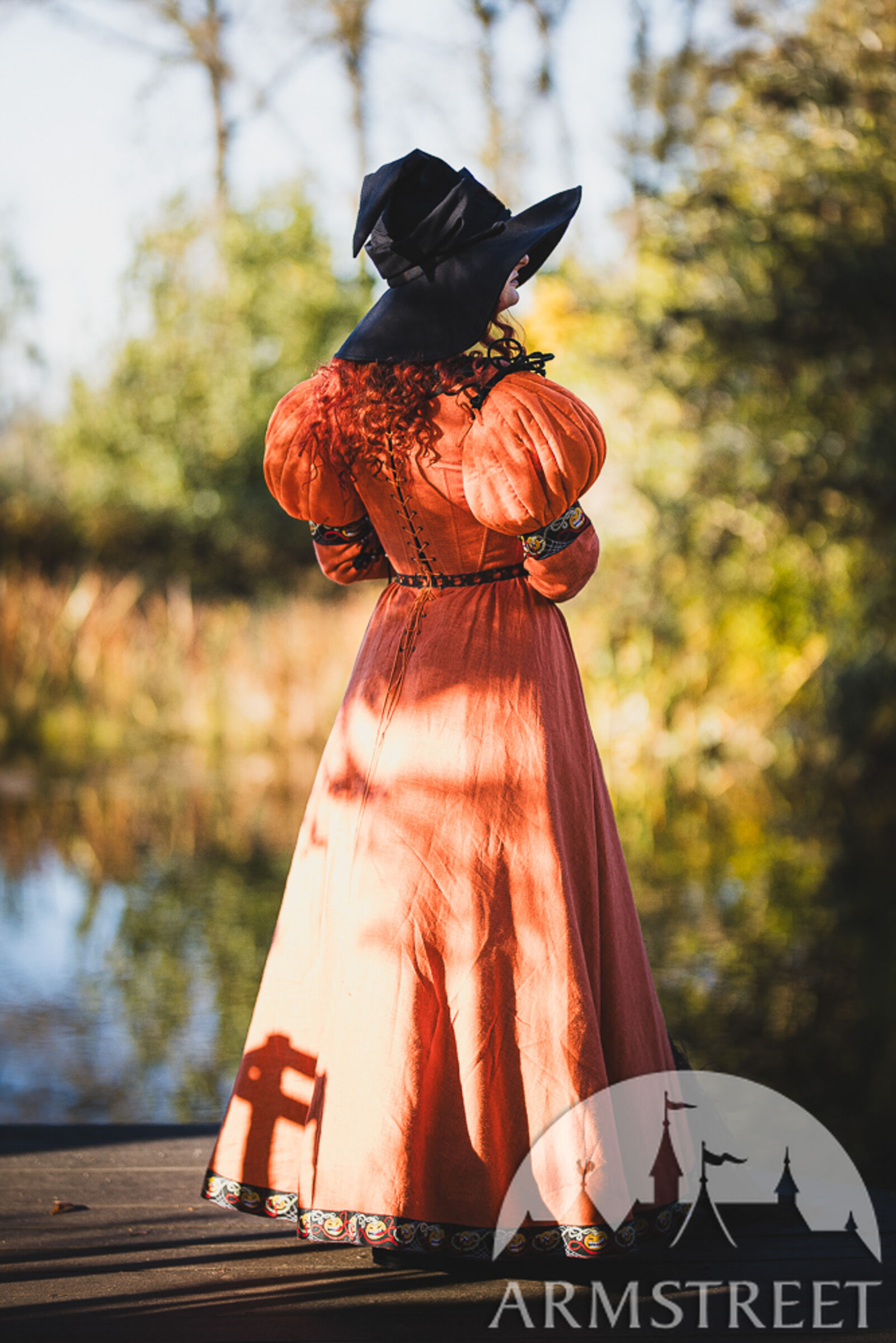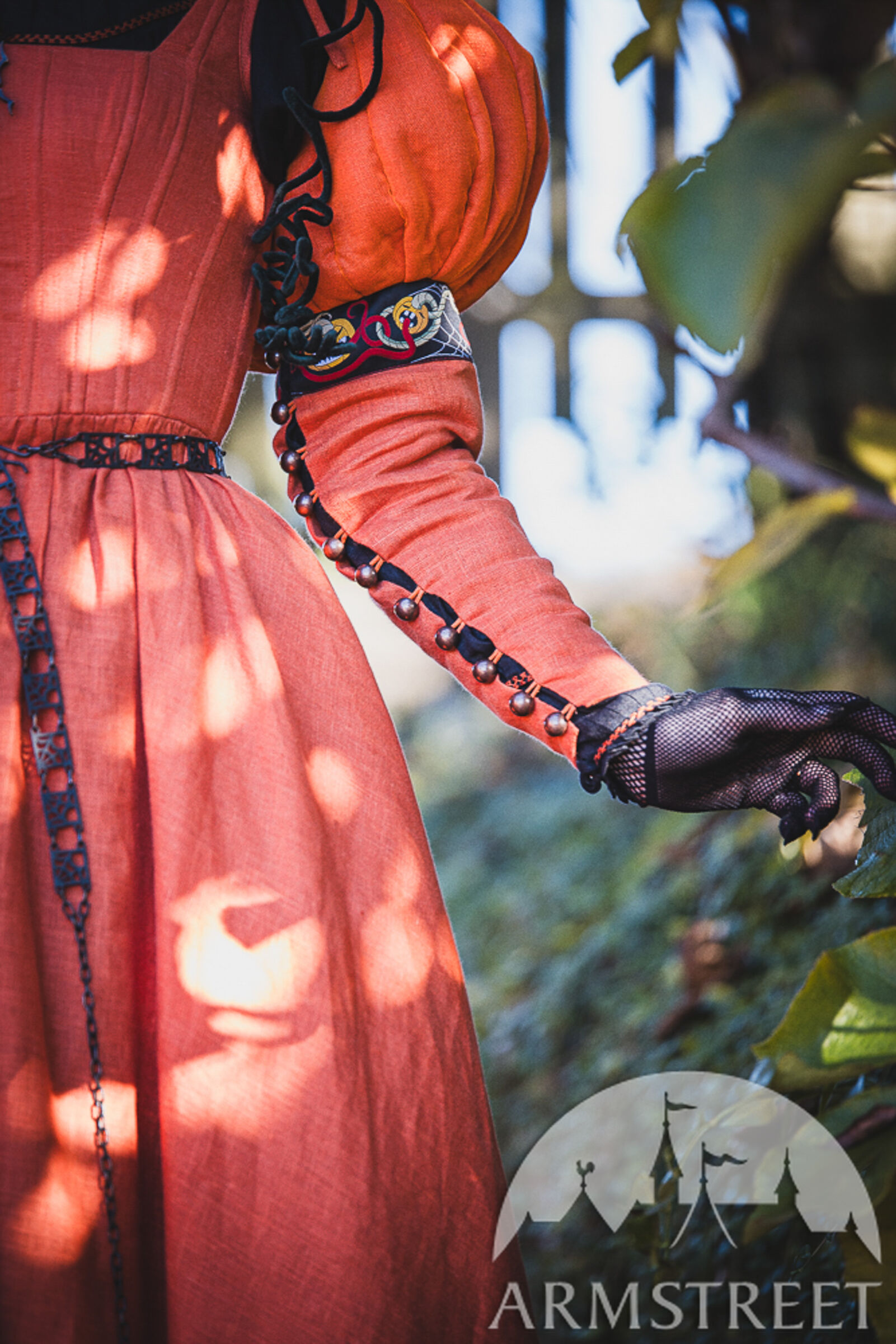 Die Silhouette des Kleides wird unseren Kundinnen dank der Serie „Deutsche Rose” vertraut vorkommen: Innenliegende Kunststoffstäbchen und eine Schnürung im Rücken sorgen für optimale Passform, ein langer, weit schwingender Leinenrock und eine einzigartige, eigens entwickelte Kürbisborte. Ärmel und Oberteil sind mit feinem schwarzem Kaliko gefüttert.
