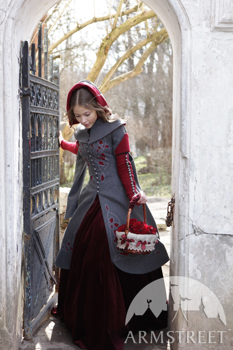 Der an den Hüften geraffte, weite Rock entspricht in hohem Maß den Märchen-Illustrationen – er erinnert an den Stil des Barock wie auch des Rokoko. Zusammen mit den reichen und eindrucksvollen Mustern und Ornamenten ist dies ein typisches Kostüm der spätmittelalterlichen Periode!