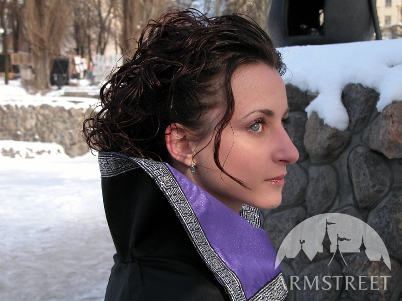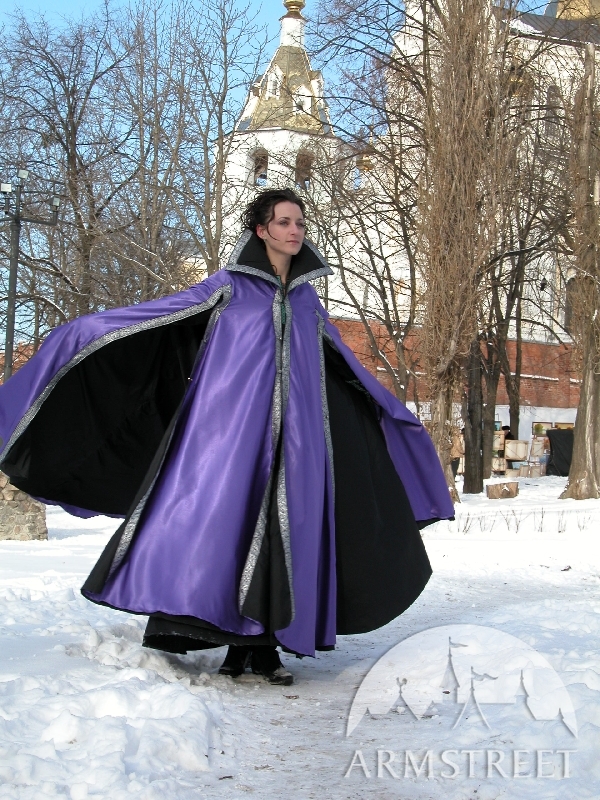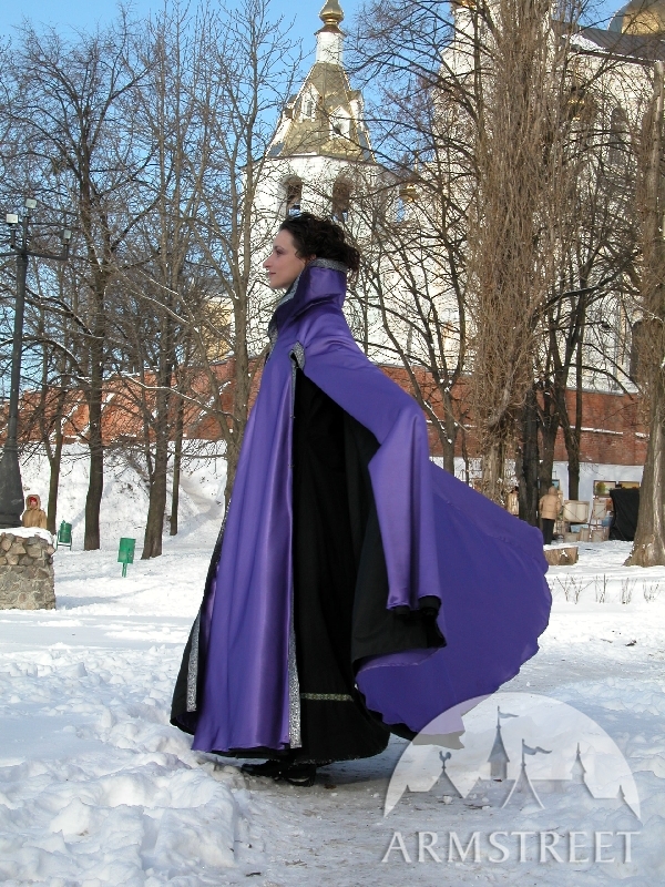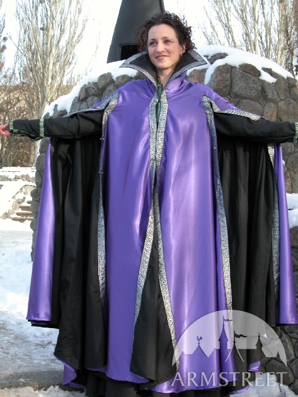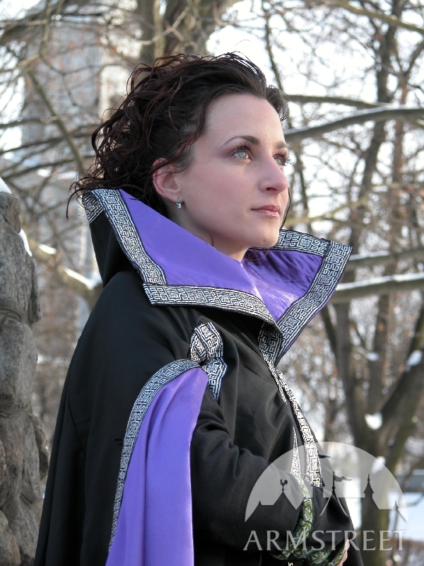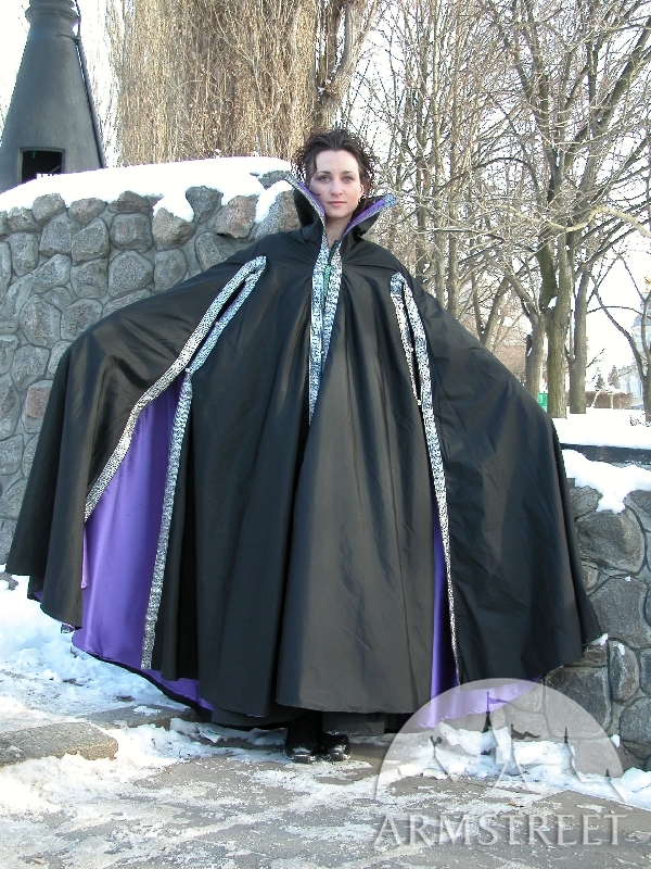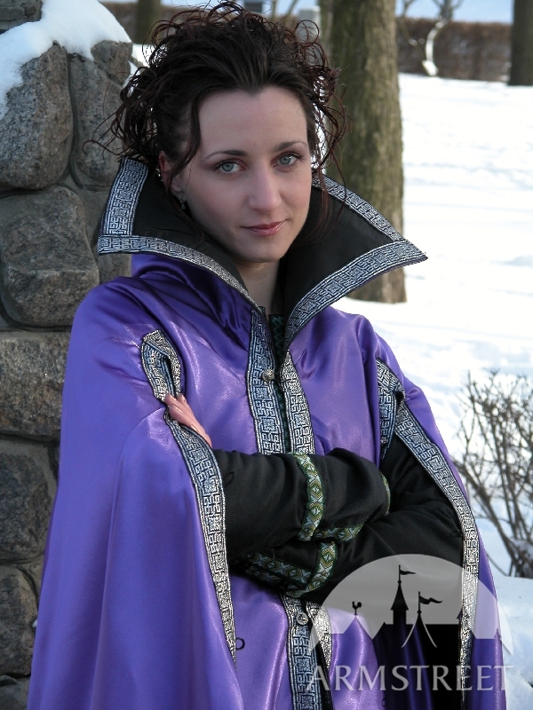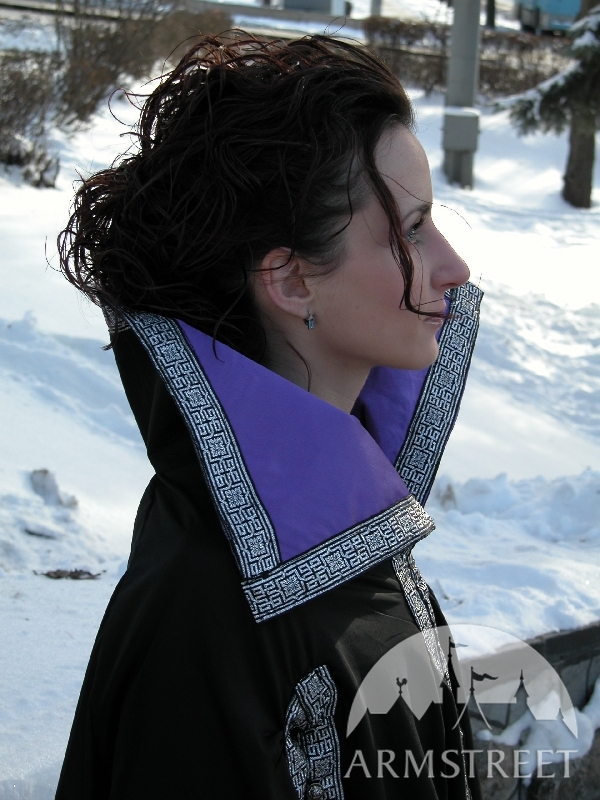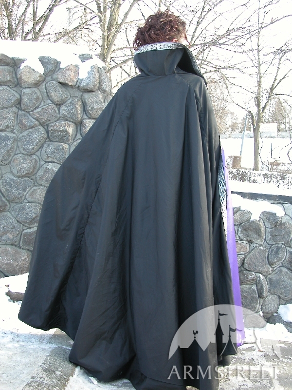 Der mittelalter Umhang wird aus wasserdichtem schwarzem Synthetikstoff mit Satin-Futter hergestellt. Die Farbe des Satins kann auf Ihre persönlichen Wünschen abgestimmt werden. Der Umhang ist völlig Wasser undurchlässig. Er ist mit schönen, dekorativen Knöpfen und Bordüren verziert. Der Stehkragen kann auch schmaler (empfohlen für Herren) angefertigt werden.