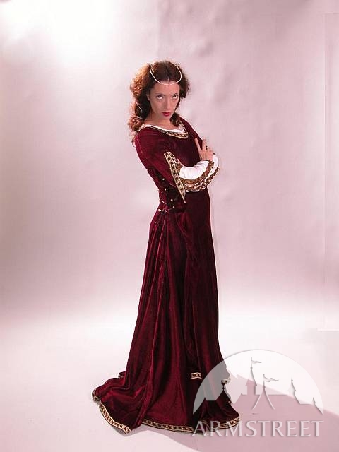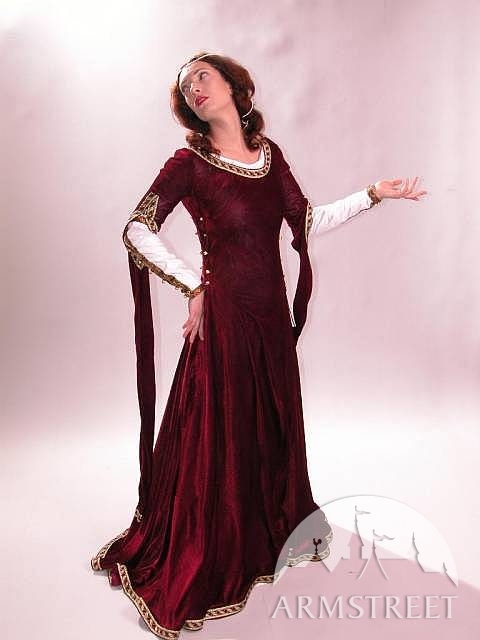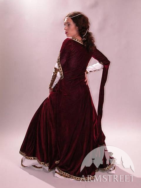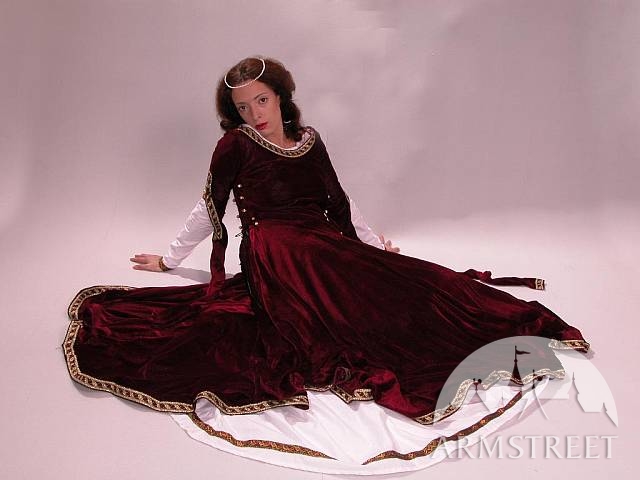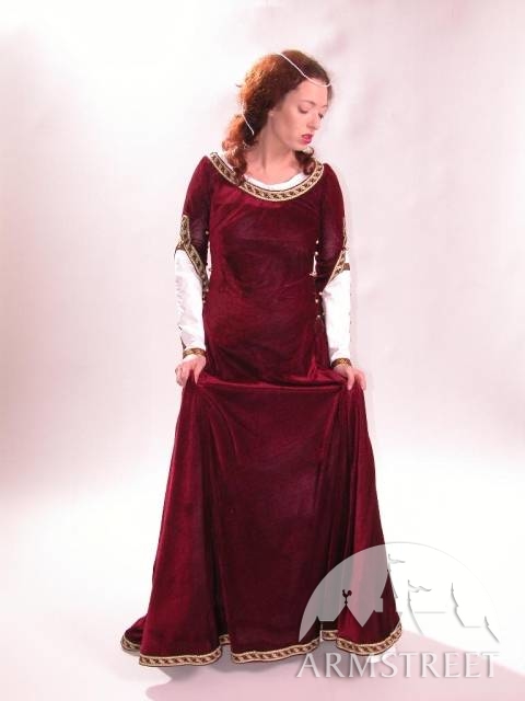 Dieses edle, mittelalter Kleid besteht aus zwei Teilen. Das Oberteil ist aus Samt gefertigt, mit goldenen Bordüren und goldenen Knöpfen verziert. Die Chemise ist aus reinem weisem Batist hergestellt. In unseren Shop können Sie die mittelalter Tunika auch ohne Oberteil erwerben.