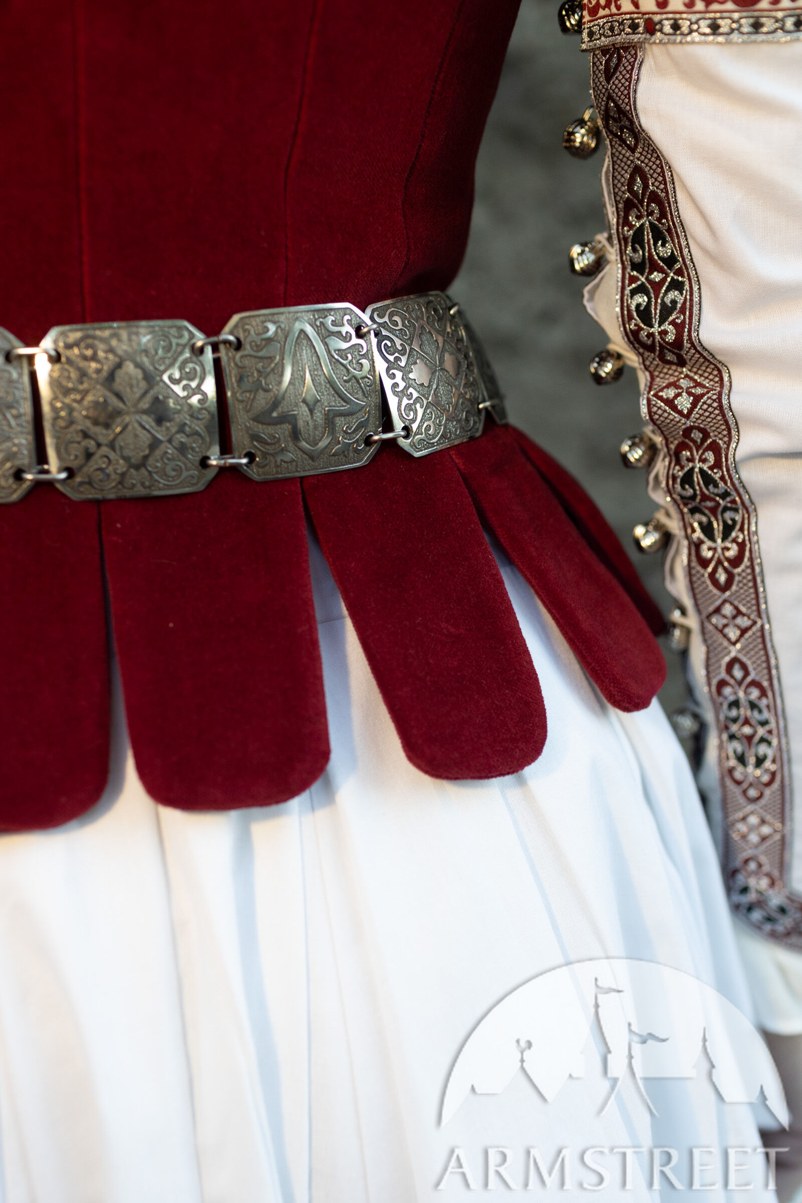 Dieses elegante Stück hat einen unnachahmlichen Charme zu jeder Kleidung, die damit getragen wird. Ein moderates Farbspiel von hochwertigem italienischem Samt ist in reizvollem Kontrast zum stumpfmatten Stoff des Kleides. Die Weste im Gegensatz zu einem Korsett hat keine Korsettstäbchen - das gibt Ihnen eine gute Chance, leicht einzuatmen und sich frei zu bewegen. Nur der Haarstoff (Spezialgewebe) hilft dabei, die Verformung dank der festen Schnürung zu vermeiden und uin Form zu bleiben. Die Weste betont Ihre Taille; ein niedriger Stehkragen und aufwendige Gestaltung des kunstvoll geformten Joches zeigen uns die Aristokratie in dieser Prinzessin auf dem Bild. Eine V-förmige Vorderschnürung ermöglicht eine einfache Anpassung der Schnürung. Kokett gesteppte "fliegende" Ärmel und Festons tragen zur unvergleichlichen Faszination des unisex Barock-Kostüms bei.