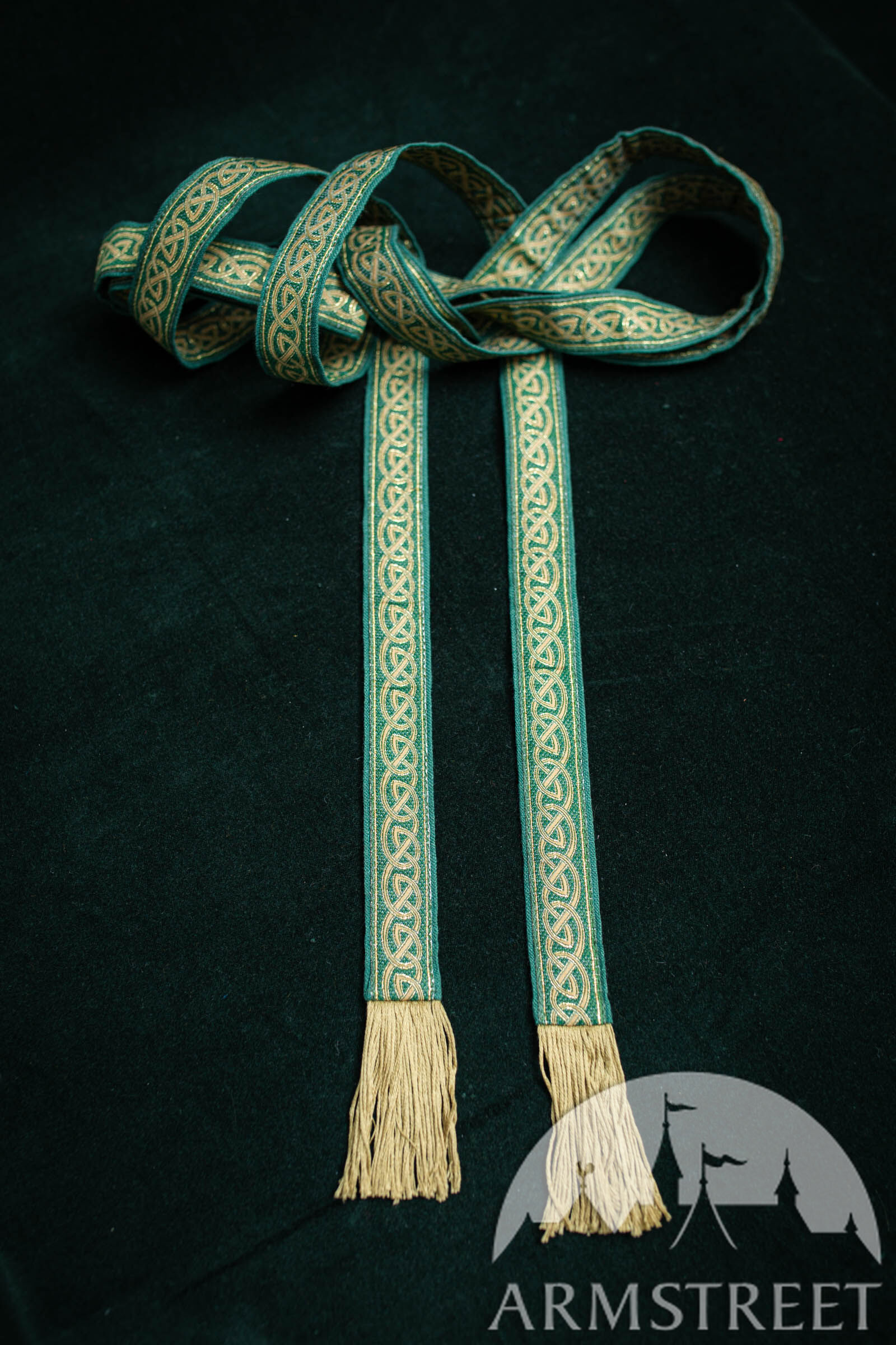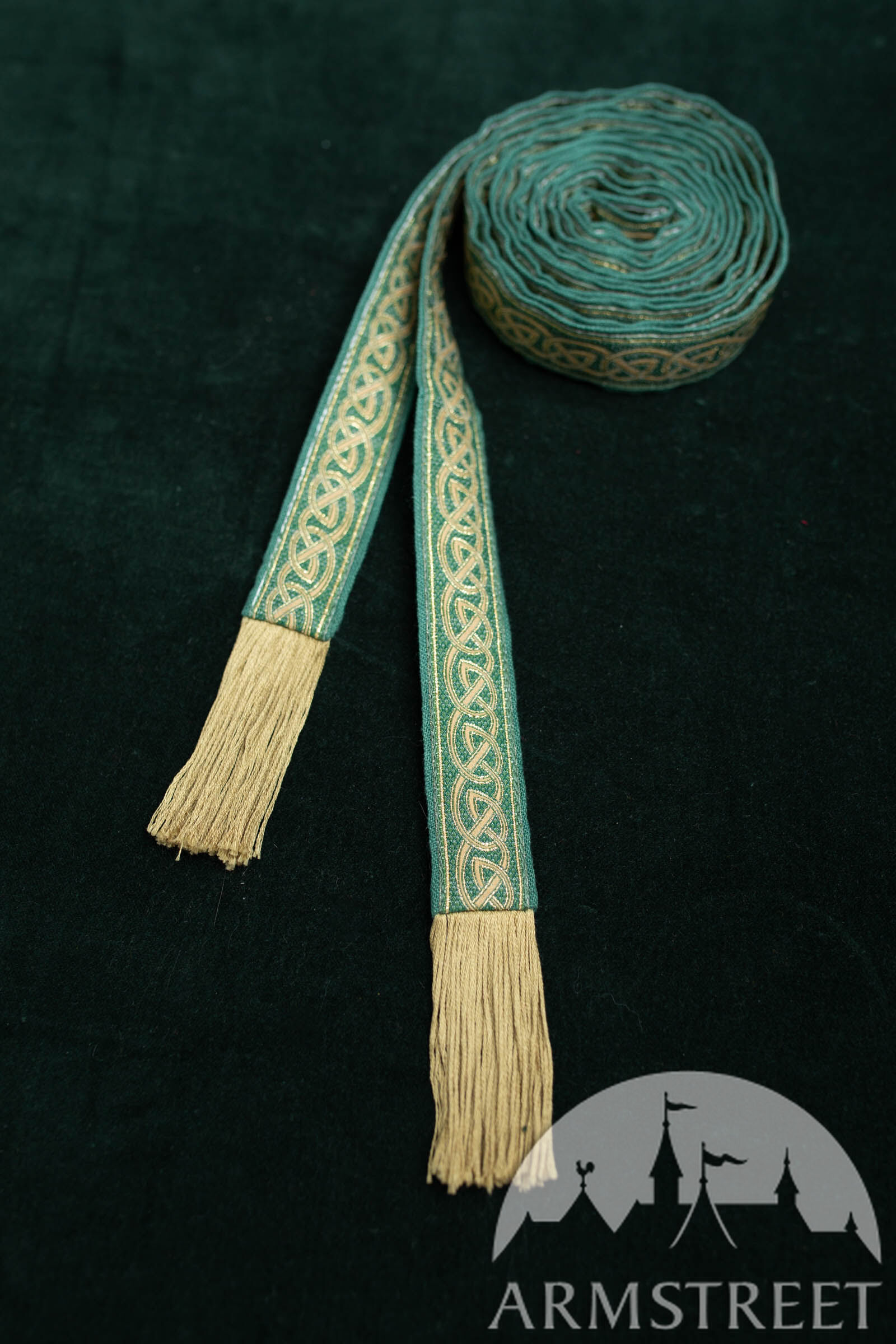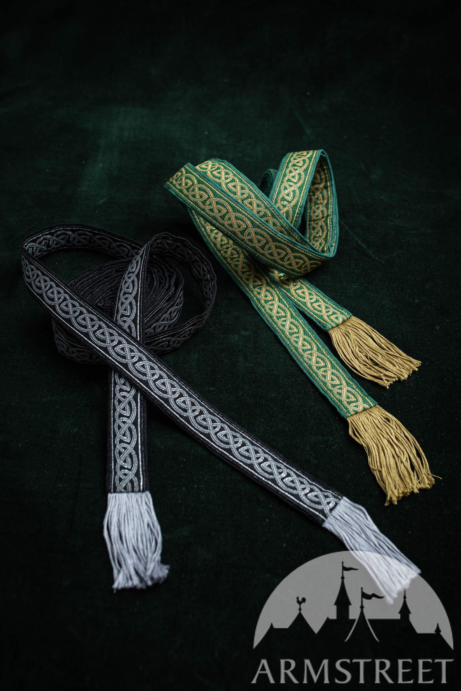 Dies ist die schmalere Variante unseres breiten keltischen Stoffgürtels – ein schöner, vielseitiger Gürtel, der Ihrem Kostüm Stil und Eleganz verleiht. Er ist mit Fransen, einem Besatz an beiden Seiten und einem Leinenrand versehen. Dieses Accessoire ist eines der vielseitigsten Teile Ihres Kostüms und kann als Haupt- oder Zweitgürtel, als temporäre Befestigung für Gegenstände oder für viele andere Zwecke verwendet werden.