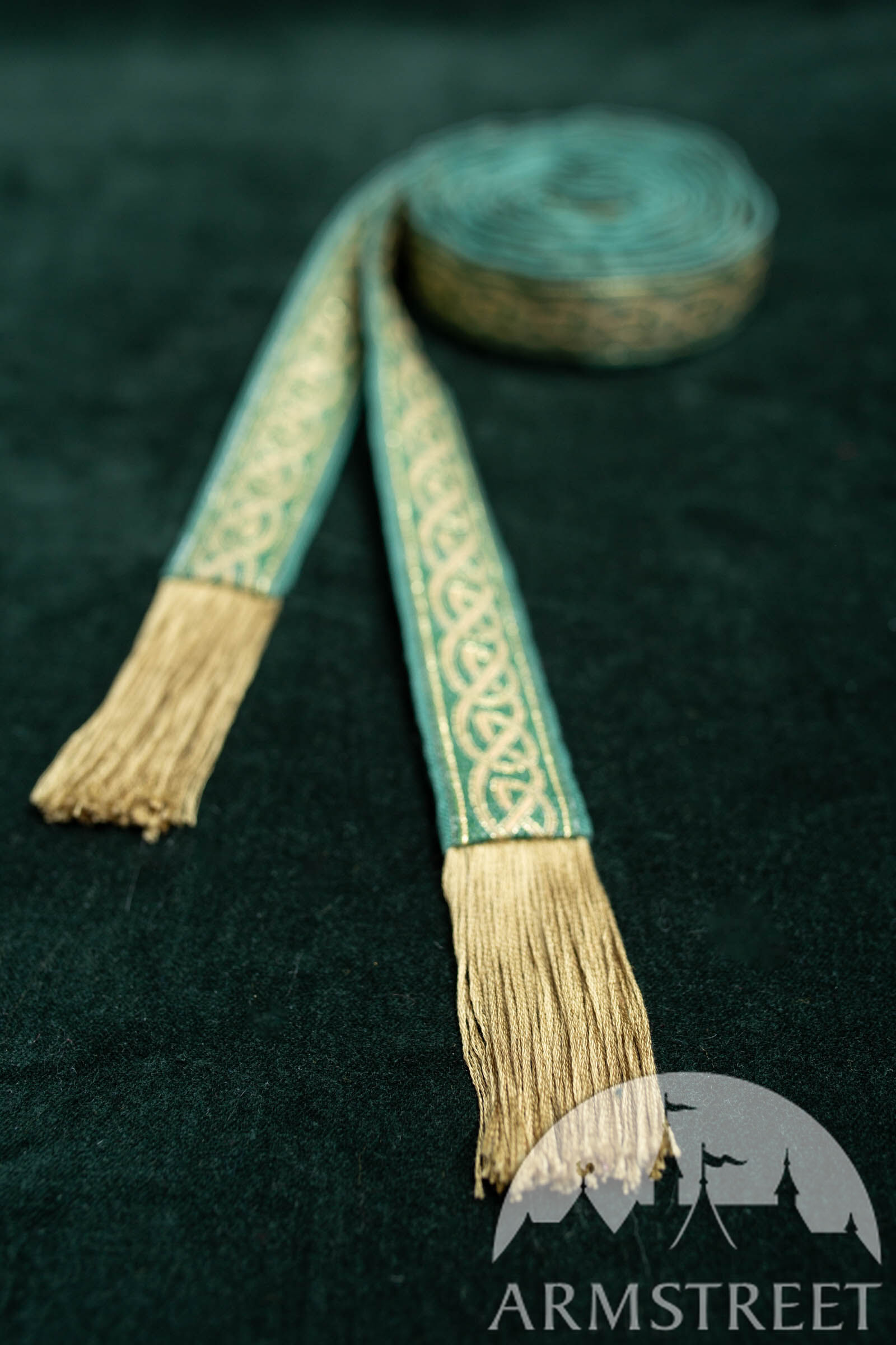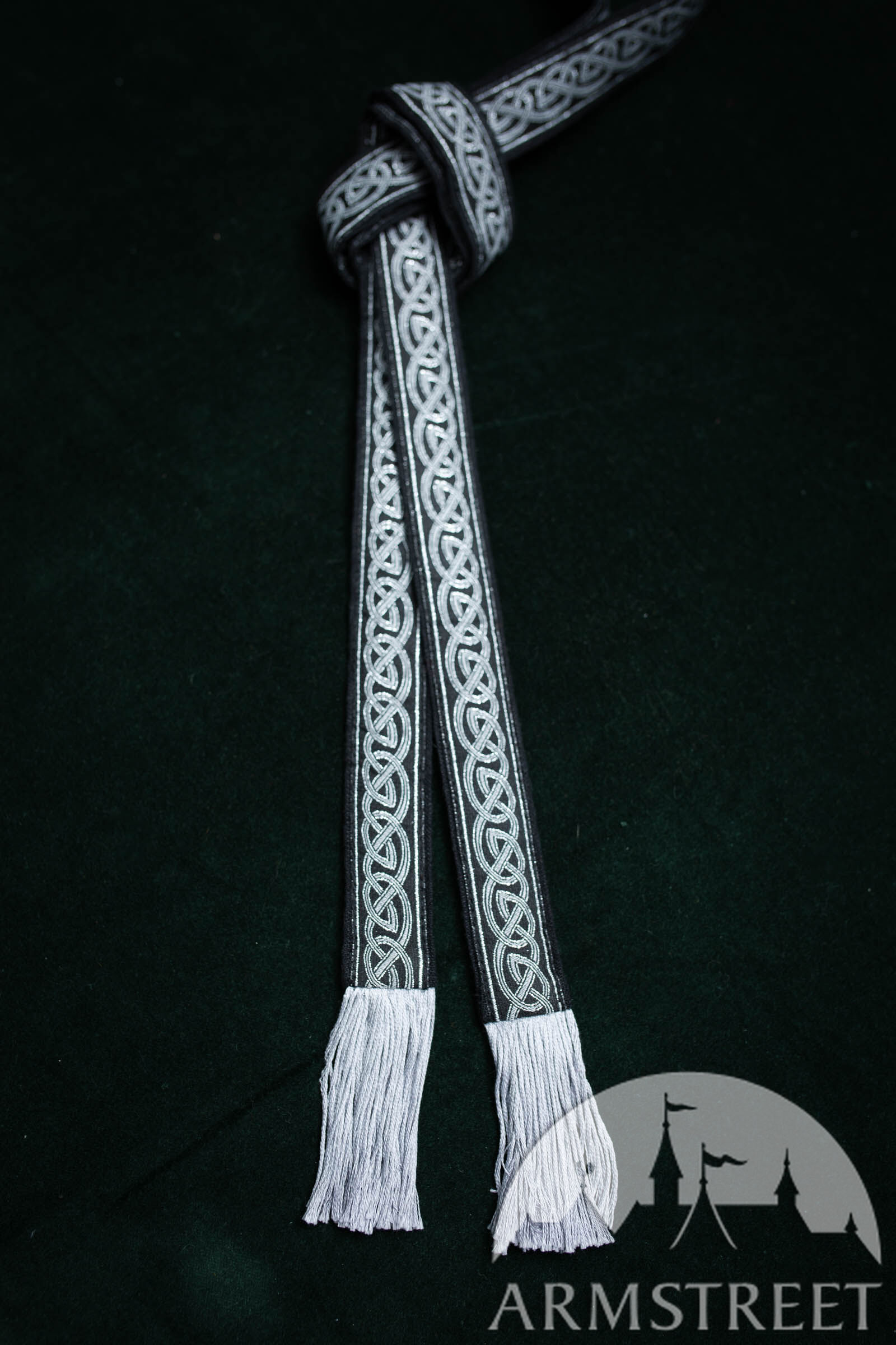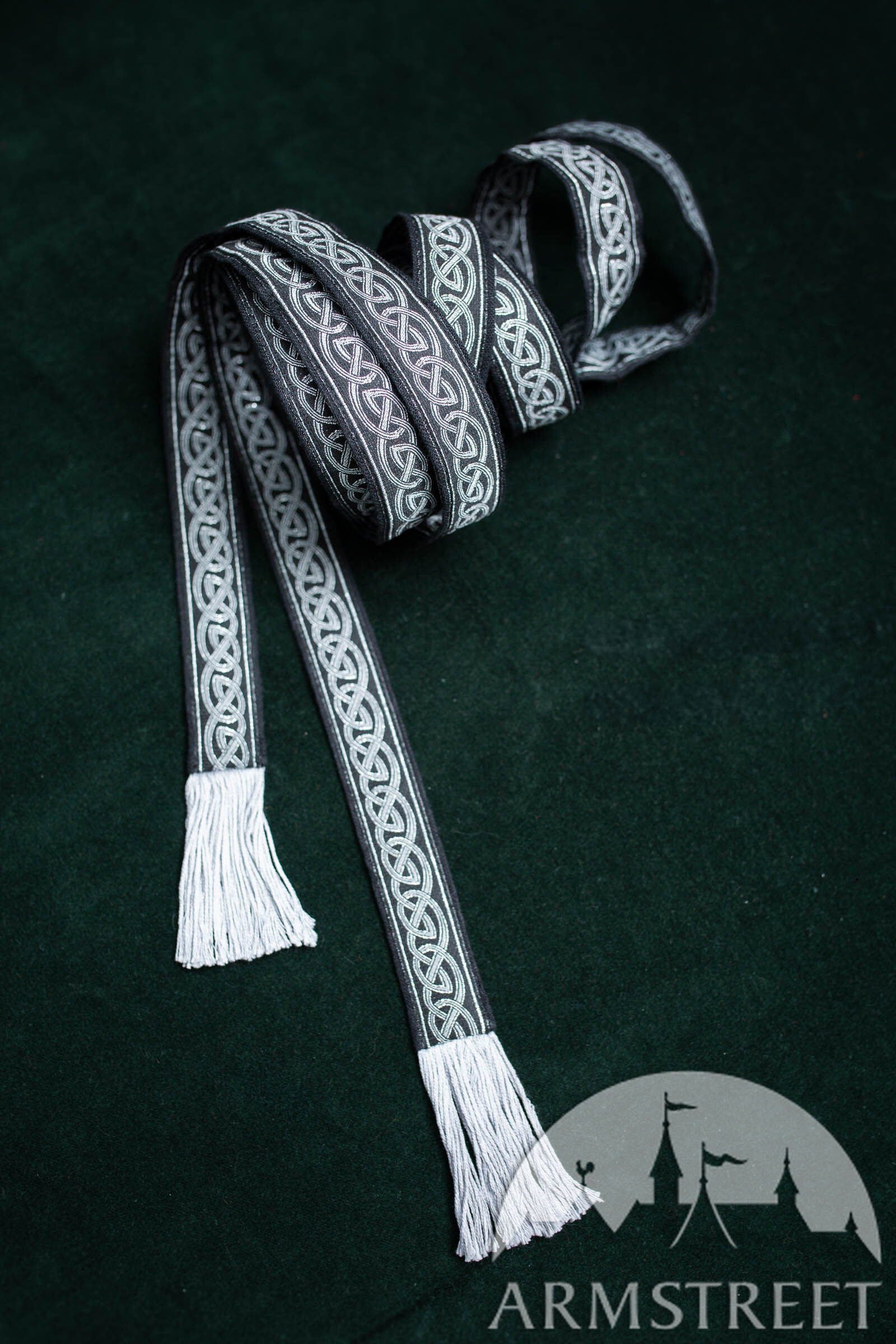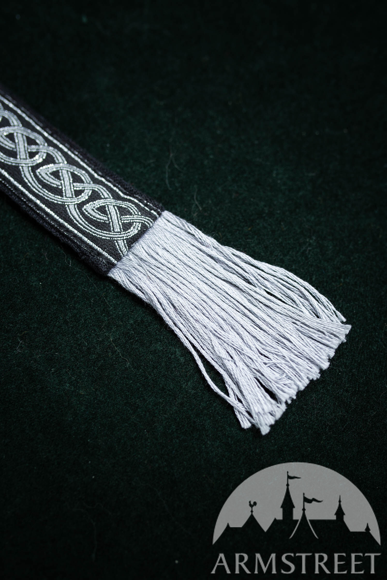 Dies ist die schmalere Variante unseres breiten keltischen Stoffgürtels – ein schöner, vielseitiger Gürtel, der Ihrem Kostüm Stil und Eleganz verleiht. Er ist mit Fransen, einem Besatz an beiden Seiten und einem Leinenrand versehen. Dieses Accessoire ist eines der vielseitigsten Teile Ihres Kostüms und kann als Haupt- oder Zweitgürtel, als temporäre Befestigung für Gegenstände oder für viele andere Zwecke verwendet werden.