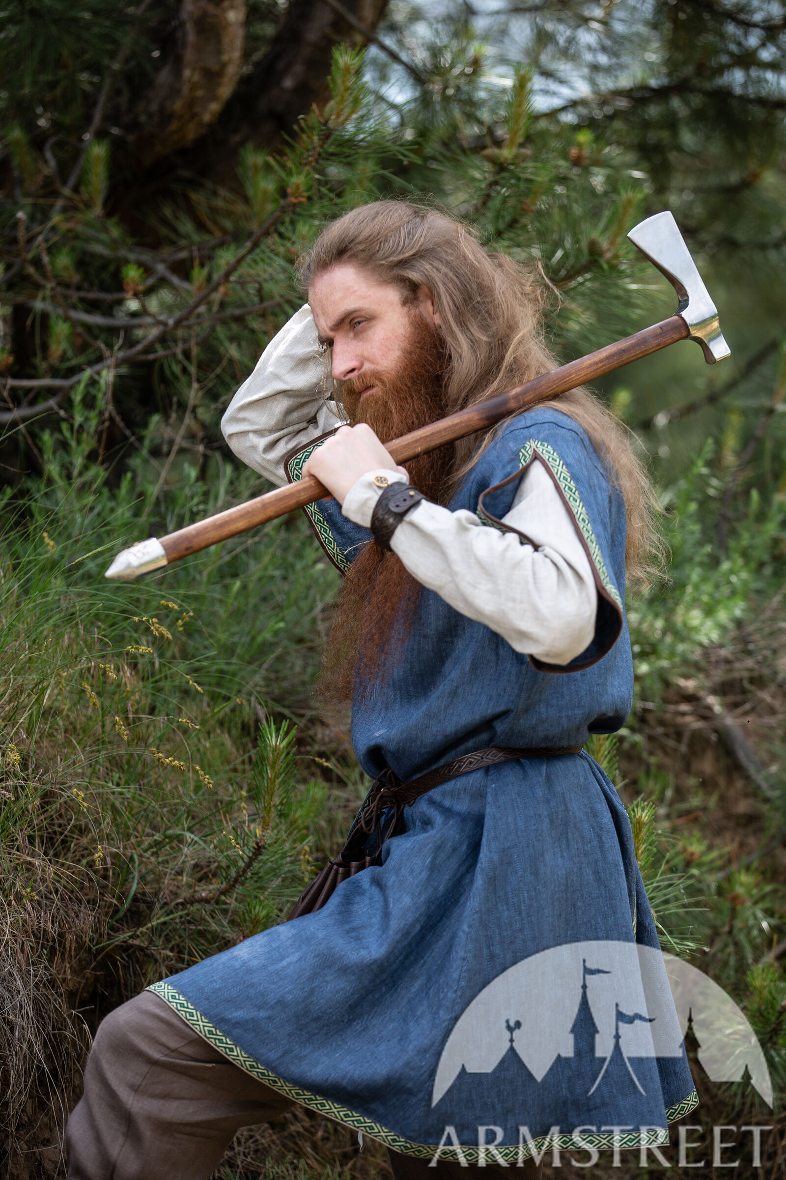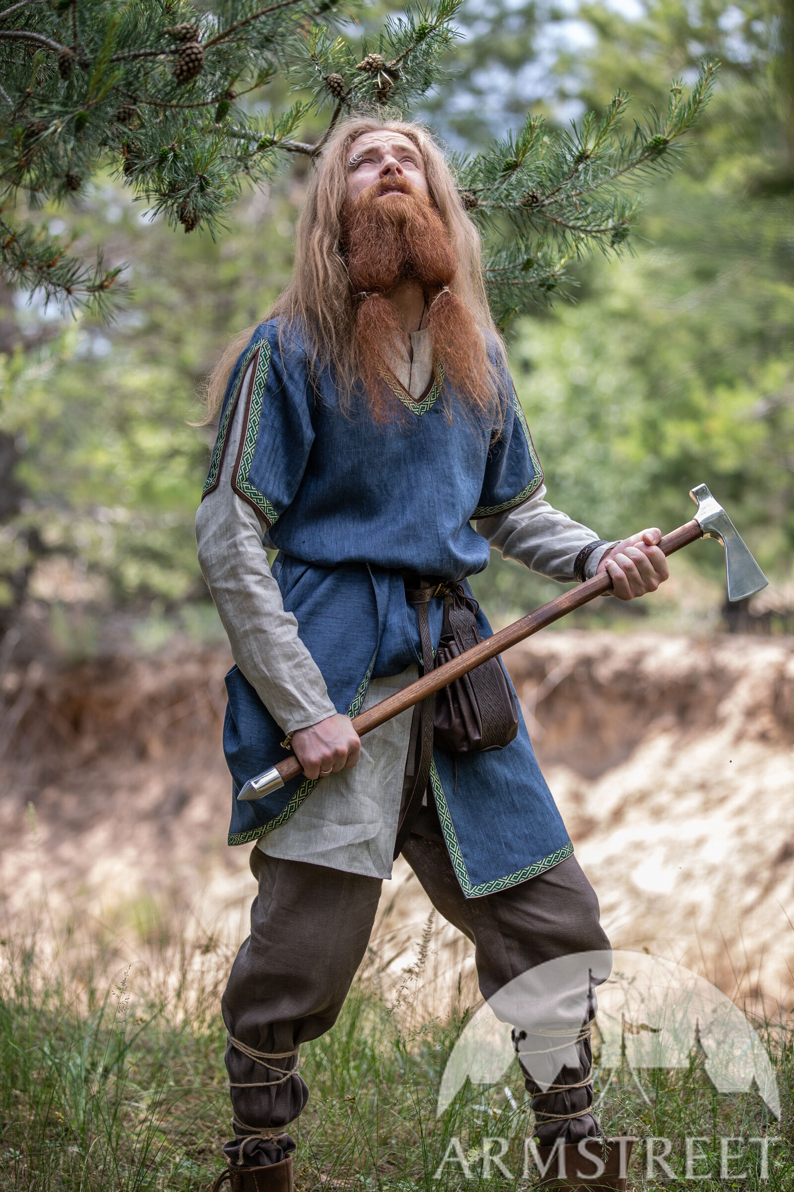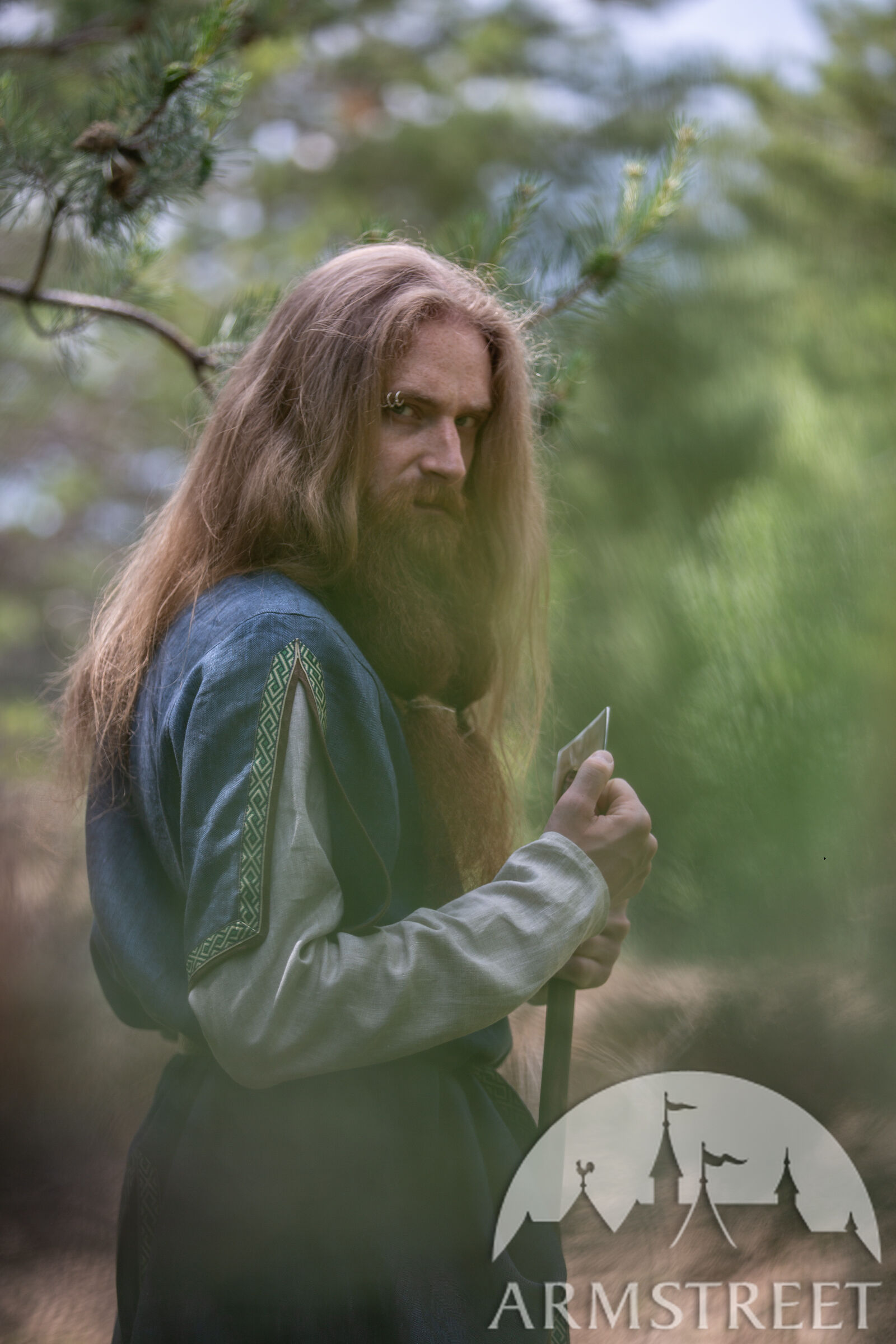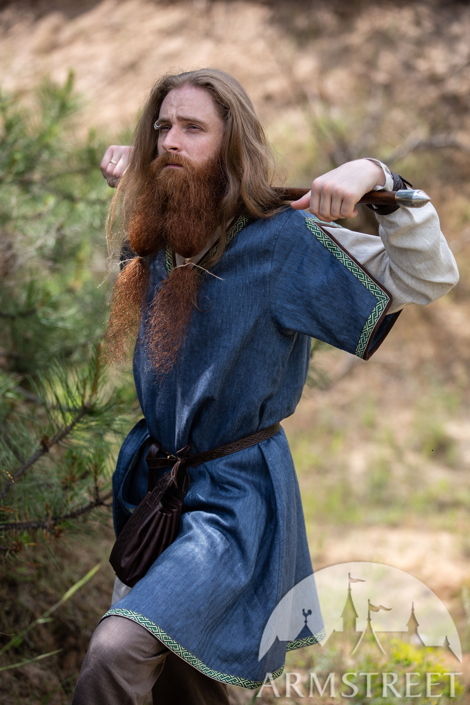 Diese Tunika zeigt sowohl den Erfolg als auch eine einfache und praktische Herangehensweise an Kleidung. Wie auch andere Stücke aus unserer Kollektion „Mittelalter Familie” setzt es nicht auf übertriebene Akzente und wir haben uns stattdessen auf klare Linien, Stoff und Qualität konzentriert. Dieses einfache Design aus dem XI.-XII. Jhdt ist in der populären Wahrnehmung sehr „mittelalterlich” und eröffnet viele Möglichkeiten in Bezug auf Charakterbildung und Veranstaltungen. Technisch handelt es sich um eine kurzärmelige Tunika mit weitem V-Ausschnitt und entspannter, aber nicht zu lockerer Silhouette. Die von uns für diese besondere Kollektion entworfene Borte imitiert das traditionelle Brettchenweben und wird durch Stoffakzente unterstützt, die ein kontrastierendes Element des Designs sein könnten.