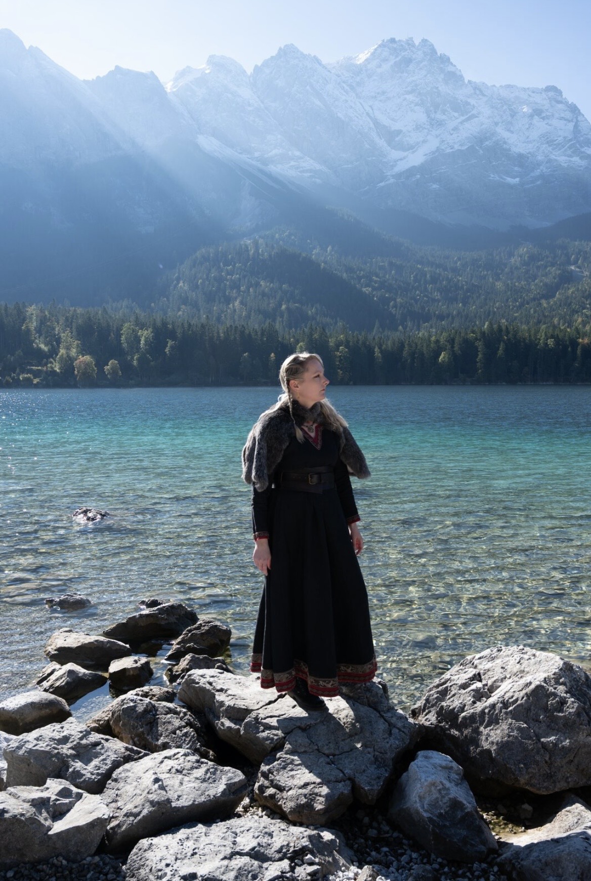Das kann man auch in unserem Design bemerken. Der Hals und die Ärmel sind mit einem kontrastierenden Leinen und einer schmalen Borte mit einem traditionellen skandinavischen Ornament verziert. Unten am Saum gibt es auch zwei Borten, die speziell für dieses Kostüm entworfen wurden, auch kontrastreiche Stoffe und eine gefärbte und Jute-Kordel verziert.