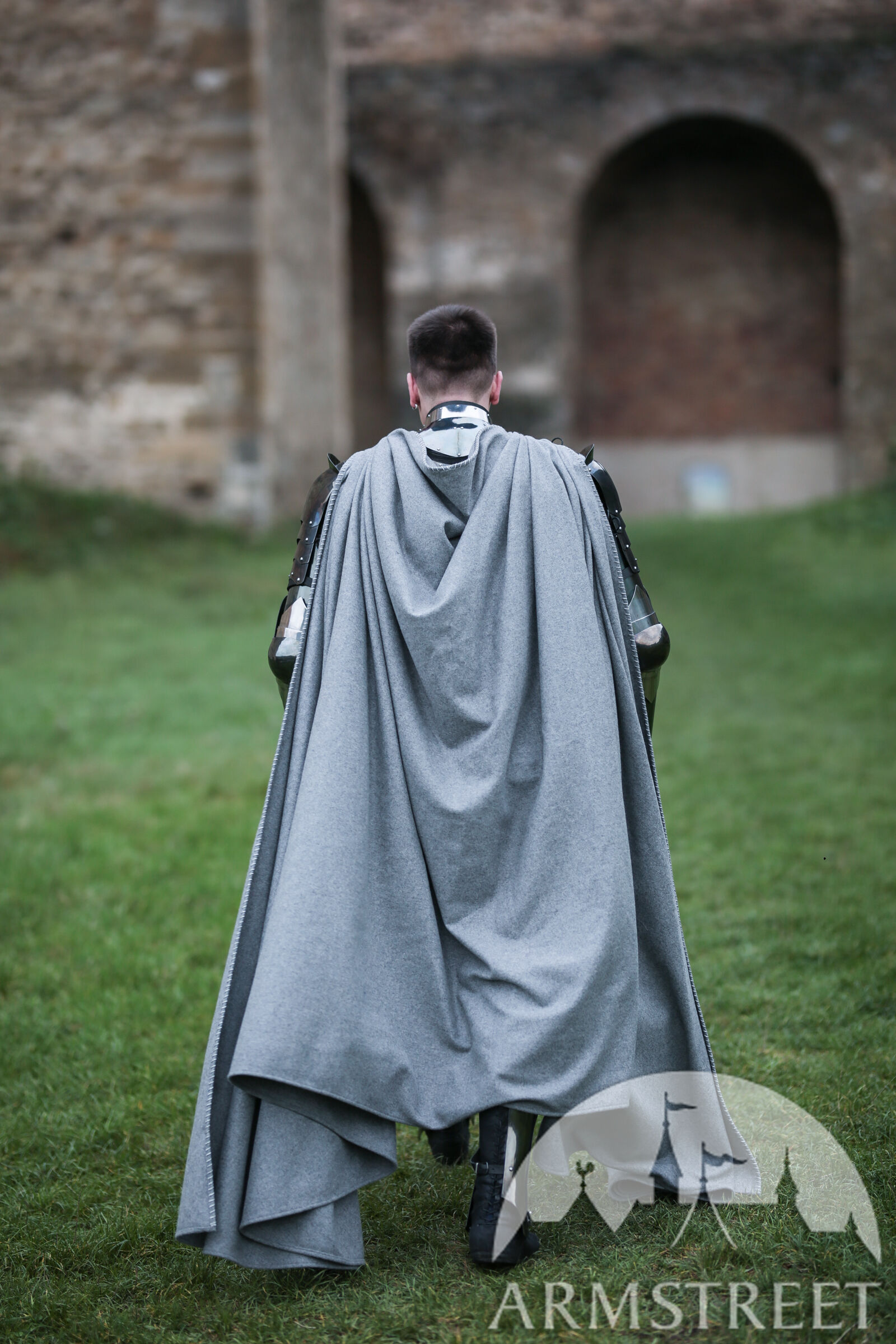 Der Umhang wird mit Hilfe von zwei starken Lederschlaufen, die mit Mustern aus unserer Kollektion „Dunkler Wolf” geprägt sind, an Ihrer Rüstung befestigt. Während des gesamten Stücks finden Sie feine Oberflächen und Handwerkskunst. Die Kanten sind mit dickem Silberfaden verziert und alle Nähte sind wunderschön verarbeitet.