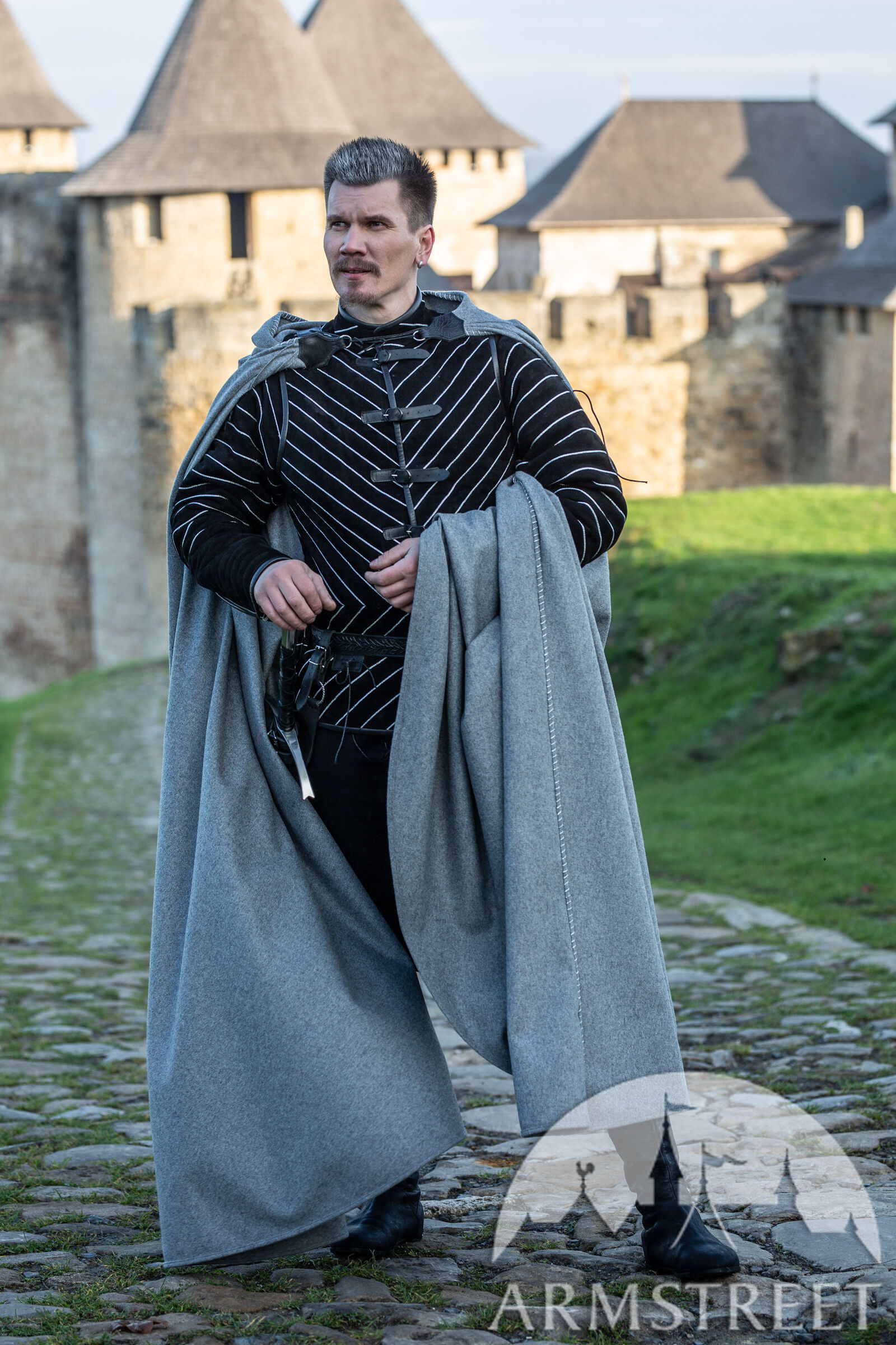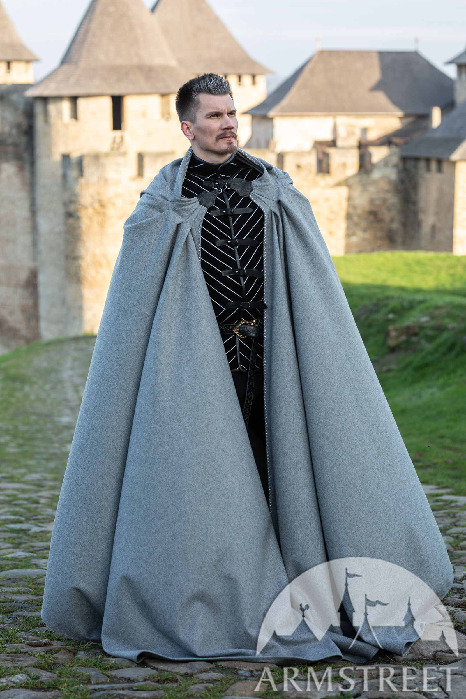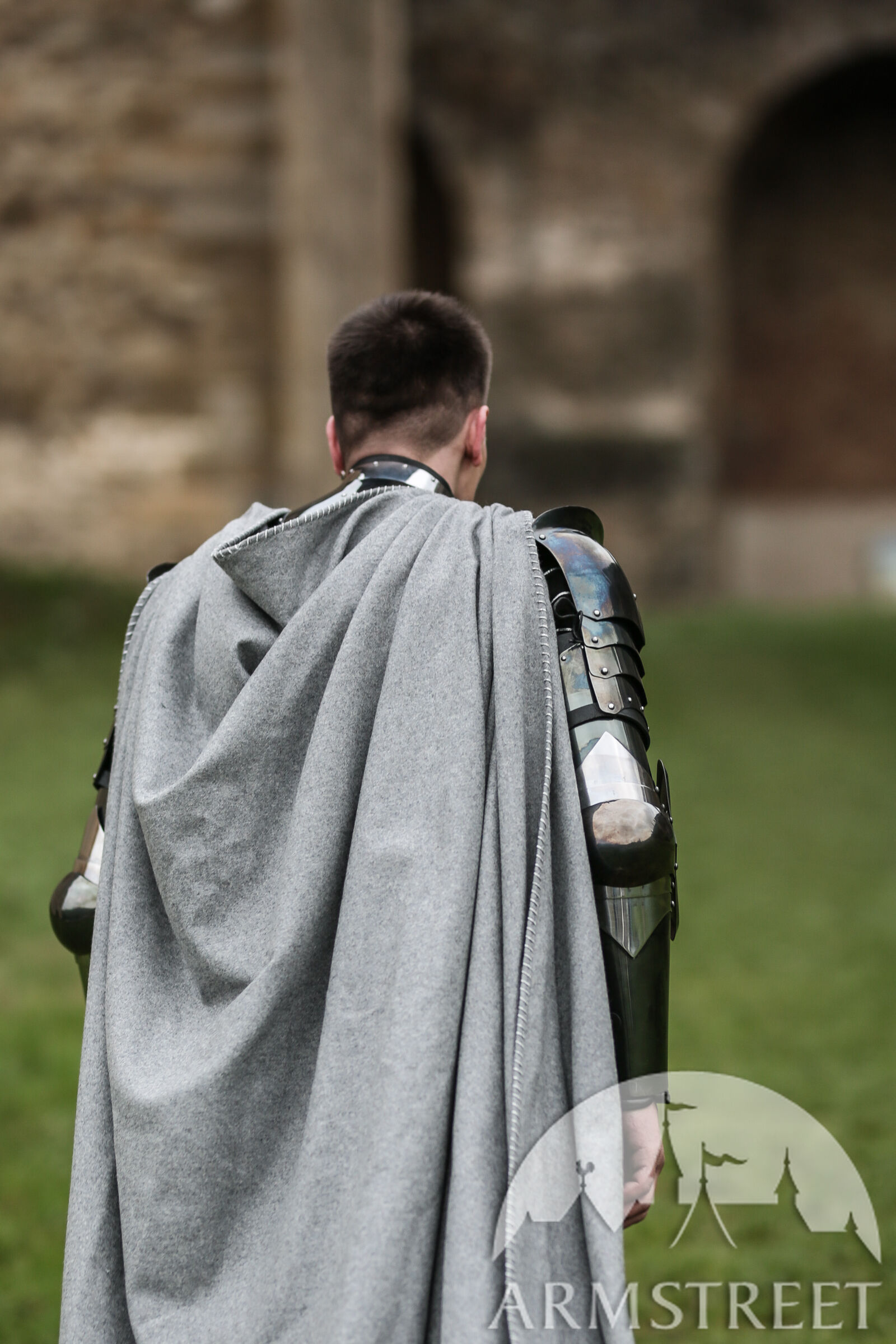 Der Umhang wird mit Hilfe von zwei starken Lederschlaufen, die mit Mustern aus unserer Kollektion „Dunkler Wolf” geprägt sind, an Ihrer Rüstung befestigt. Während des gesamten Stücks finden Sie feine Oberflächen und Handwerkskunst. Die Kanten sind mit dickem Silberfaden verziert und alle Nähte sind wunderschön verarbeitet.