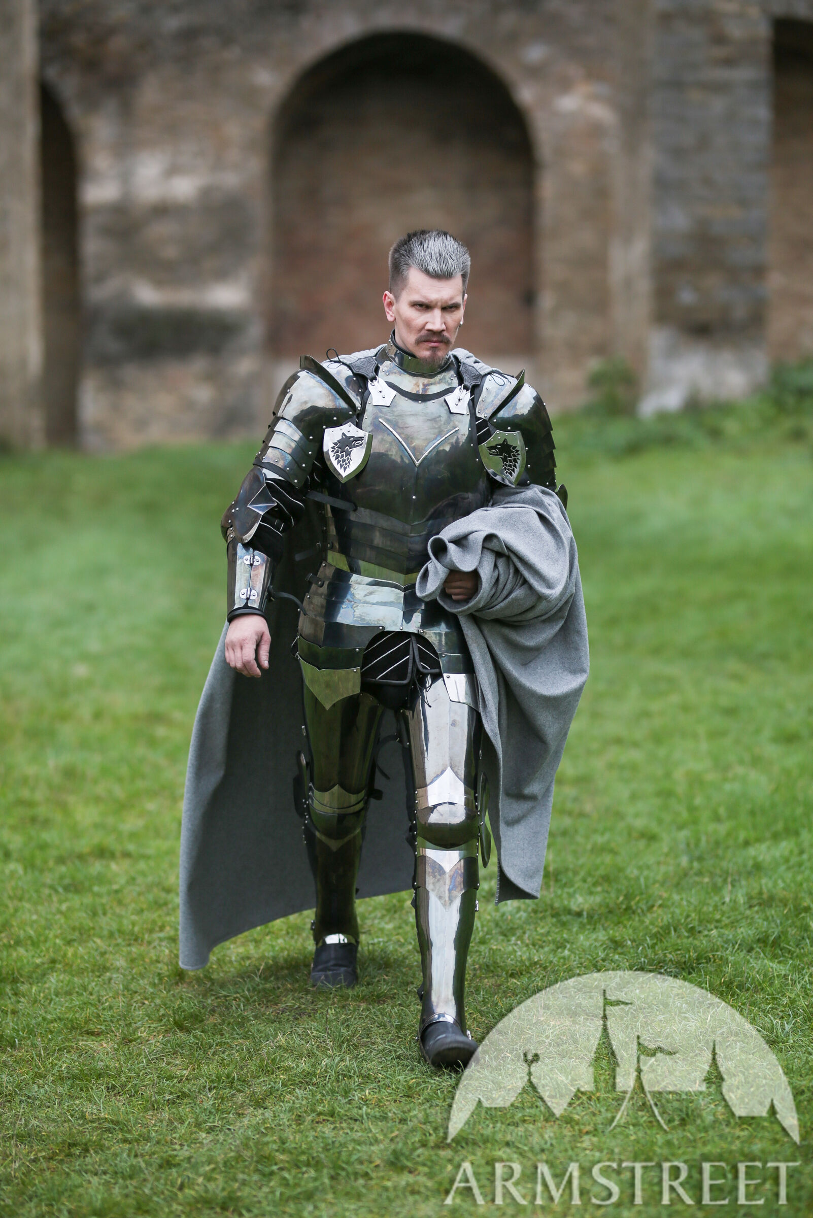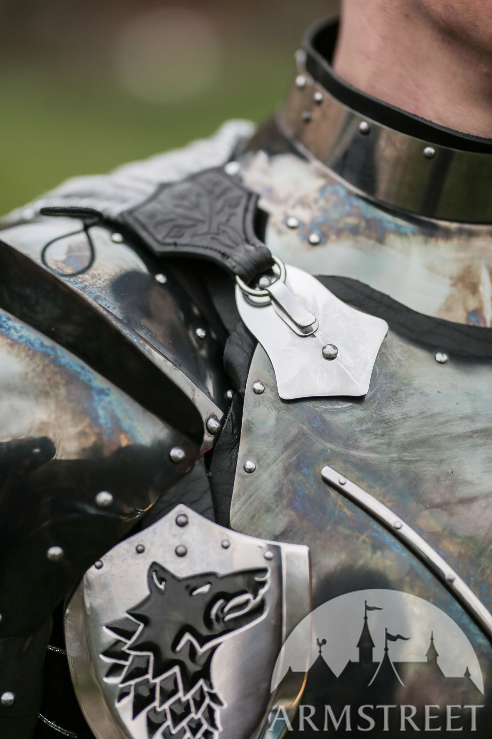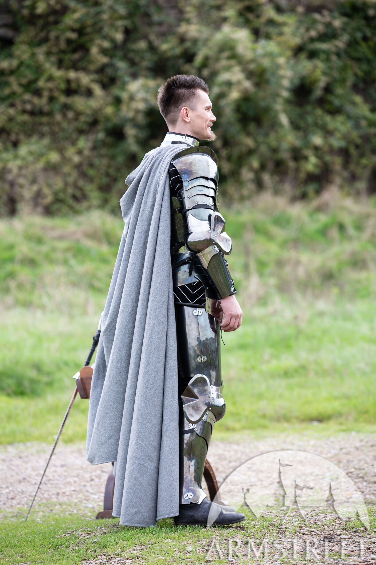 Der Umhang wird mit Hilfe von zwei starken Lederschlaufen, die mit Mustern aus unserer Kollektion „Dunkler Wolf” geprägt sind, an Ihrer Rüstung befestigt. Während des gesamten Stücks finden Sie feine Oberflächen und Handwerkskunst. Die Kanten sind mit dickem Silberfaden verziert und alle Nähte sind wunderschön verarbeitet.