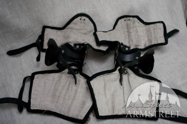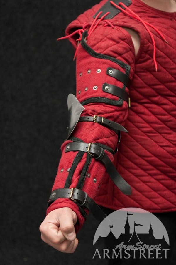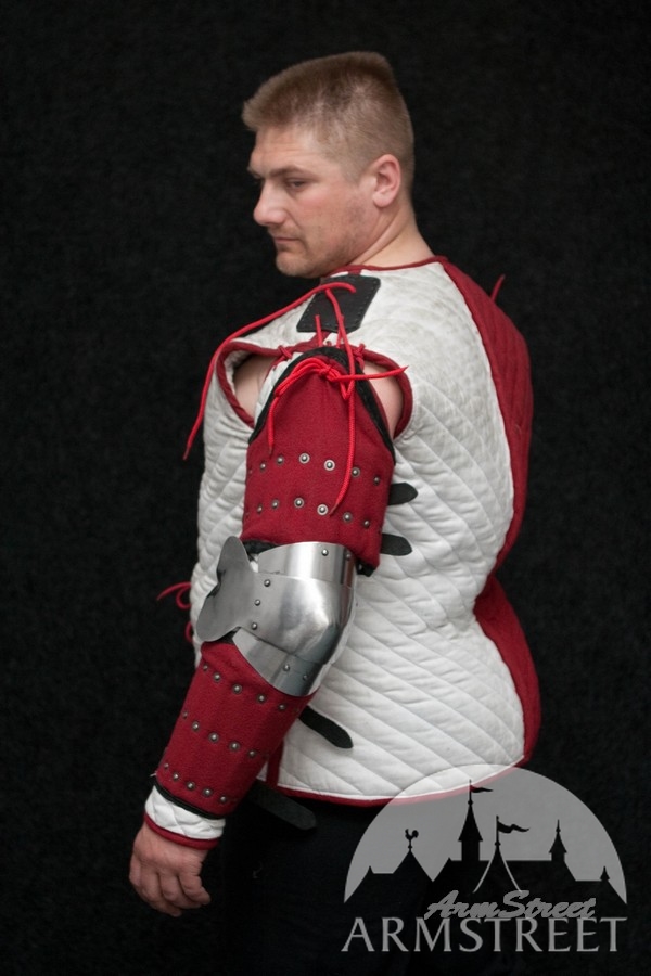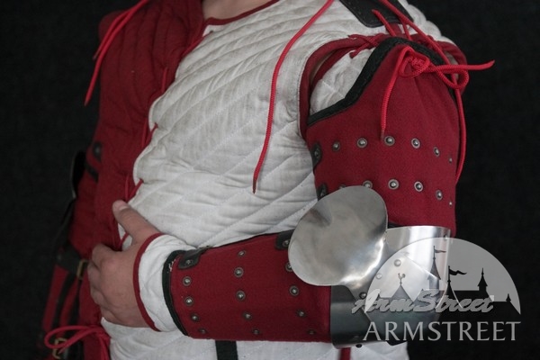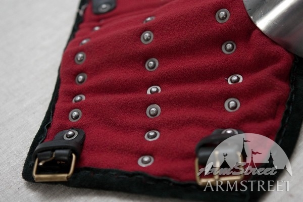 Dieser Schuppenpanzer, Brigantine wird aus 5 Schichten gefertigt: Außen ist eine Wolle, darunter eine Schicht aus Baumwolle, Mettalplatten aus 1,5 mm kaltgewalztem Stahl (handgefertigt), eine Schicht aus Baumwolle und eine Schicht aus Leinen. Die Kanten sind mit Lederbordüren verziert. Die Brigantine hat Metallnieten.