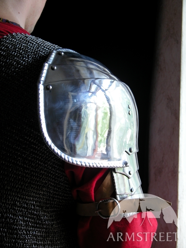 Klassisches mittelalterliches italienisches Design für Pauldron. Dieser Schulterschutz mit Armröhre ist aus 1,5 mm rostfreiem Stahl handgefertigt. Schulterschutz besteht aus mehreren Platten. Vorne sind Schwebescheibe befestigt, zum Schutz der Achselhöhle.