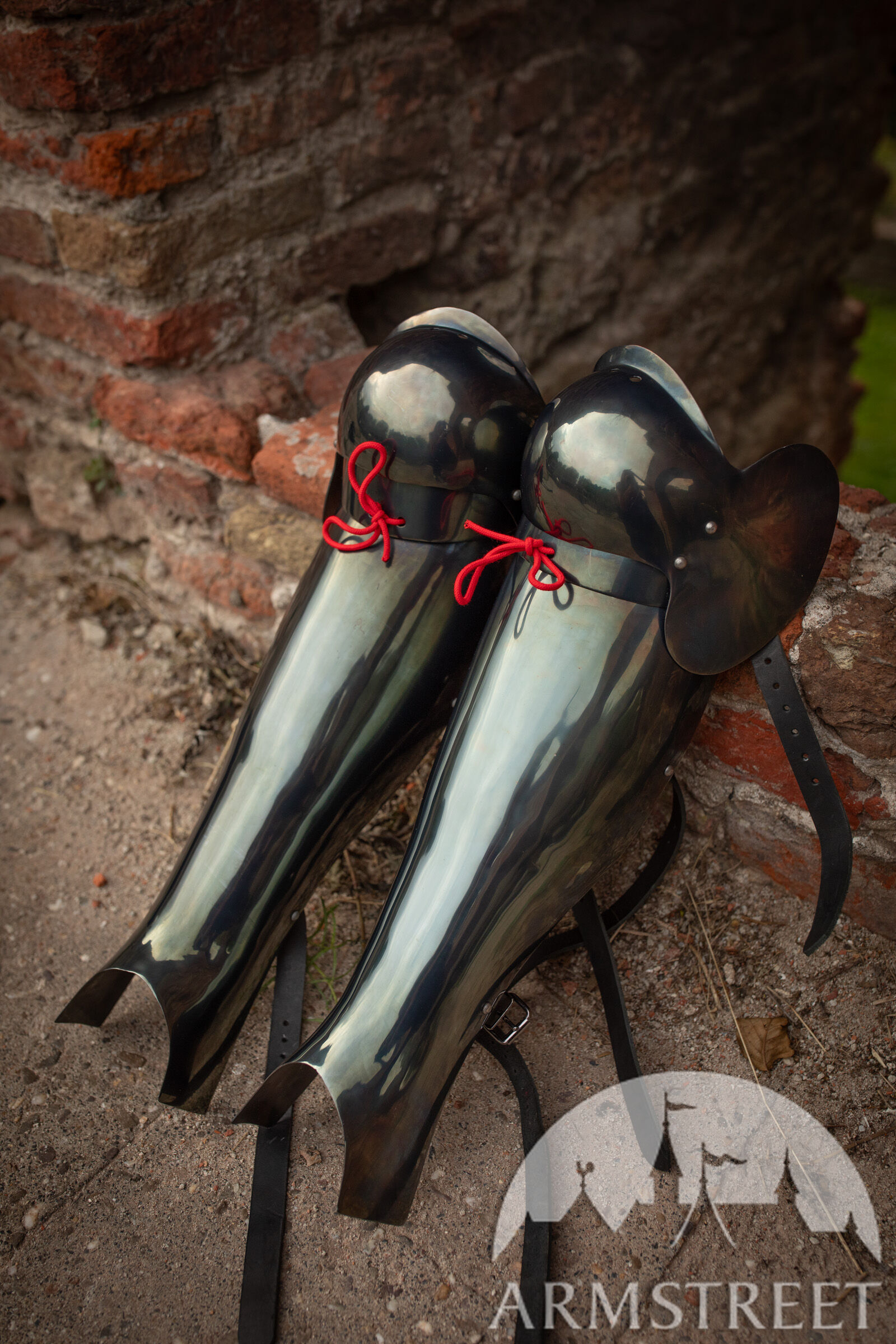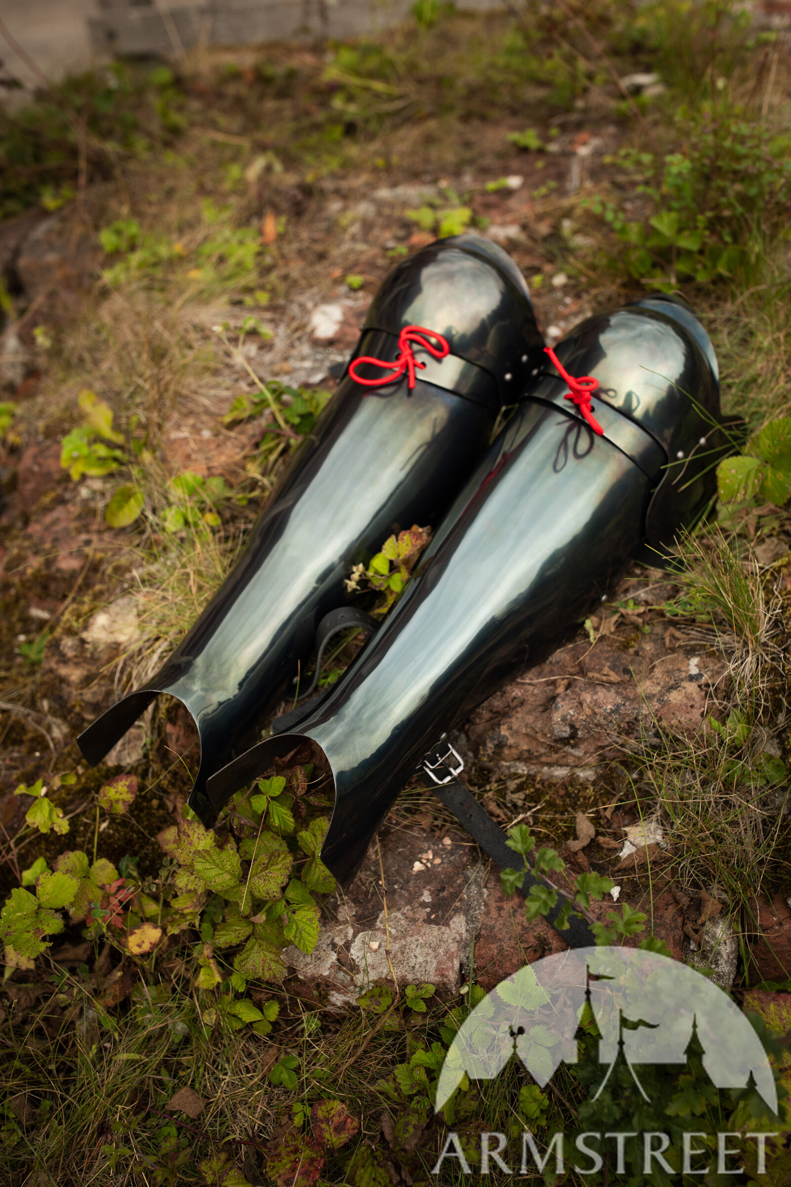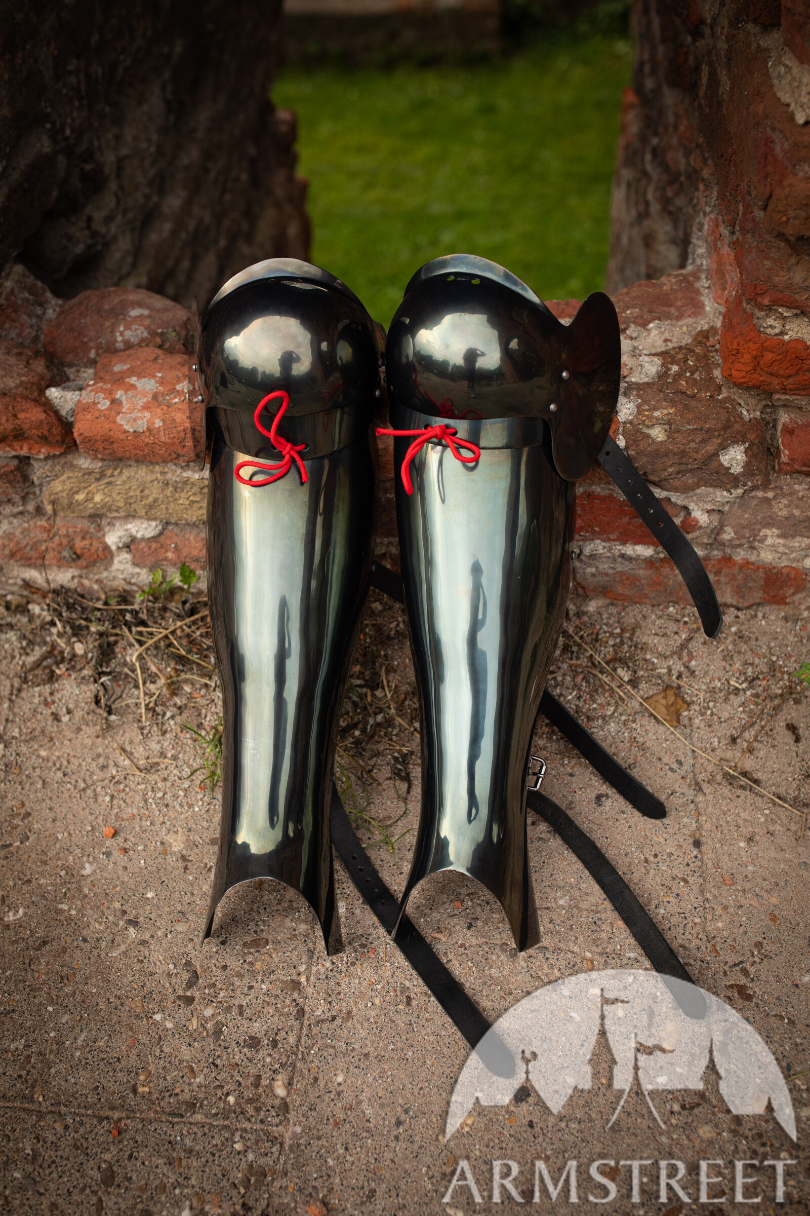 Diese Beinschienen mit geschnürten Knieschützern sind ArmStreets „reine“ Schwertkampfrüstung. Keine Verzierungen, keine aufwendigen Einfassungen oder komplexes Design – nur raffinierte anatomische Linien und Funktionalität aus Federstahl.