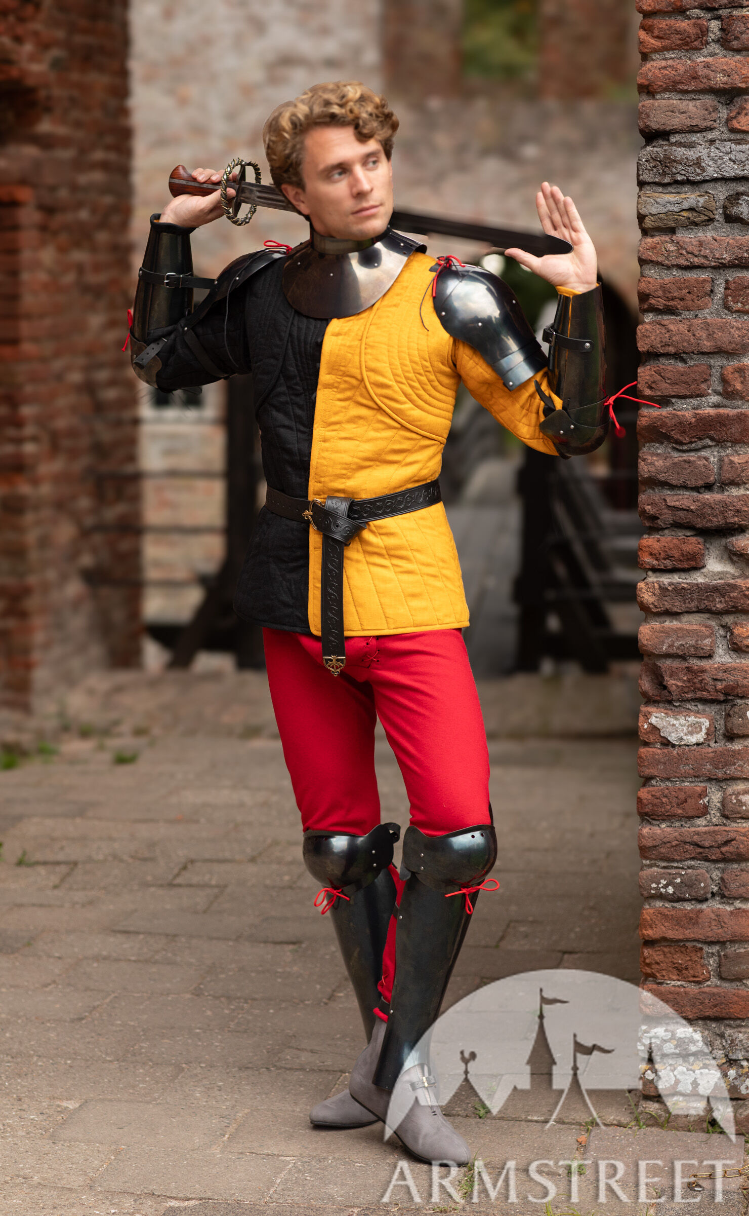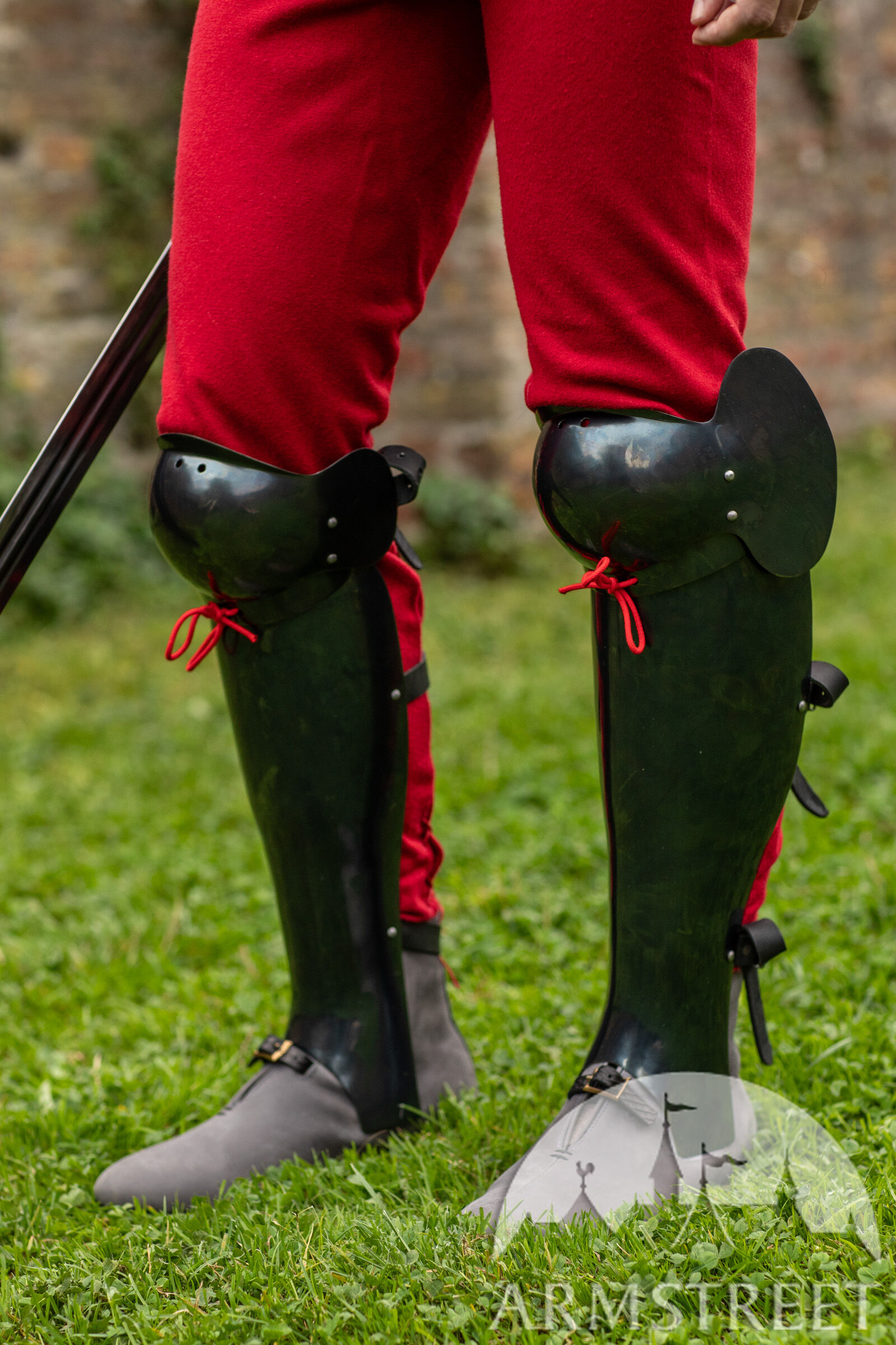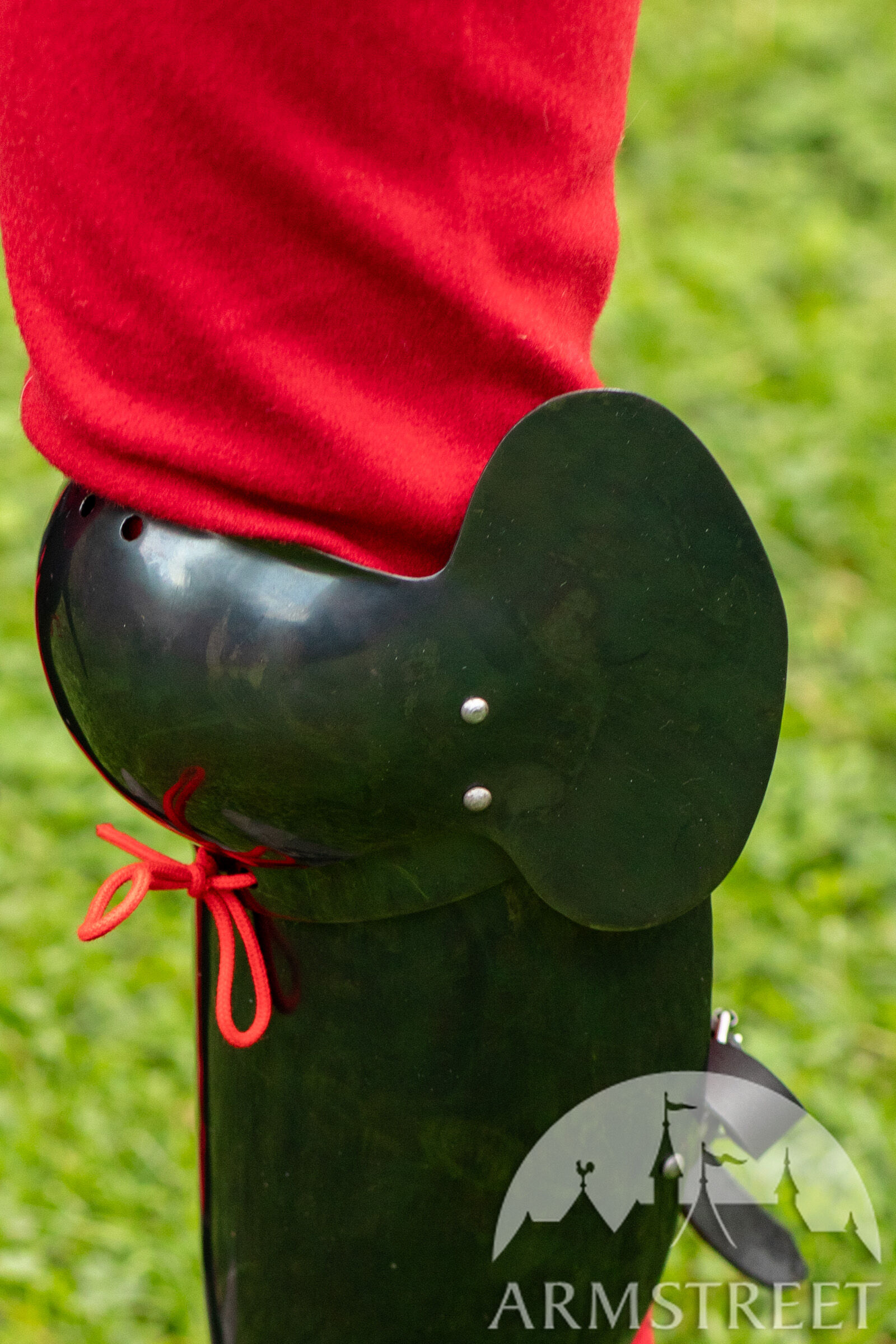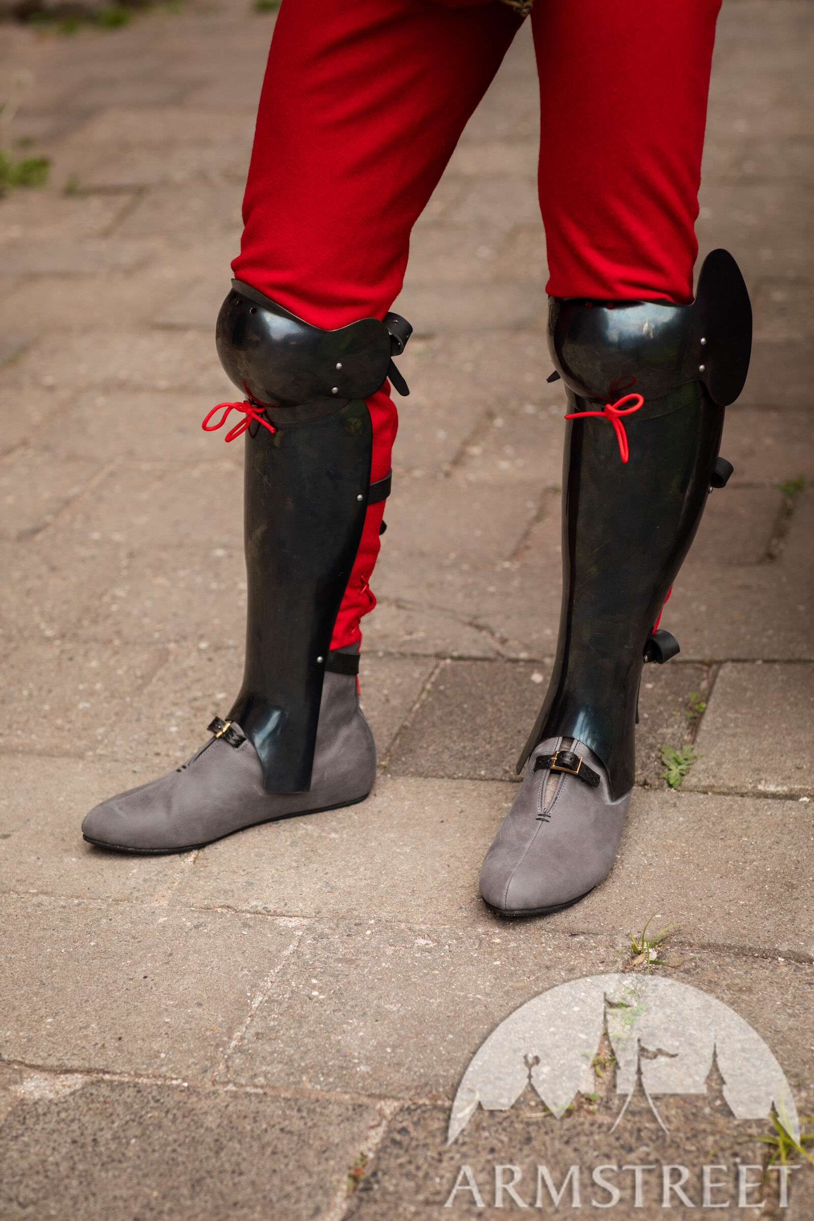 Diese Beinschienen mit geschnürten Knieschützern sind ArmStreets „reine“ Schwertkampfrüstung. Keine Verzierungen, keine aufwendigen Einfassungen oder komplexes Design – nur raffinierte anatomische Linien und Funktionalität aus Federstahl.