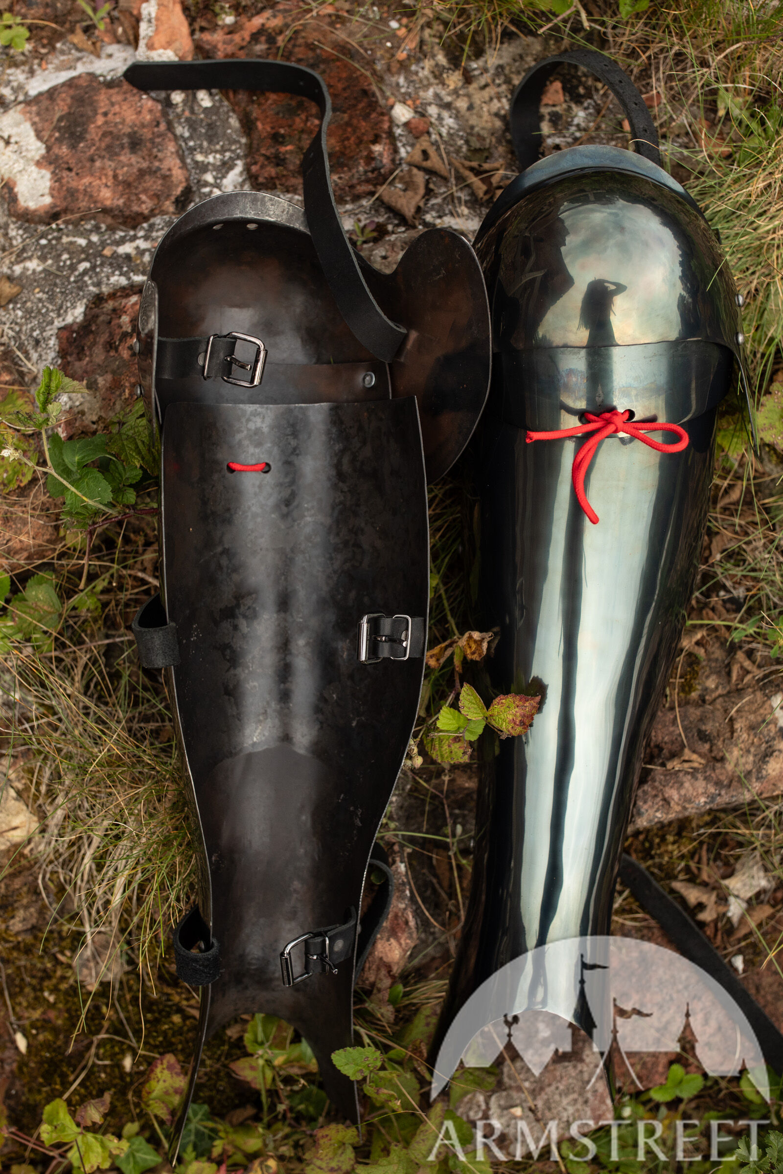 Diese Beinschienen, Teil unseres „Sellsword“-Kits, eignen sich für verschiedene Einsatzzwecke – für punktbasierten Schwertkampf, HEMA-Harnischfechten oder SCA-schwere Waffen, also für Fälle, in denen kein vollständiger Schutz, sondern nur die wichtigsten und verletzlichsten Körperteile benötigt werden. Auch für LARP-Spieler, die eine angemessen schwere „echte“ Rüstung für ihren Charakter tragen möchten, sind diese geeignet.