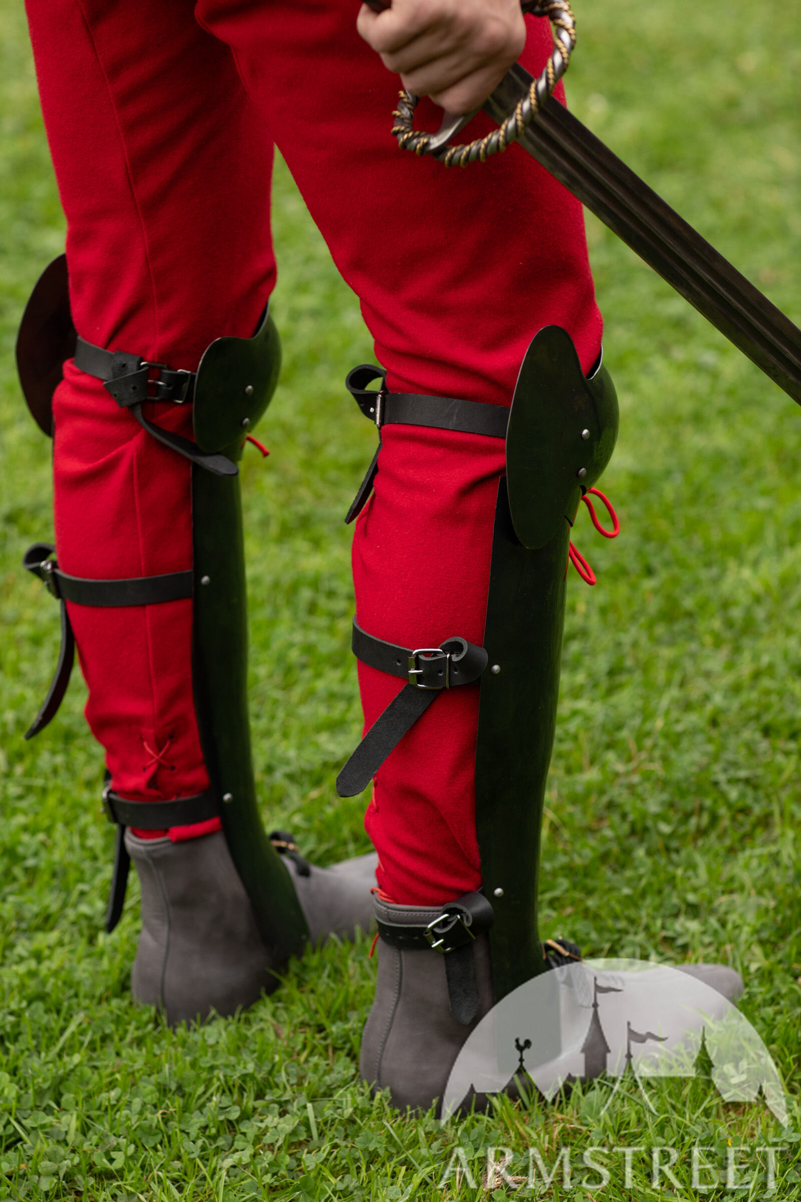 Beide Teile, Beinschienen und Knieschützer, können separat verwendet (und auch erworben) werden. Dieses Set ist jedoch das Minimum, das Sie für die meisten punktbasierten Schwertkampfformate benötigen. Wenn Sie Ihre Oberschenkel schützen möchten, sehen Sie sich bitte unsere Rieneck-Panzerbeinschützer als Referenz an. Sie erhalten diese Beine mit zusätzlichen Beinschienenplatten für 30 % Aufpreis.