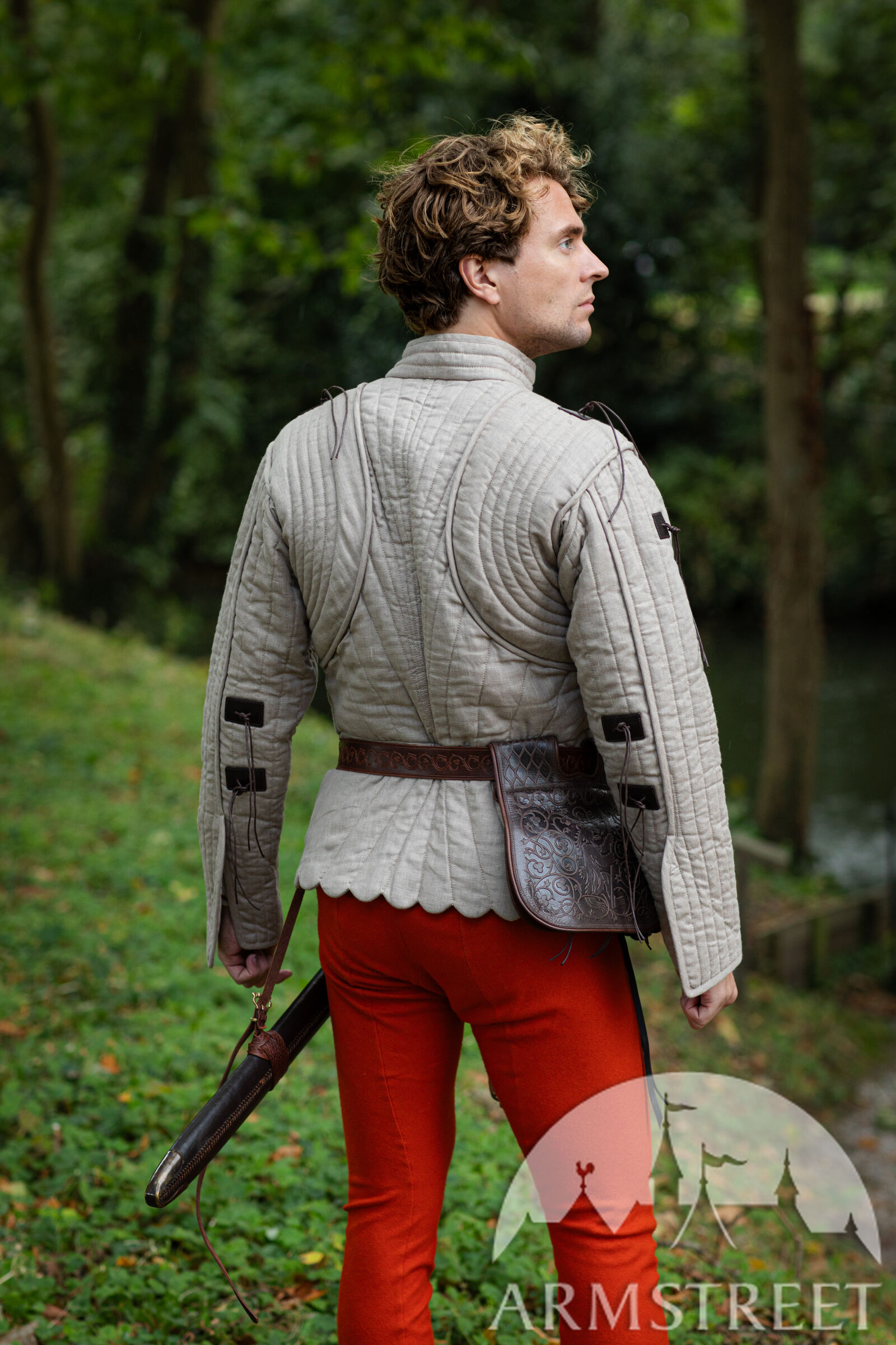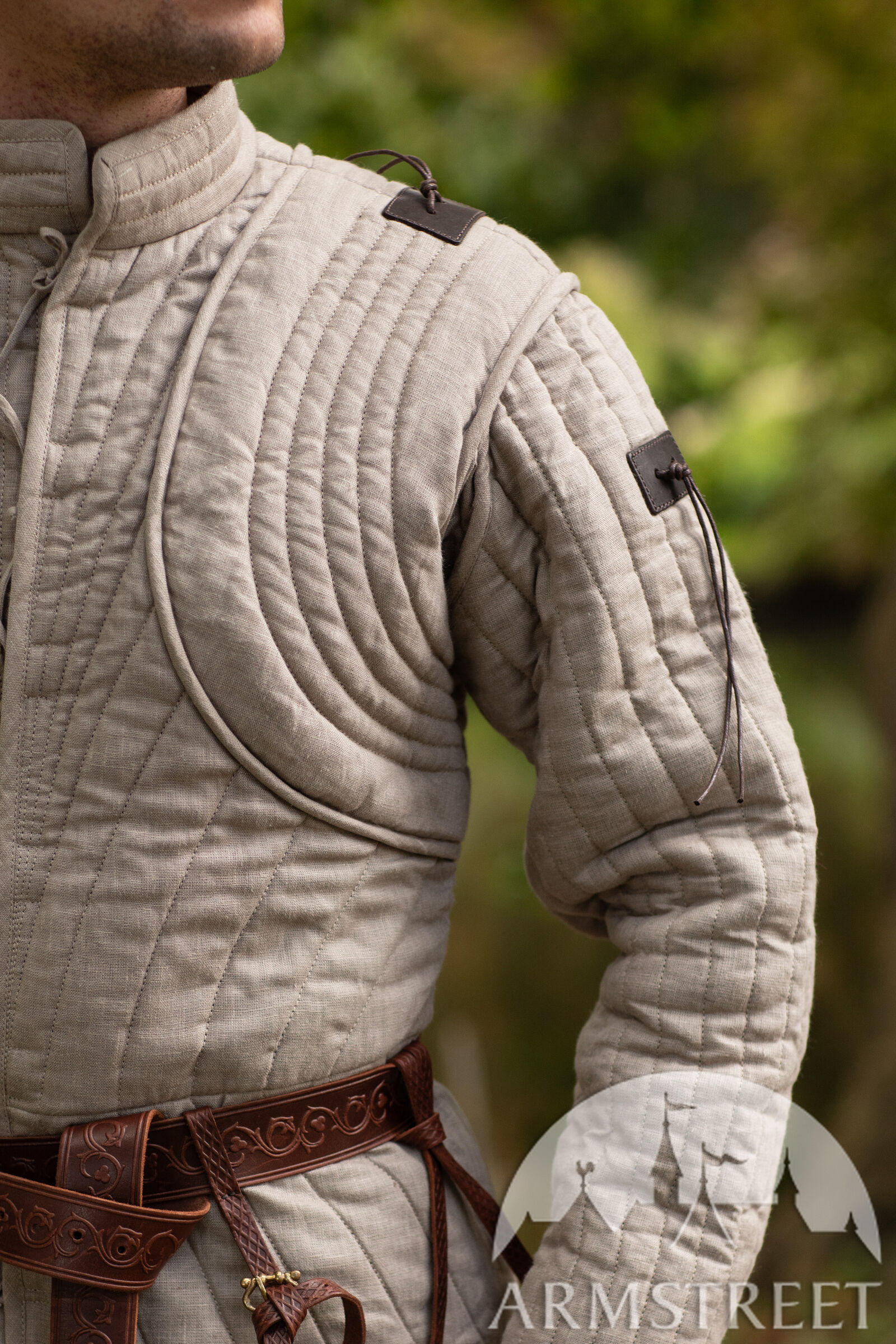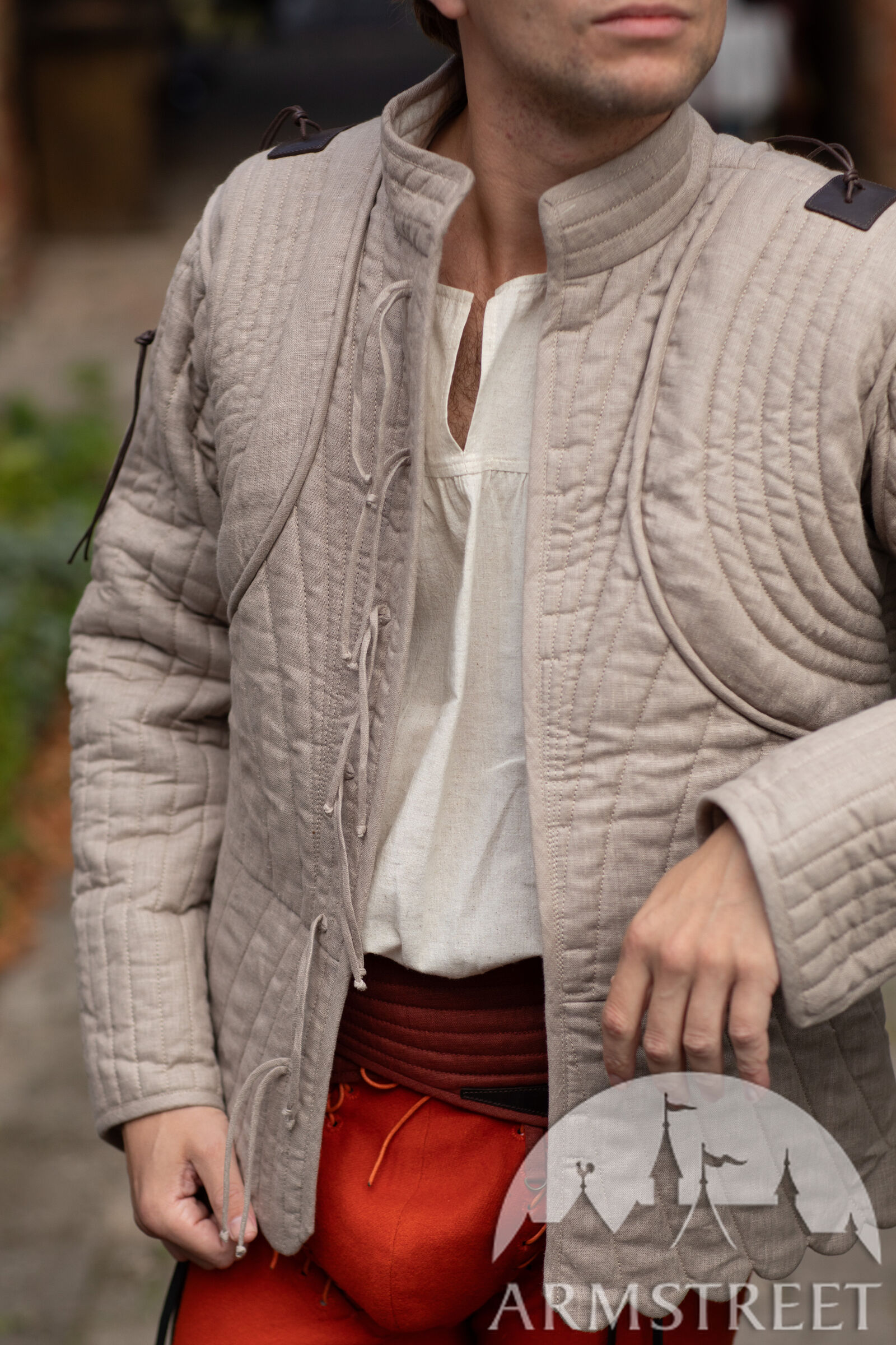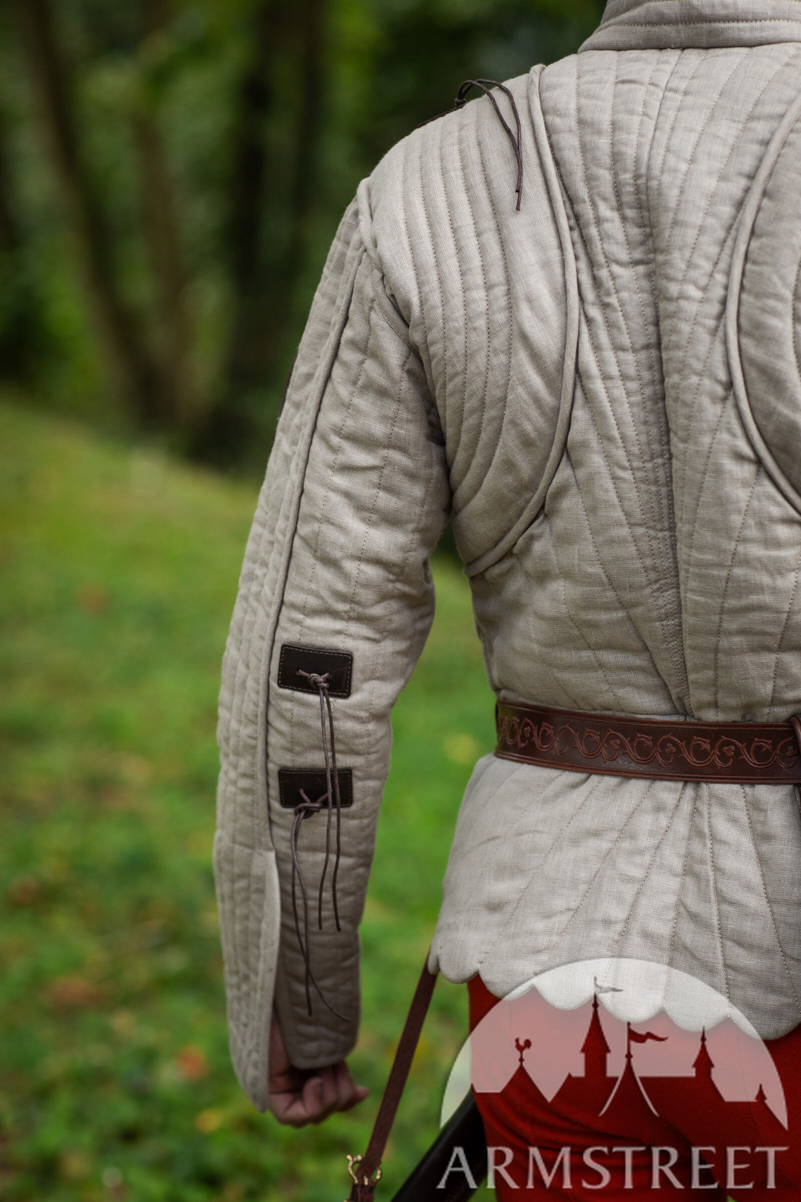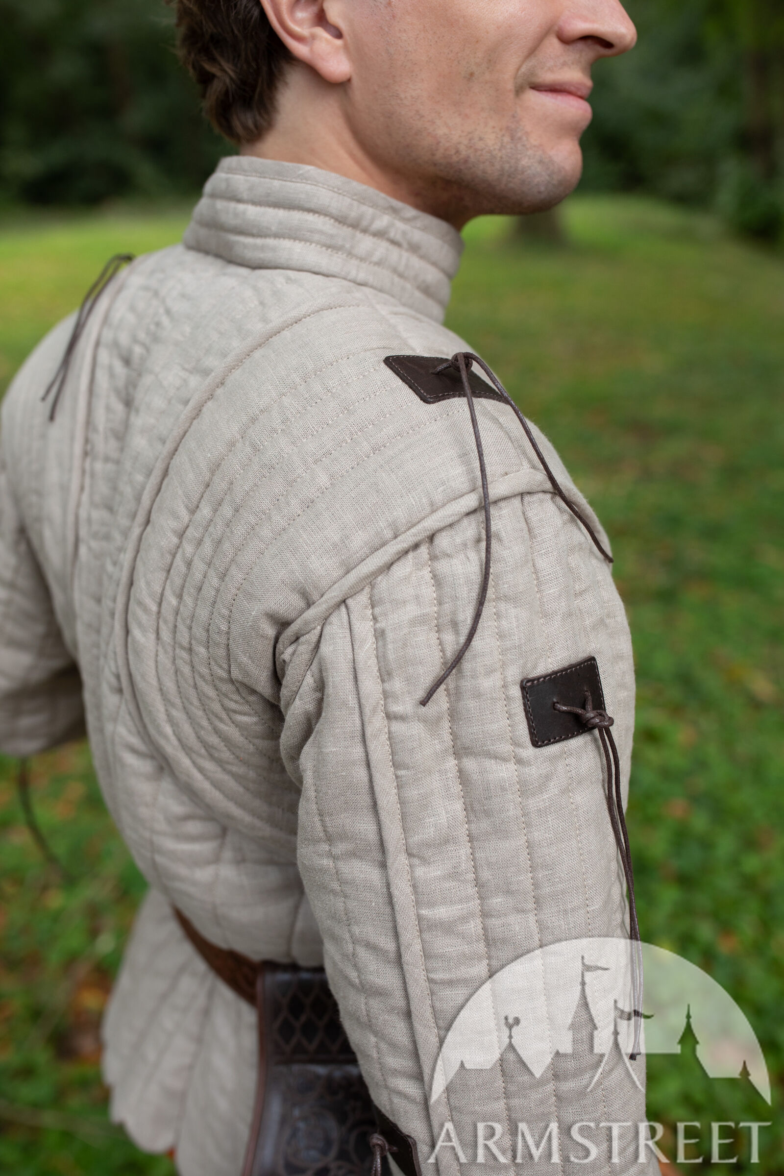 Der Gambeson wird überlappend mit sauberen Leinenbändern und -schlaufen geschlossen. Schulter- und Brustpasse sind mit einer zusätzlichen Lage Baumwollvlies verstärkt. Der gesteppte Stehkragen schützt den Hals vor dem Kontakt mit dem Halskragen. Ein langer Schlitz am Unterarm ermöglicht es, den Ärmel unter den Armschutz zu wickeln. Der Gambeson verfügt außerdem über robuste Lederpolster an Schultern und Ärmeln, die als Befestigungspunkte für die Armschienen dienen.