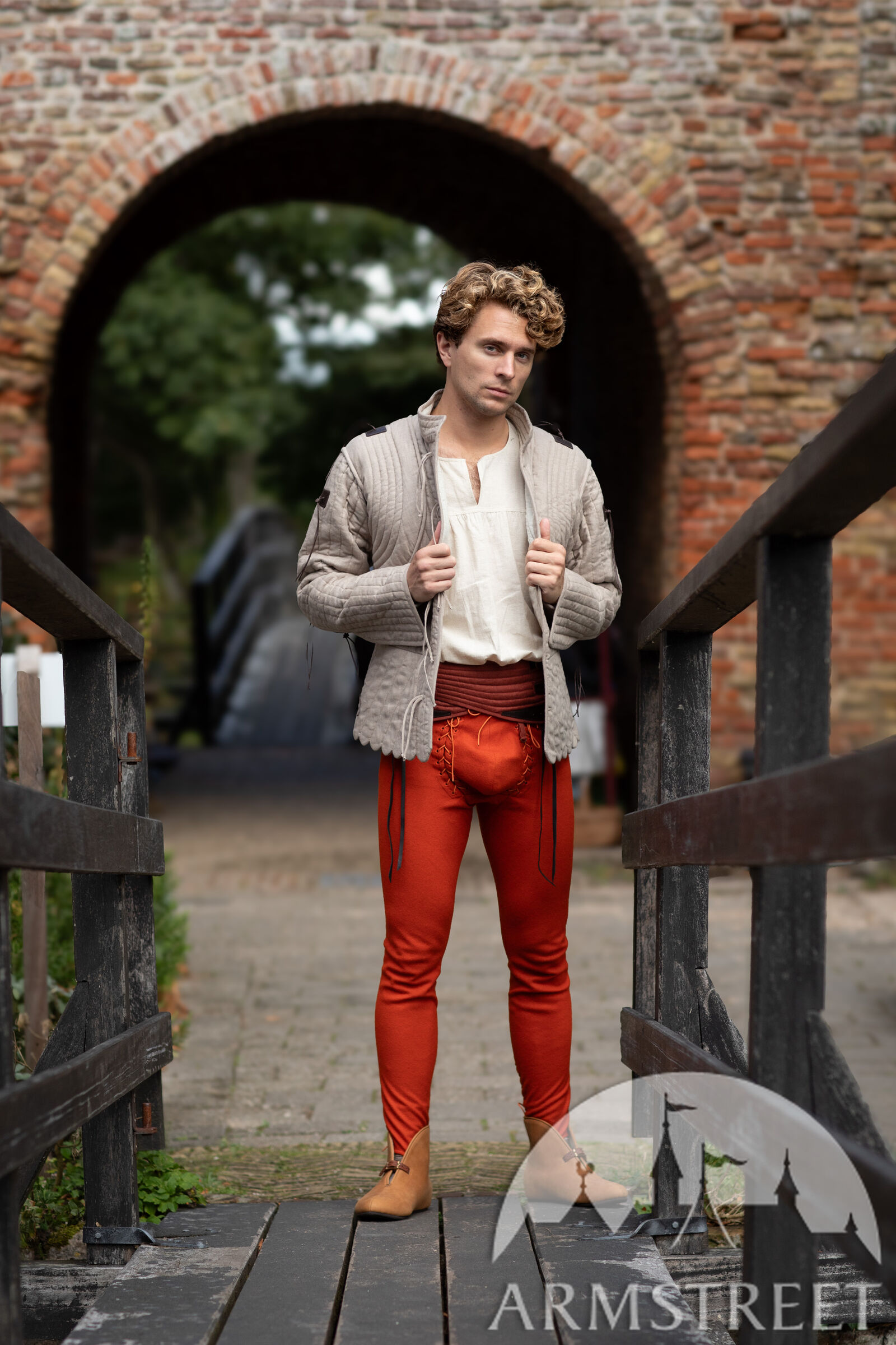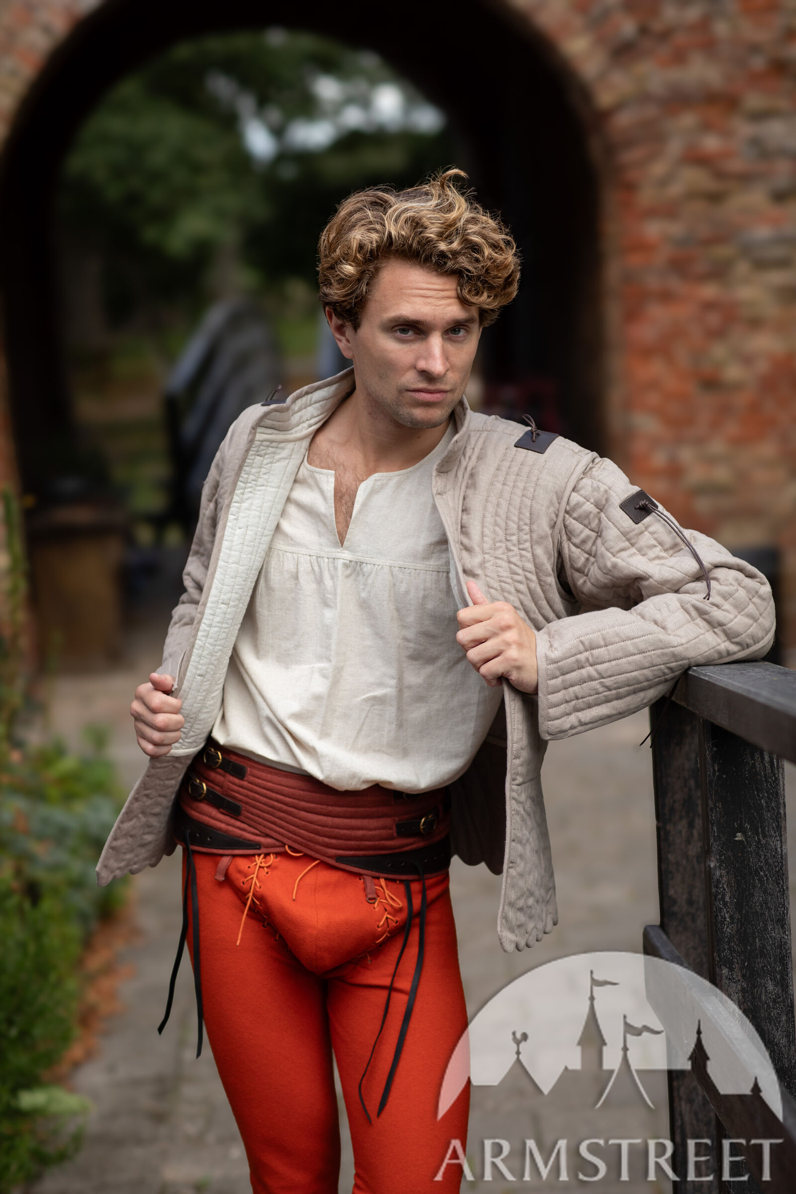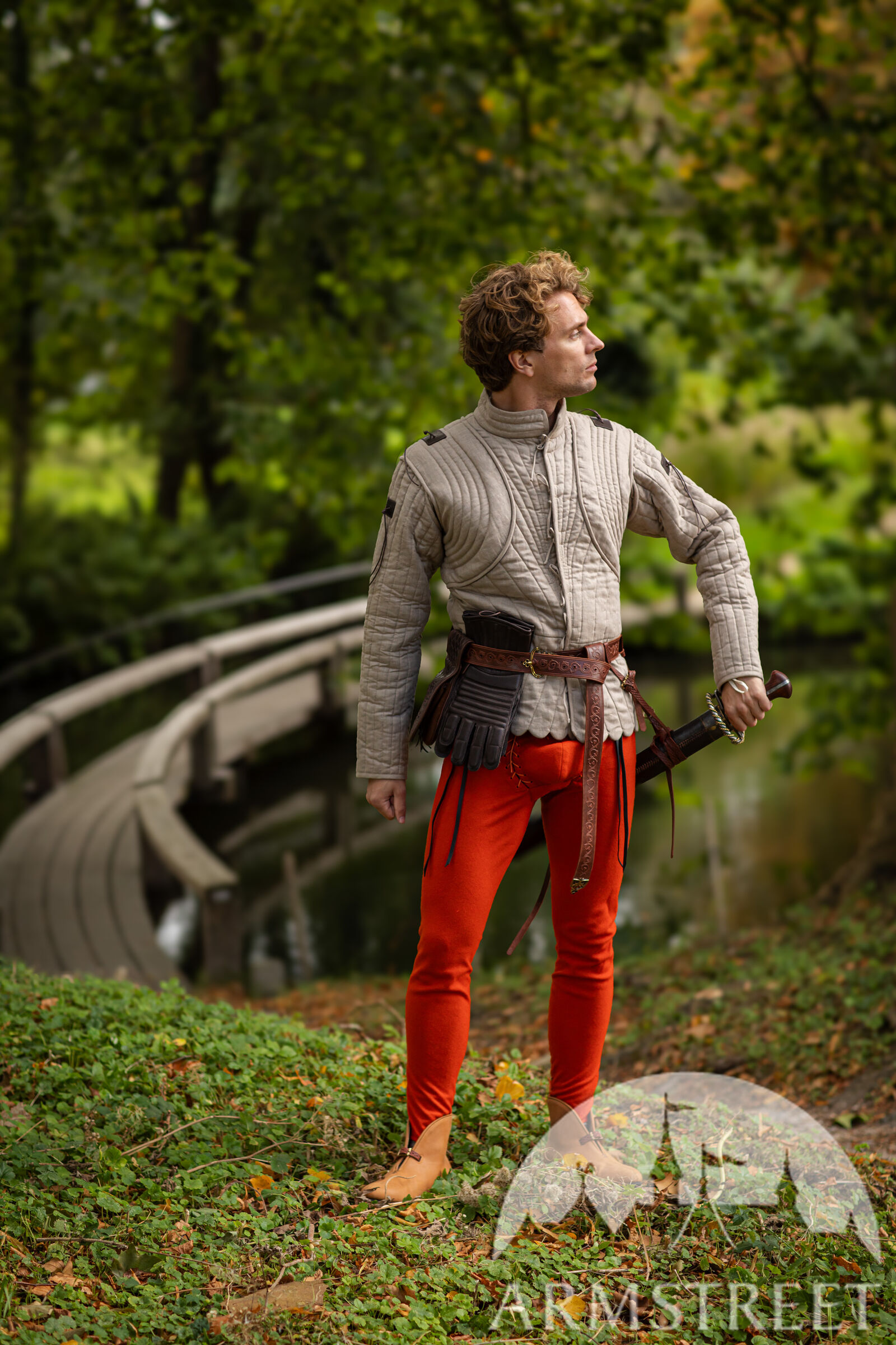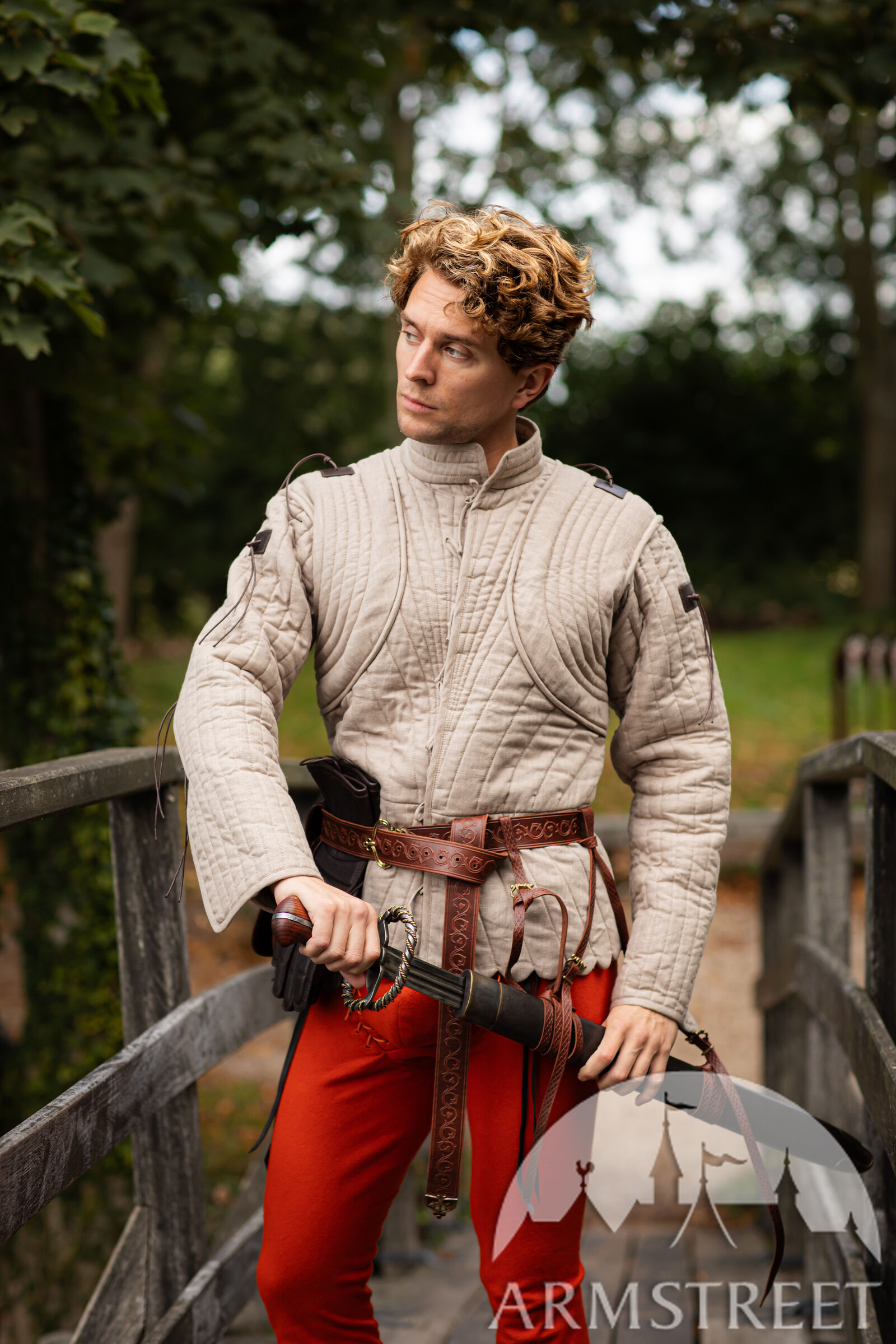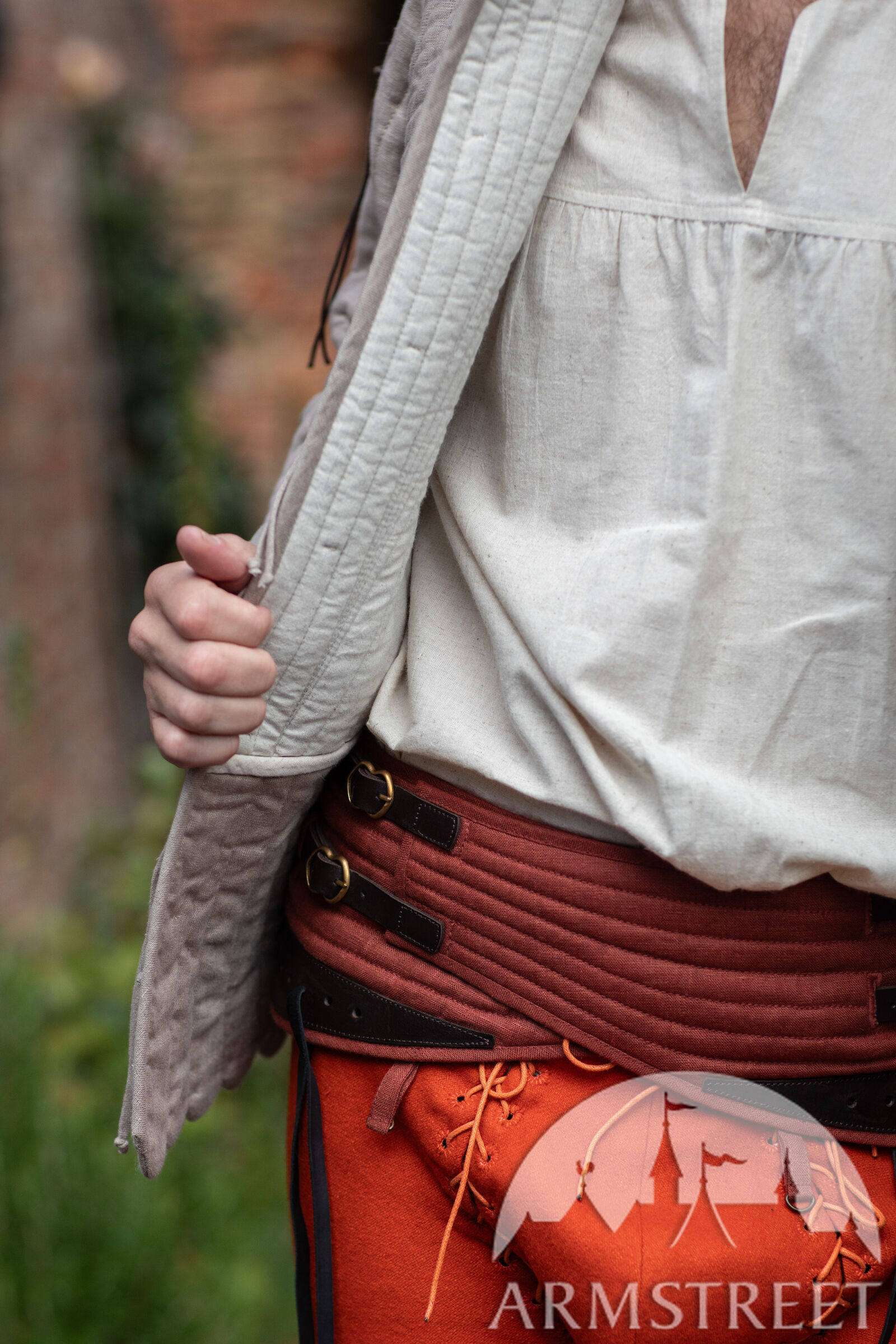Der Gambeson wird überlappend mit sauberen Leinenbändern und -schlaufen geschlossen. Schulter- und Brustpasse sind mit einer zusätzlichen Lage Baumwollvlies verstärkt. Der gesteppte Stehkragen schützt den Hals vor dem Kontakt mit dem Halskragen. Ein langer Schlitz am Unterarm ermöglicht es, den Ärmel unter den Armschutz zu wickeln. Der Gambeson verfügt außerdem über robuste Lederpolster an Schultern und Ärmeln, die als Befestigungspunkte für die Armschienen dienen.