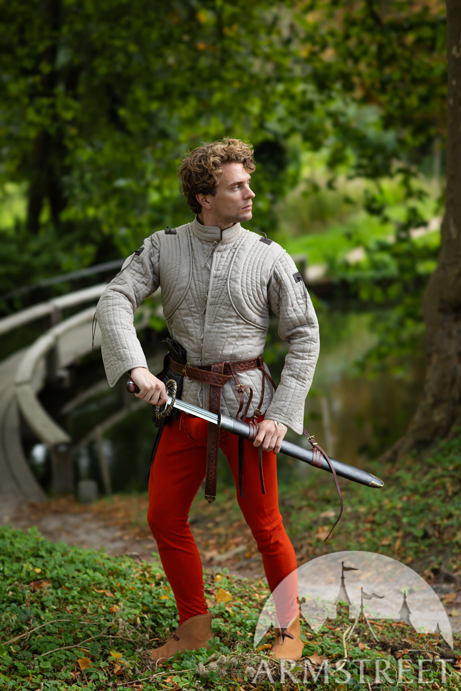 Dieses Modell wurde von Fechtern in der Ukraine getestet und von unseren Kunden wiederholt positiv bewertet. Dank des zweifach genähten Ärmels, des Zwickels und des voluminösen, abgerundeten Schulterausschnitts bietet dieser Gambeson maximale Bewegungsfreiheit und bewahrt gleichzeitig die schlanke und elegante Silhouette eines mittelalterlichen Wamses. Um diesen Eindruck zu verstärken, haben wir einige neue Details hinzugefügt.