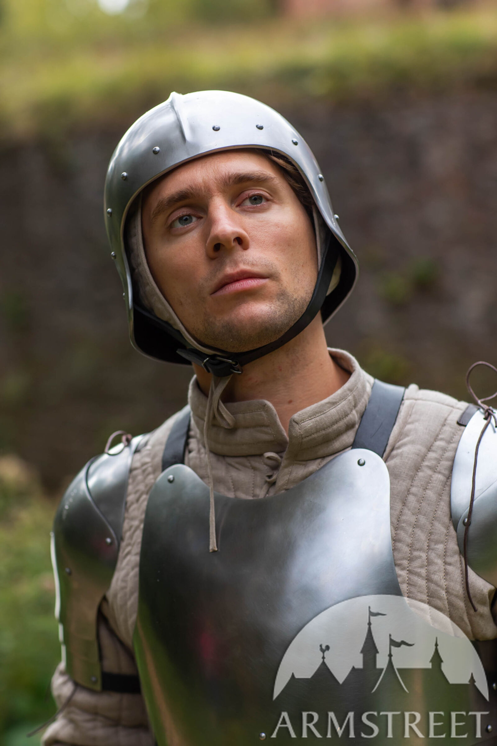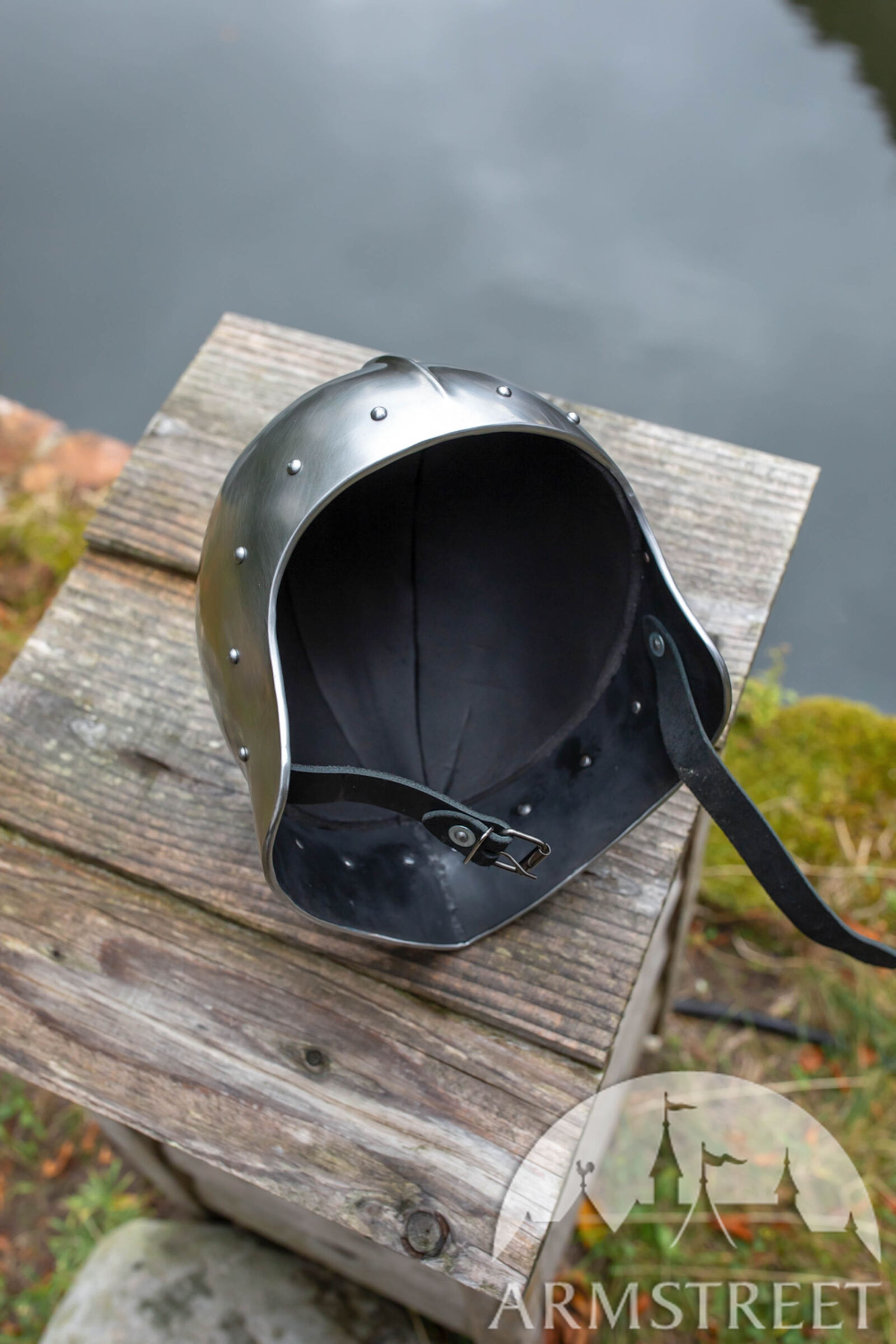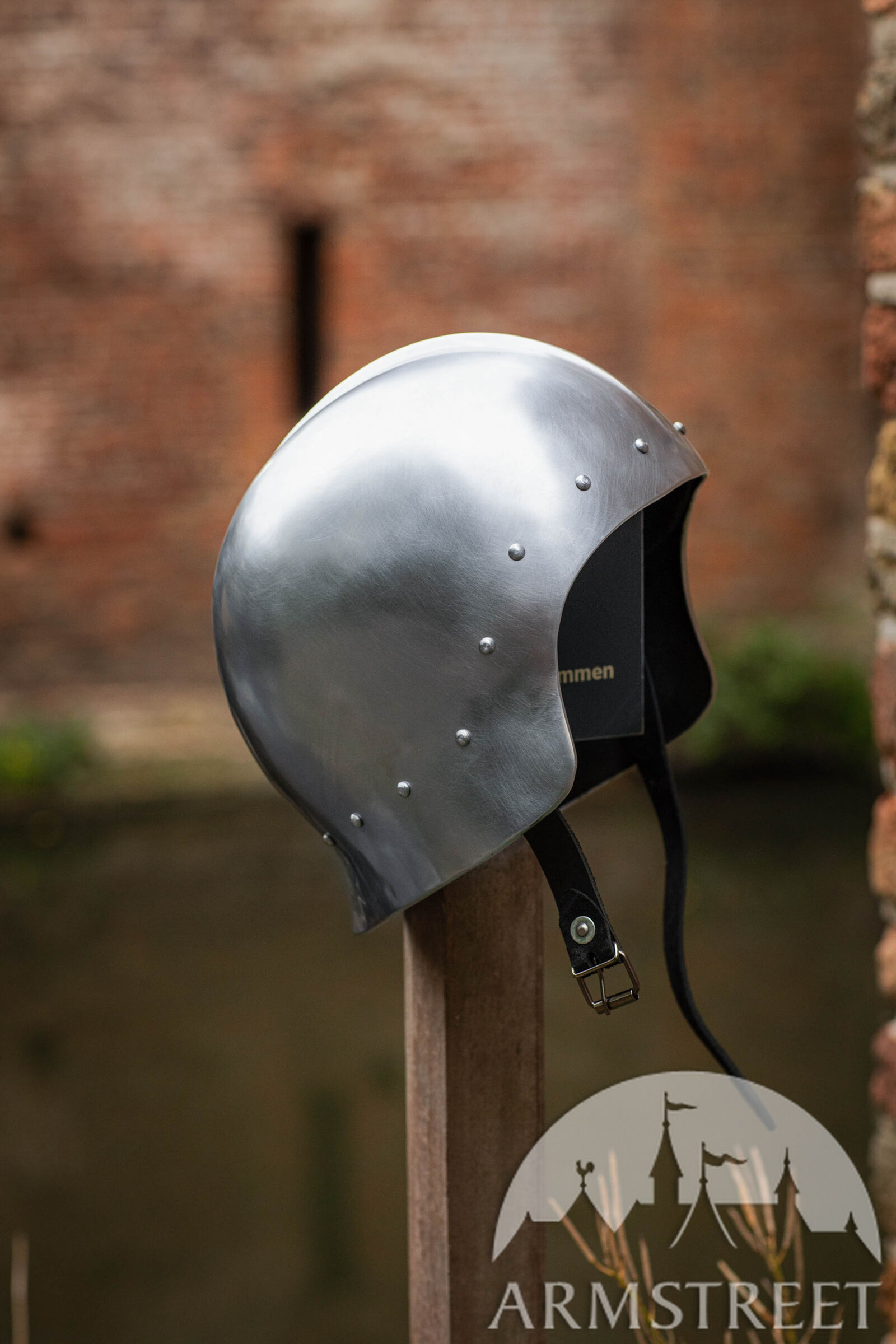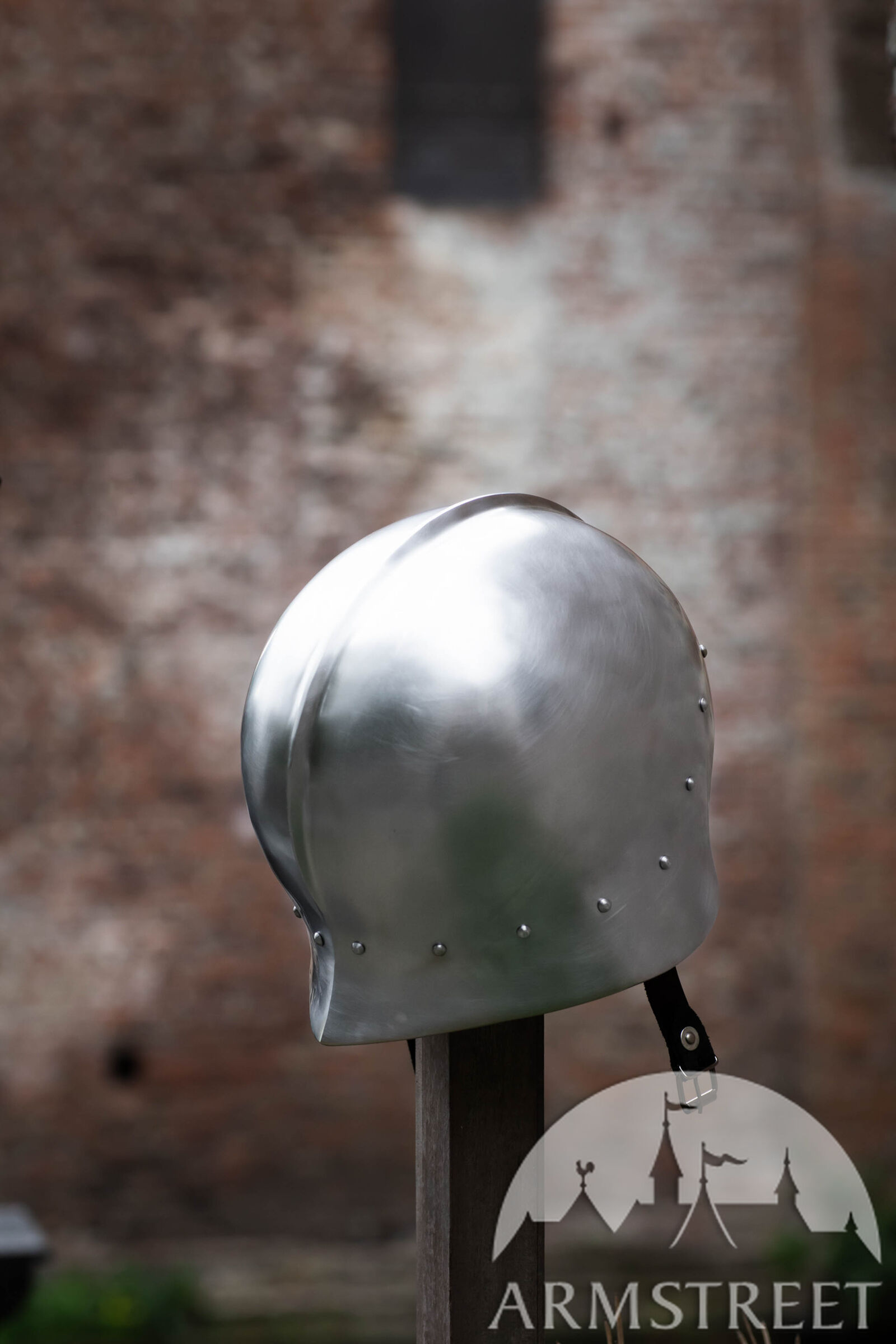 Es gibt einen wesentlichen Unterschied zwischen dem Schwertkampf von heute und dem vor 500 Jahren. Trotz des großen Unterschieds zwischen Kampf ums Überleben und Sport haben sich die Sicherheitsstandards grundlegend verändert. Moderne Helme, wie sie im SCA, Bohurt und HEMA Harnischfechten verwendet werden, sind auf maximale Sicherheit ausgelegt und dienen nicht mehr dem Überleben. Als gepanzerte Ritter im Spätmittelalter eine brutale und nahezu unaufhaltsame Macht auf den Schlachtfeldern darstellten, trugen viele Menschen, was sie sich leisten konnten, abhängig von ihrem Status und ihrer Rolle in der Schlacht. Daher sind viele Museums- und historische Helme deutlich kleiner und weniger gepolstert als moderne Kampfhelme.