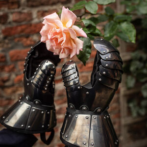 Unser Fantasy-Barbute besteht aus 65 g Stahl (1,4 mm dick) und wurde chemisch gebläutet, um ihn vor Rost zu schützen. Dieser Prozess hinterlässt einen wunderbaren, lebendigen Schwarzton, der schön aussieht und auch eine Funktion erfüllt. Ergänzt wird diese satte Farbe durch massive Messingnieten, die sich vom Schwarz abheben.