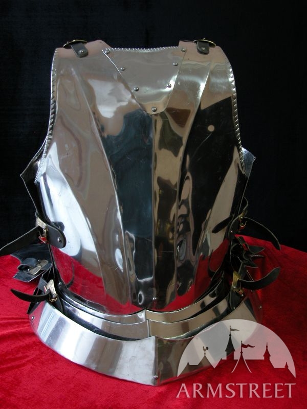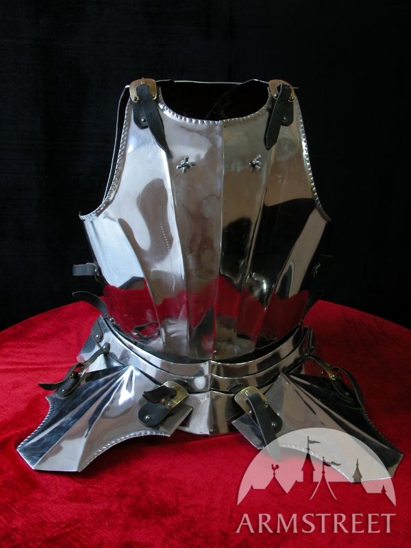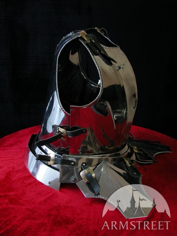 Brust,- und Rückenpanzer mit zwei Tasseten/Beintaschen (Platten am Unterbauch und Übergang zu den Beinen). Untere Teil ist für bessere Beweglichkeit aus Metalplatten gemacht. Riemen lassen besser der Panzer anzupassen und haben hervoragend bearbeiteten Schließe.
