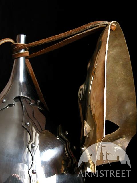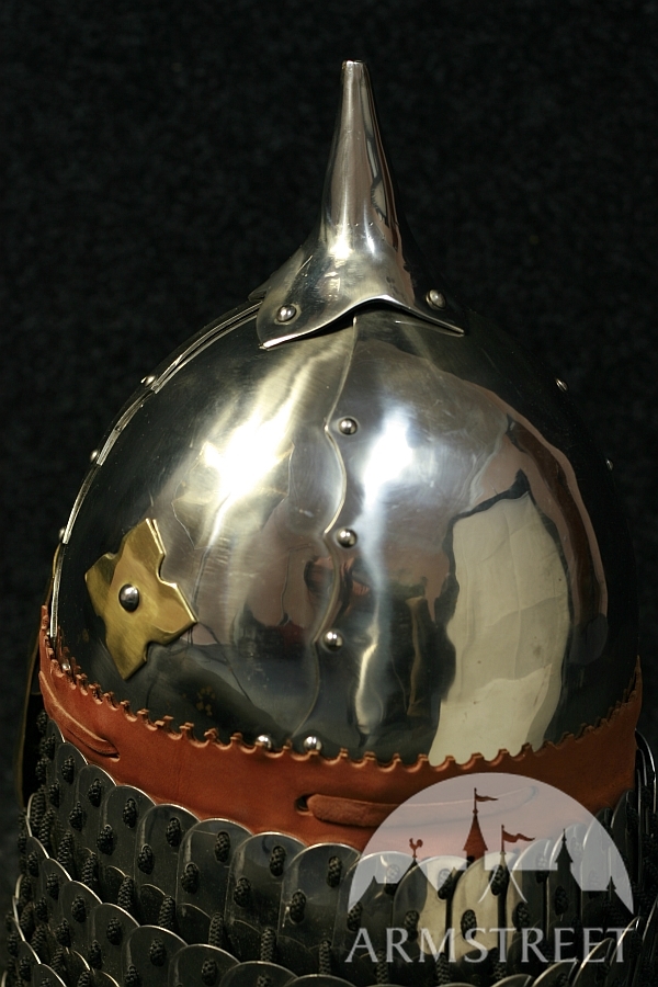 Der kegelförmige Helm mit Spitze ist eine echte Herausforderung für die Handwerker und deshalb ein wirklich großartiges und seltenes Stück. Der Helm wird aus 2 mm starkem kaltgewalztem Stahl gefertigt und sehr sorgfältig poliert.