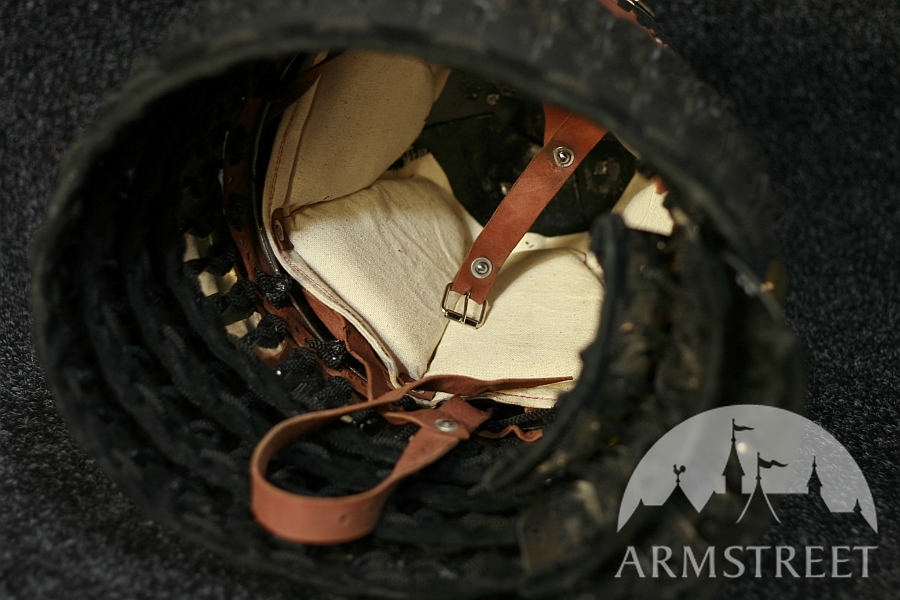 Der Helm hat ein Kettengeflecht und Lederfutter.