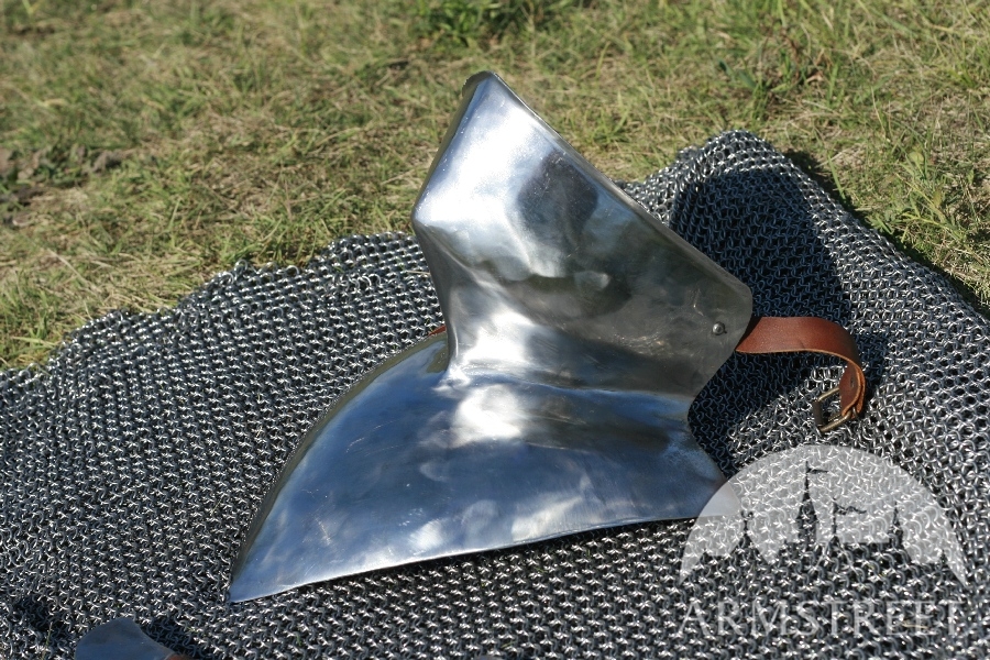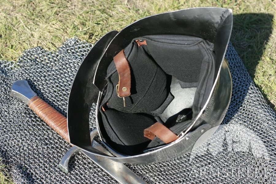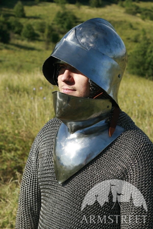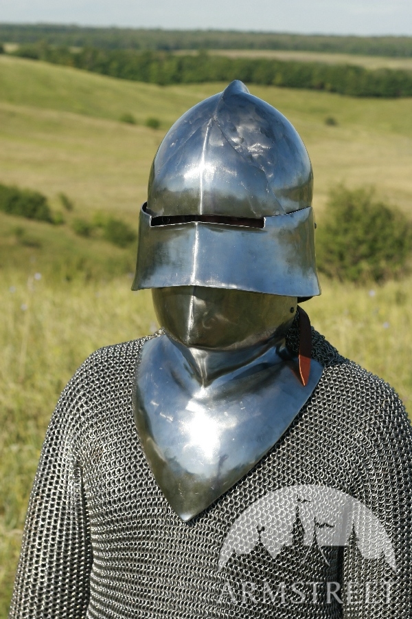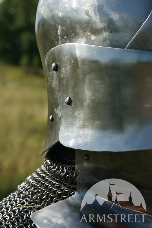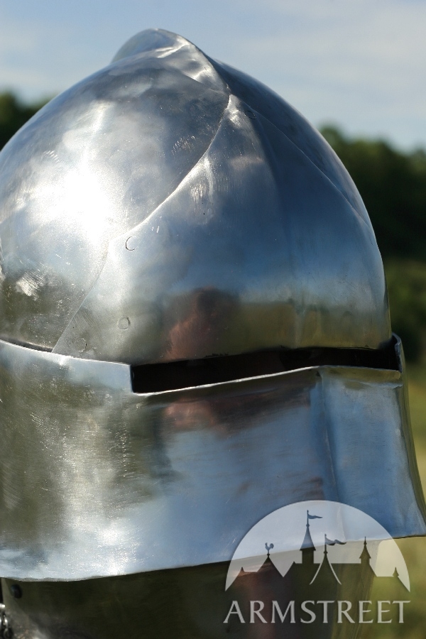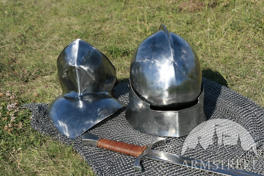 Klassischer Schaller aus 2 mm kaltgewalztem Stahl. Reenactment Rüstung. Er hat ein nach oben aufklappbares Visier und ein Bart für Kinnschutz. Inlay und Bart sind inklusive.