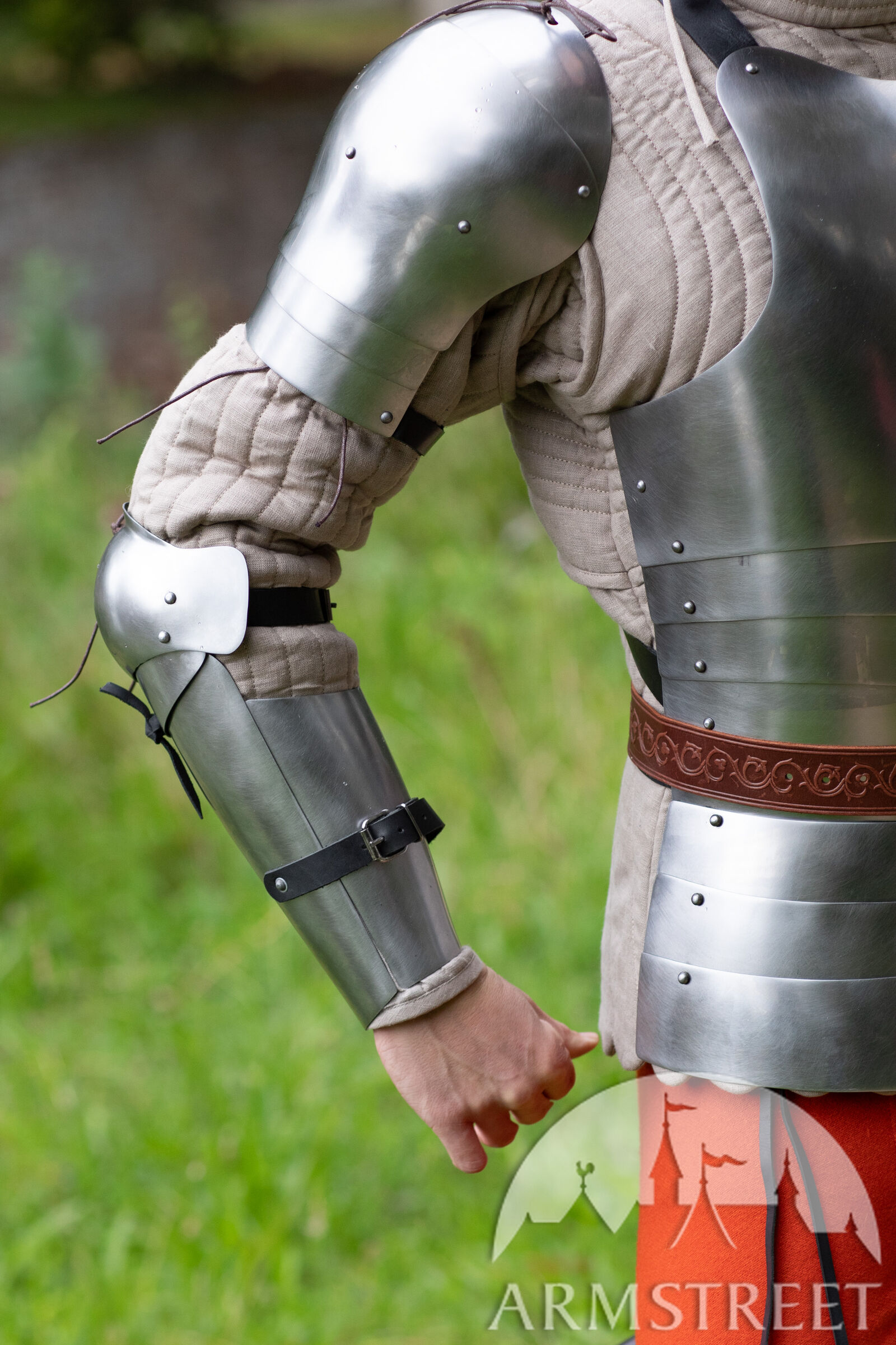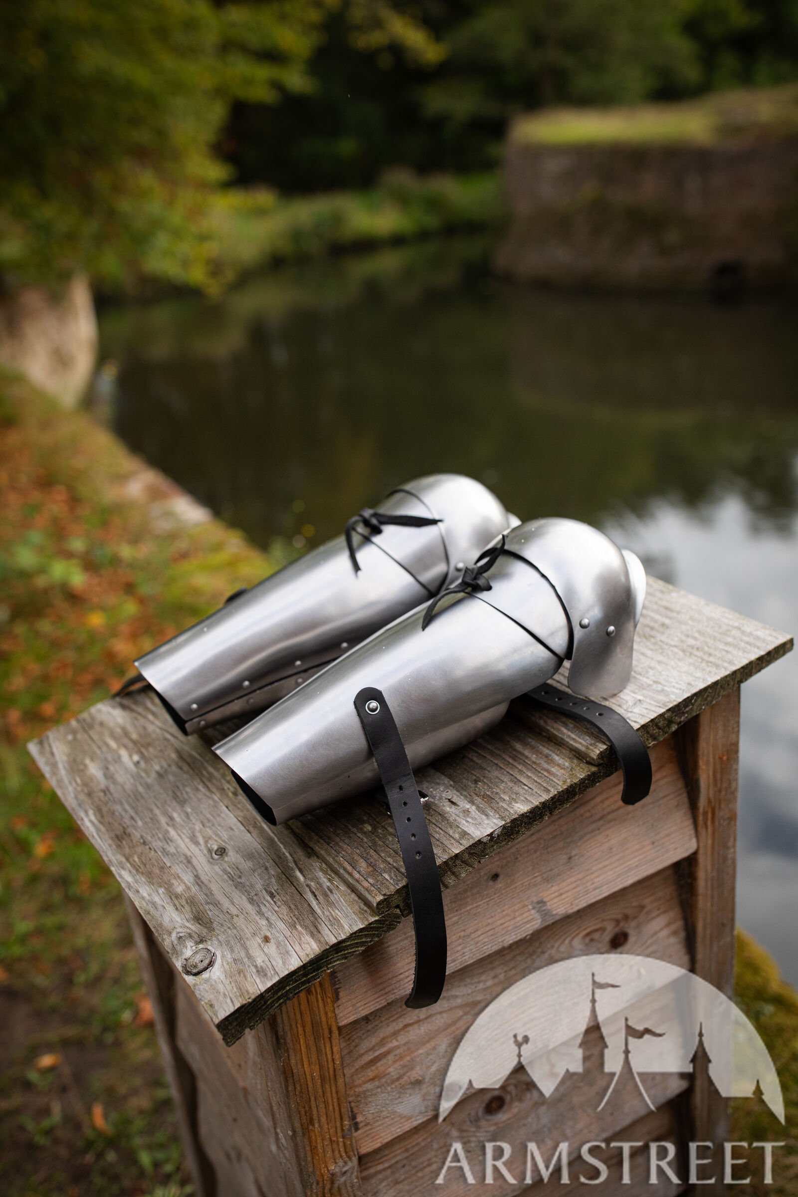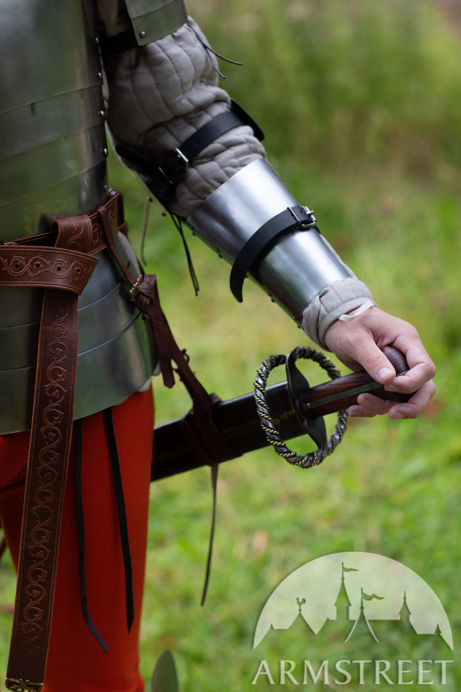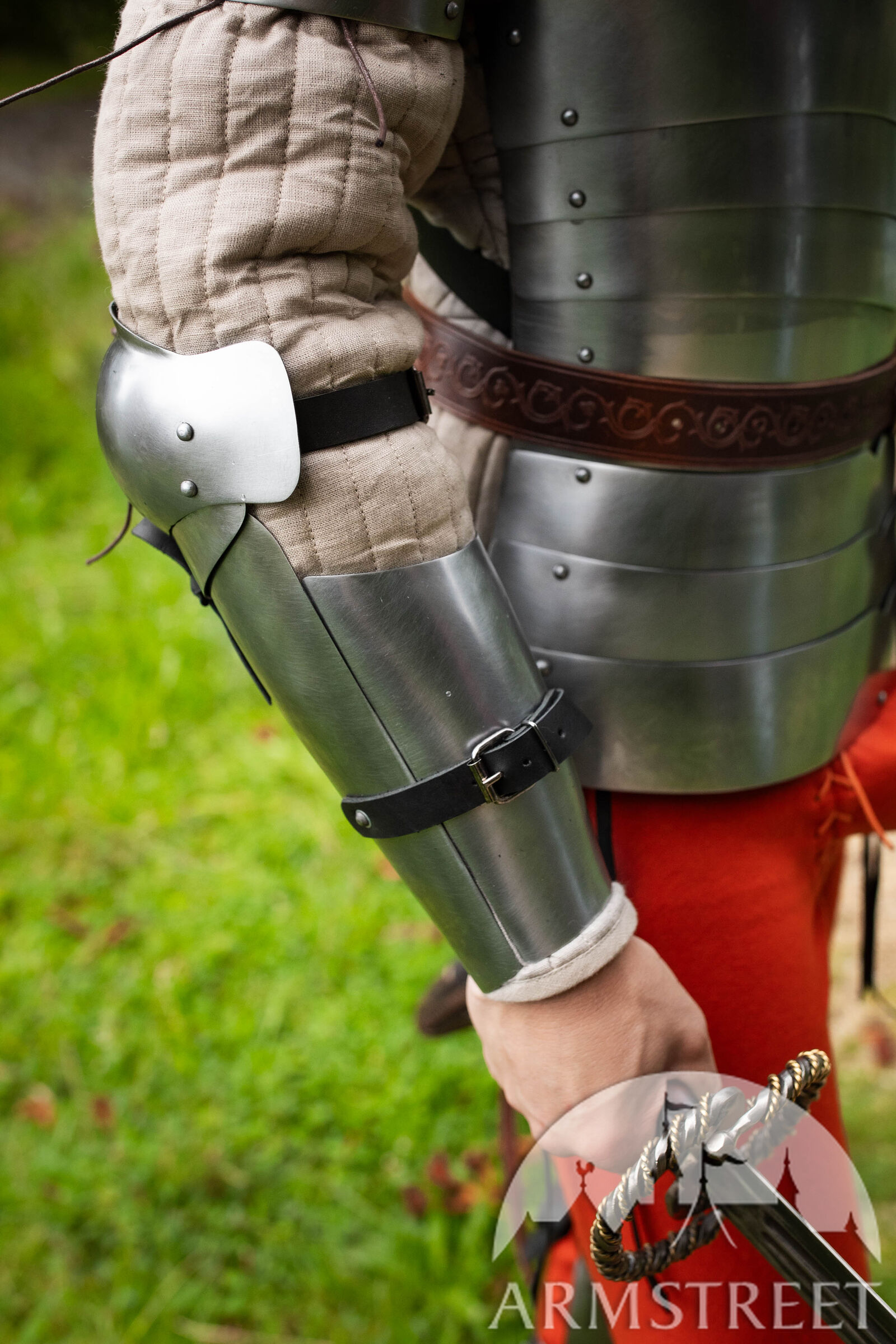 Dieses Set, zusammen mit seinem Verwandten „Söldner“, ist eine praktische, auf Schwertkampf ausgerichtete Rüstung. Sie wurde entwickelt, um eine ansprechende, funktionale und relativ preiswerte Rüstung zu schaffen, die als Grundlage für schwere SCA- oder HEMA-Harnischfechtrüstungen sowie für andere WMA-Anwendungen dienen kann. Diese Armschützer sind somit die einfachste und absolut funktionale Option, die wir für westliche Rüstungen anbieten können. Die klassischen Armschienen mit geschnürten Ellbogenkacheln sind eine seit Jahrhunderten bewährte Lösung für Armschützer.