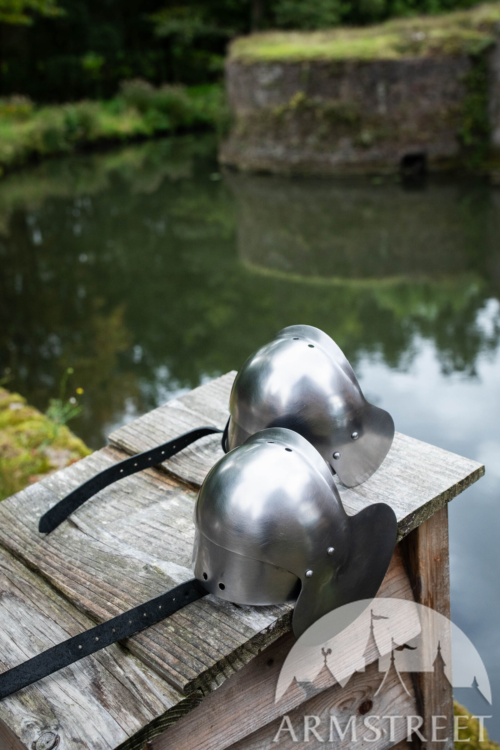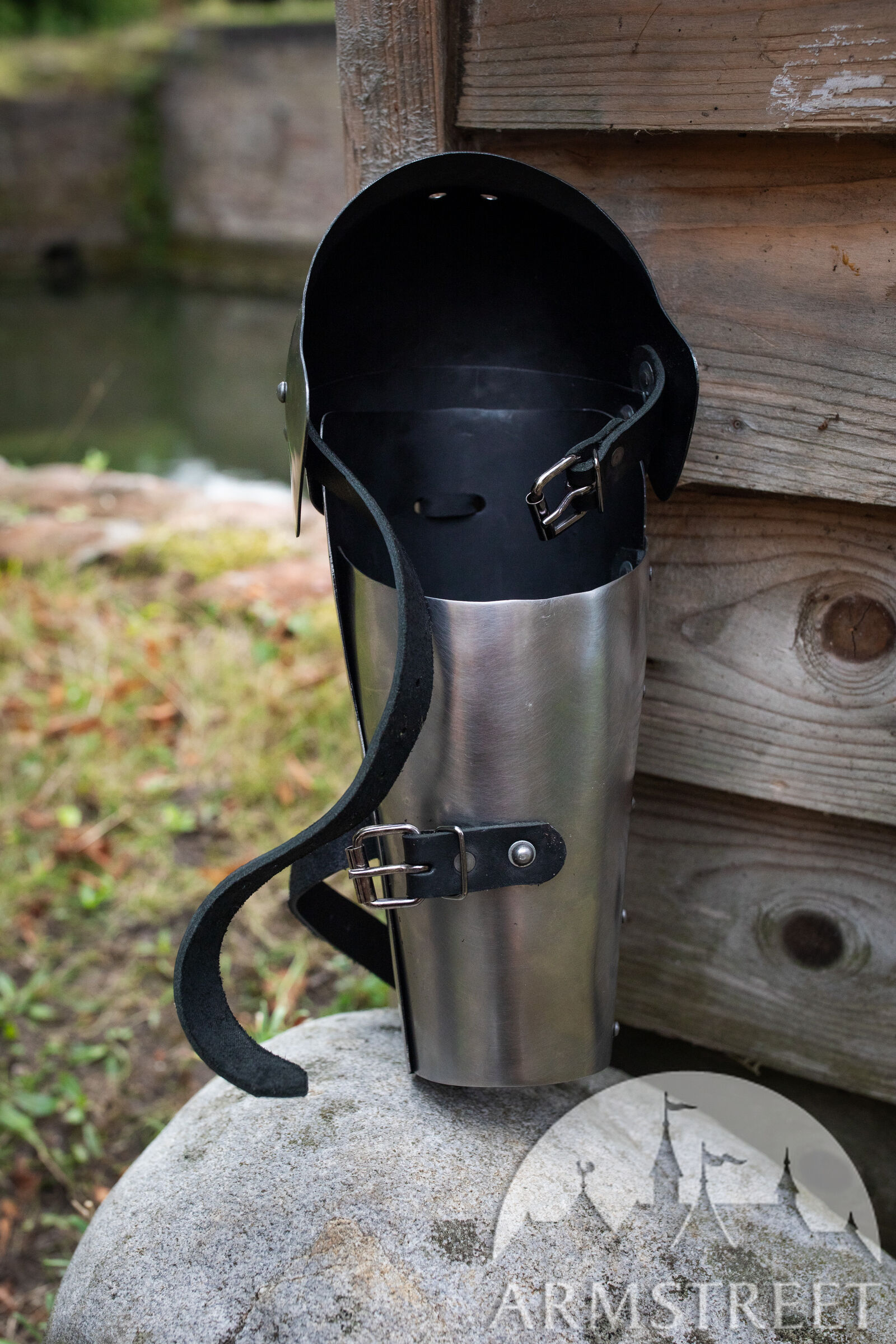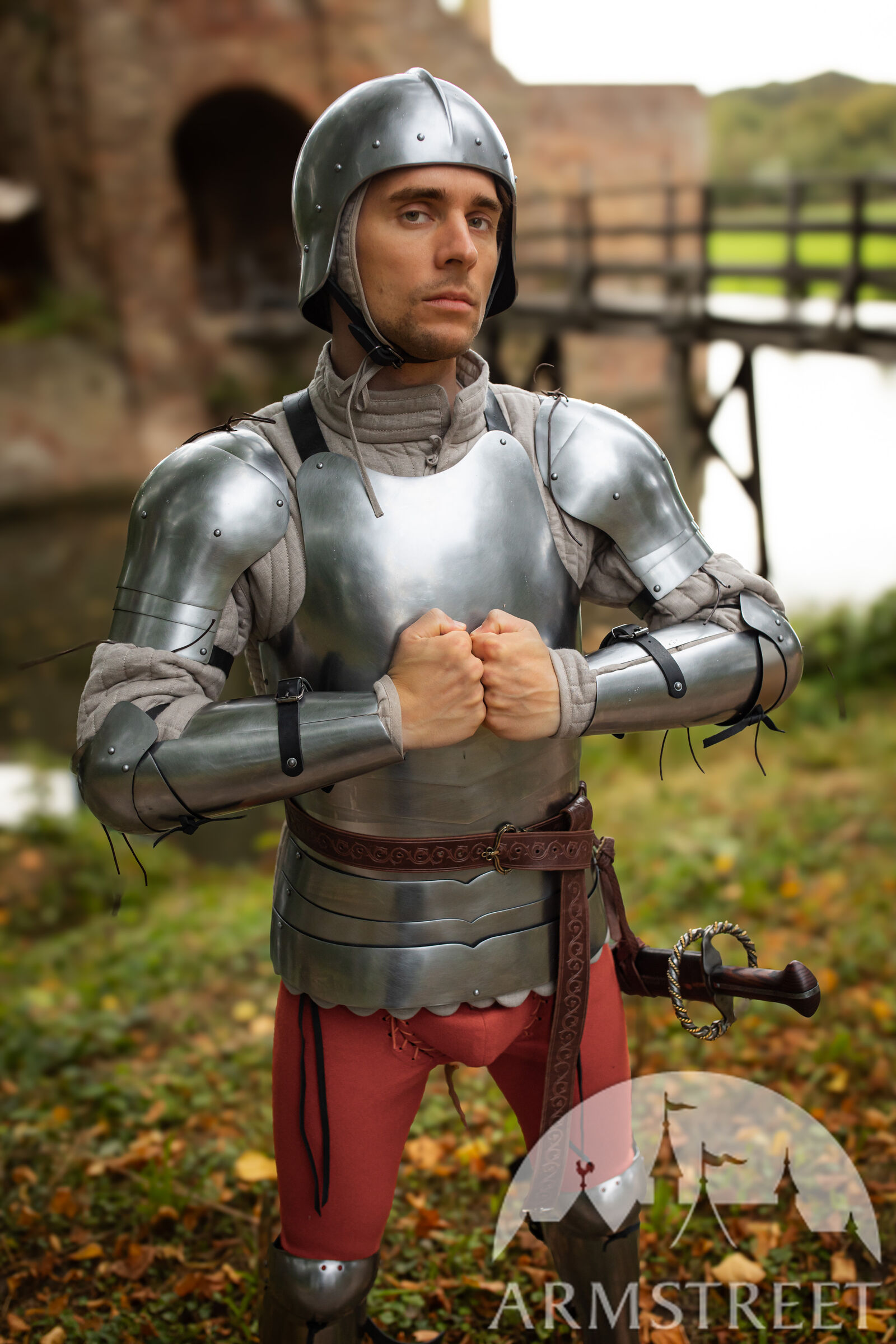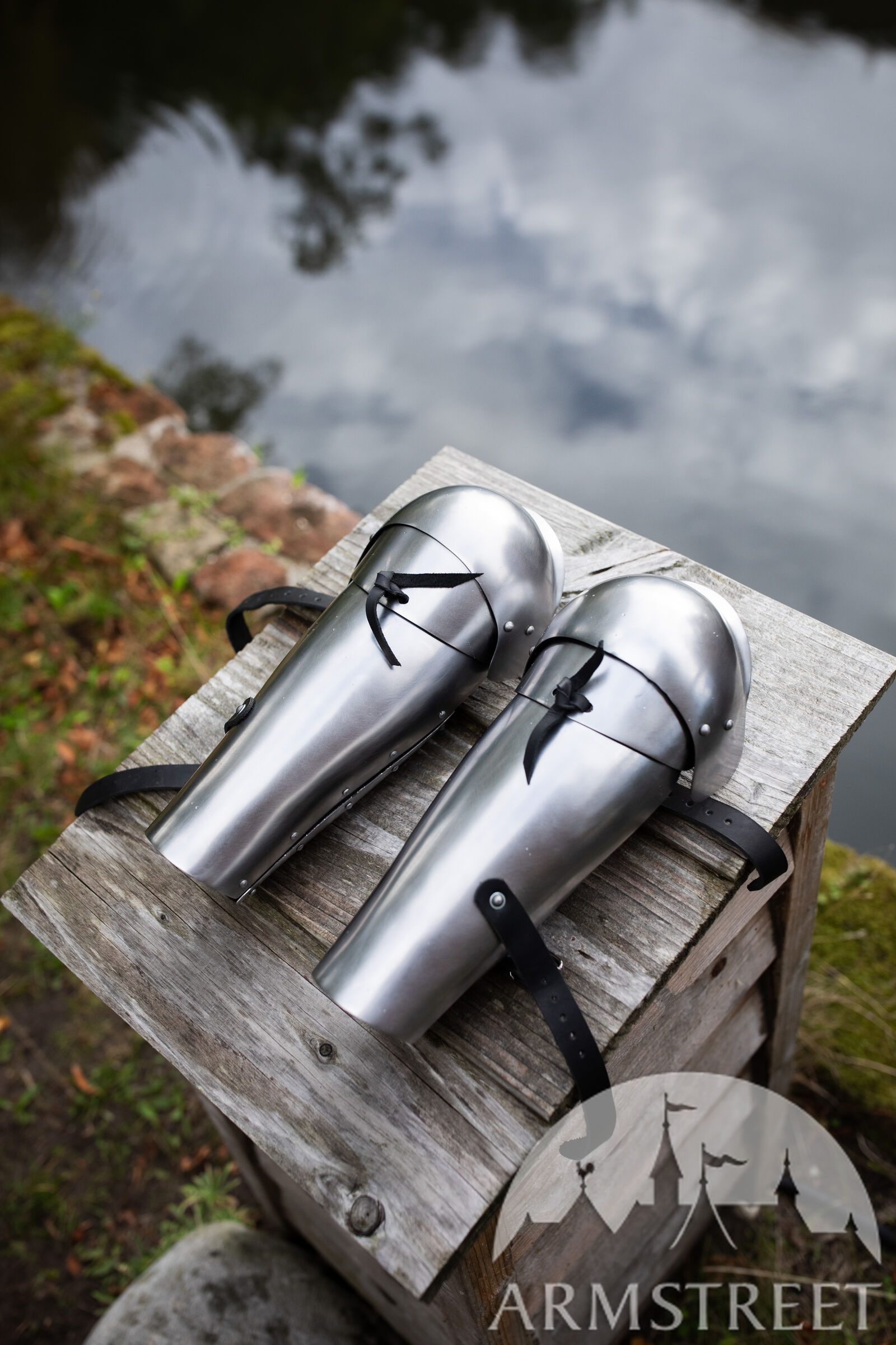 Dieses Set, zusammen mit seinem Verwandten „Söldner“, ist eine praktische, auf Schwertkampf ausgerichtete Rüstung. Sie wurde entwickelt, um eine ansprechende, funktionale und relativ preiswerte Rüstung zu schaffen, die als Grundlage für schwere SCA- oder HEMA-Harnischfechtrüstungen sowie für andere WMA-Anwendungen dienen kann. Diese Armschützer sind somit die einfachste und absolut funktionale Option, die wir für westliche Rüstungen anbieten können. Die klassischen Armschienen mit geschnürten Ellbogenkacheln sind eine seit Jahrhunderten bewährte Lösung für Armschützer.