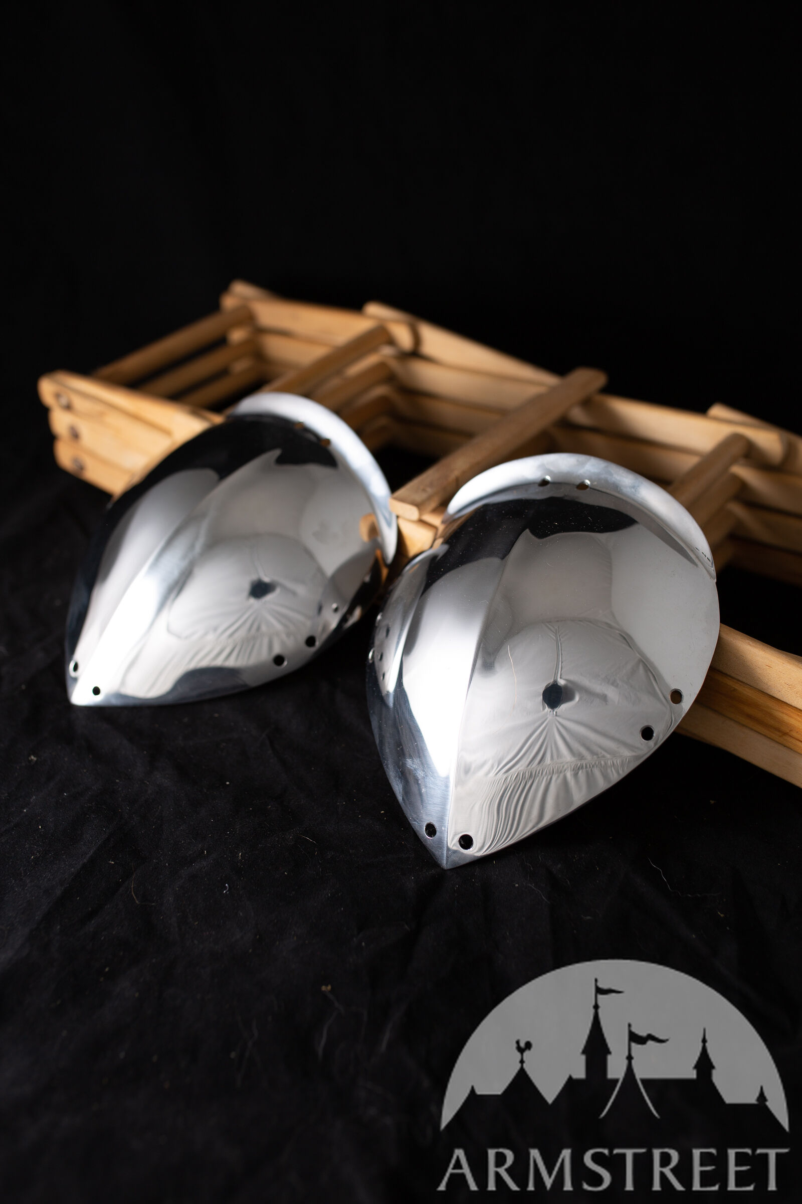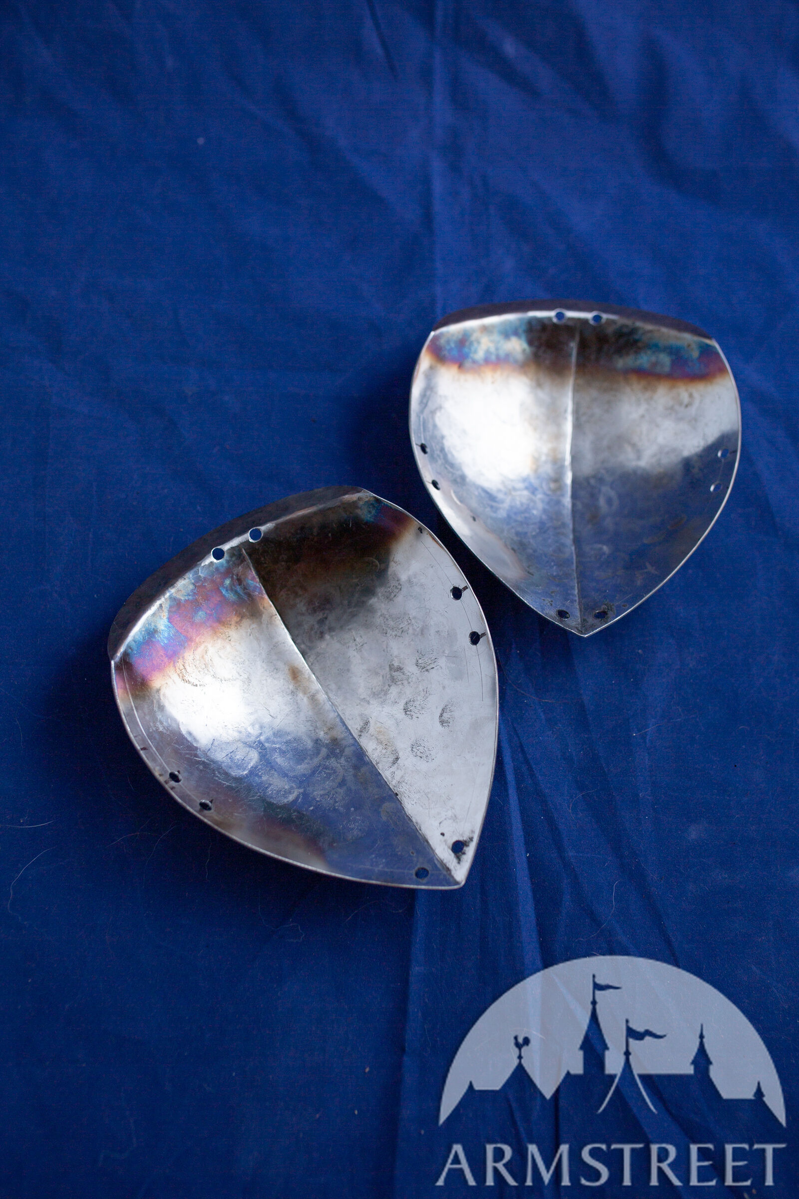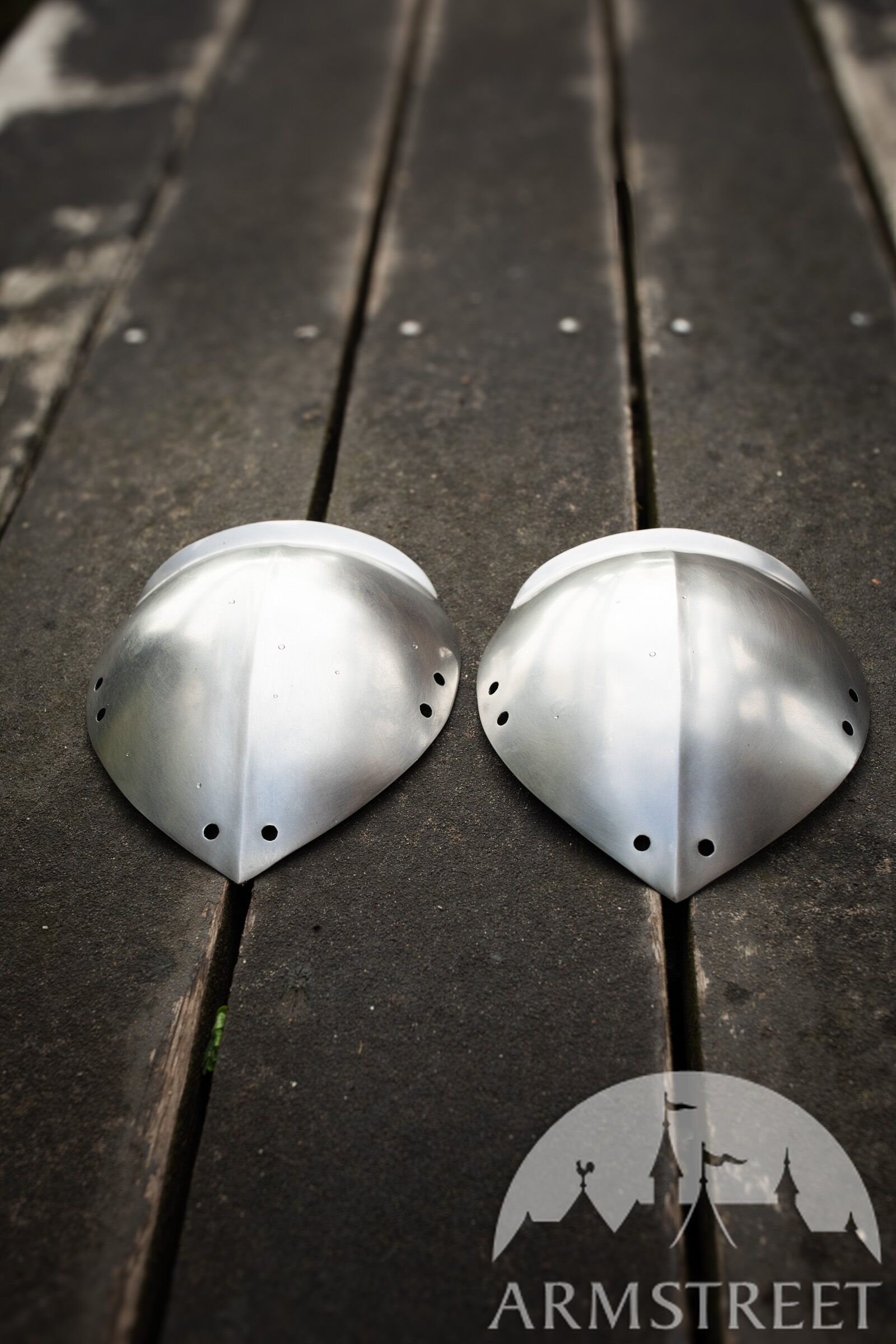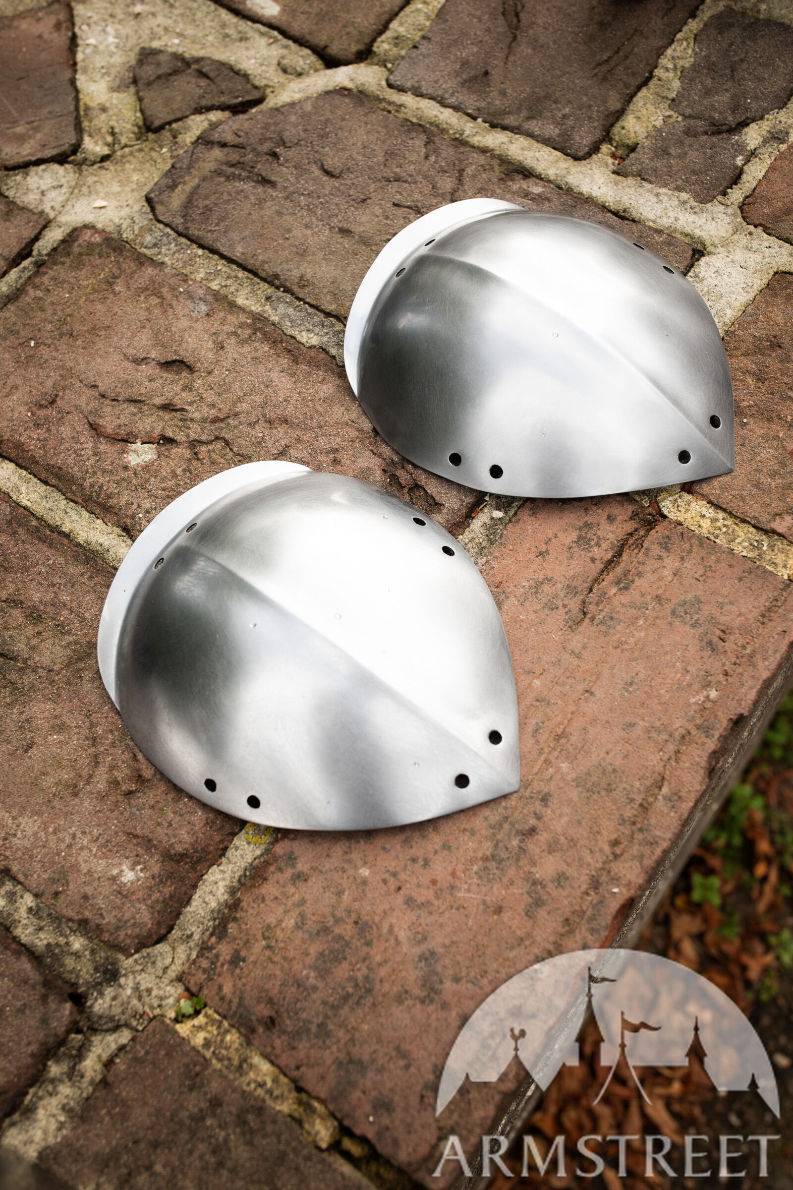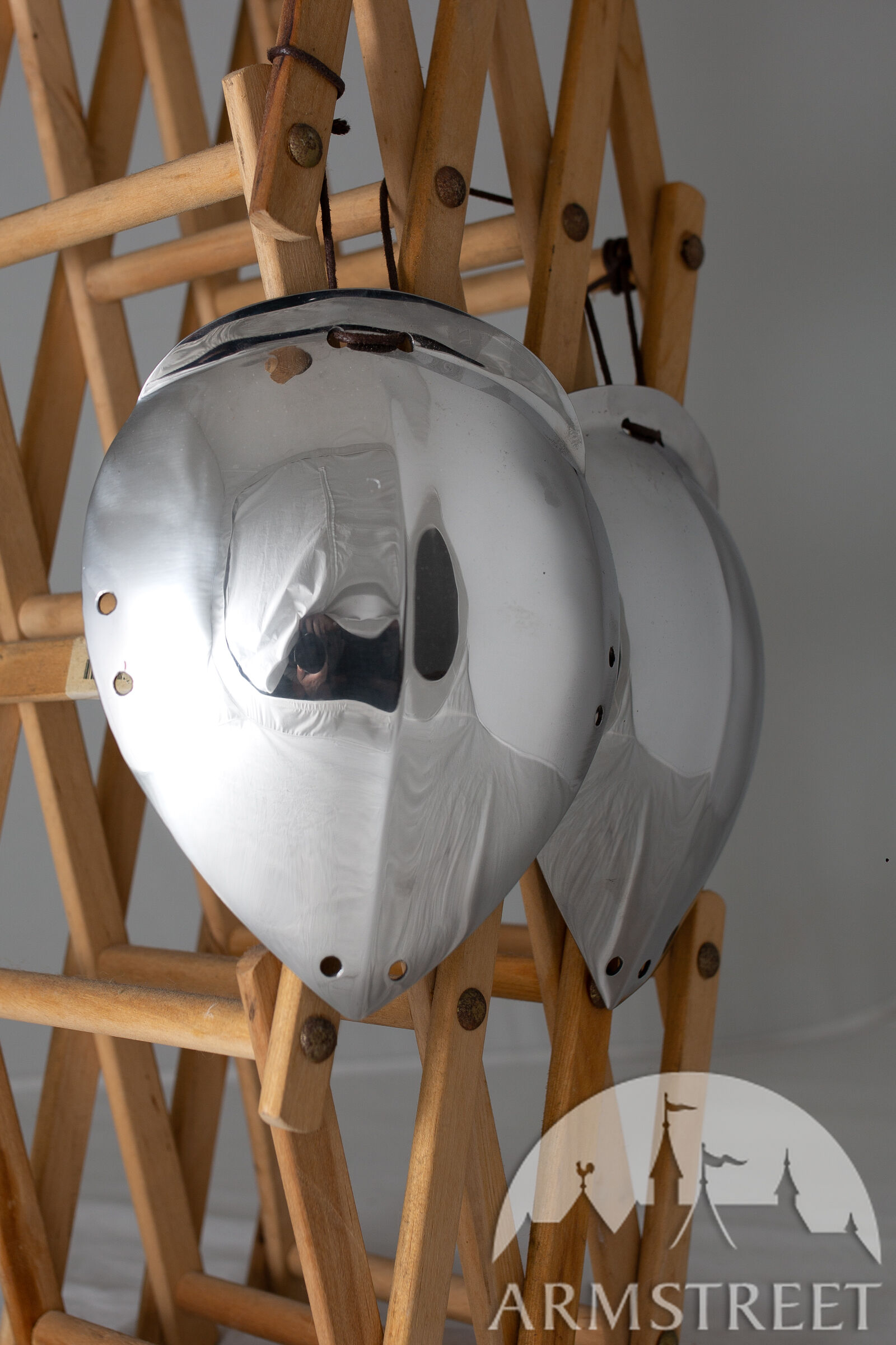Diese Schulterstücke sind die einfachste Variante unserer Schulterschützer. Sie sind schlicht, haben an allen Kanten Ösen zur Befestigung an Gambeson oder HEMA-Jacke und bestehen standardmäßig aus gehärtetem Federstahl, wodurch sie besonders leicht und komfortabel sind. Nach ein paar Testkämpfen werden Sie sie wahrscheinlich gar nicht mehr bemerken. Die geschwärzte (oder messingvergoldete) Version finden Sie hier.