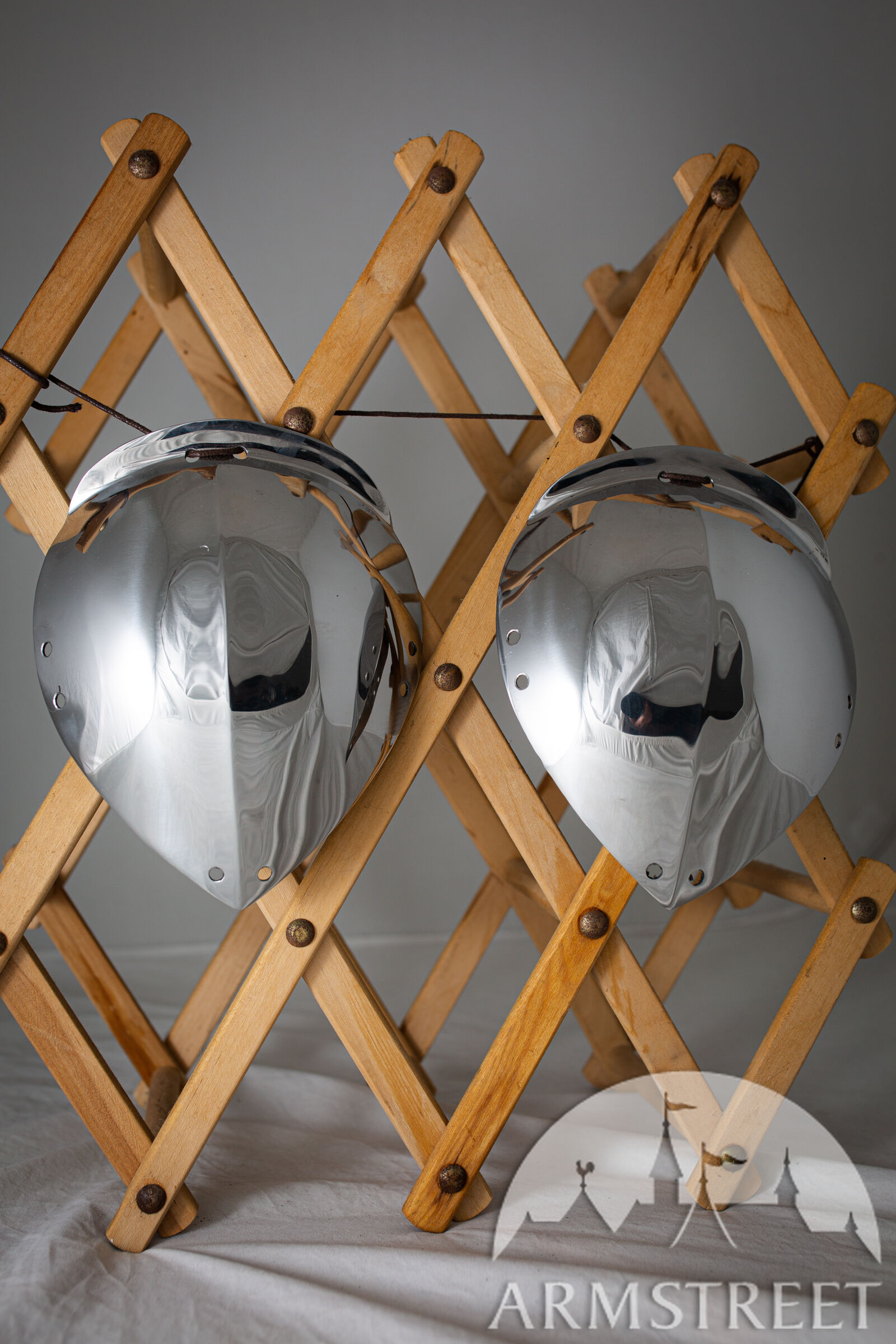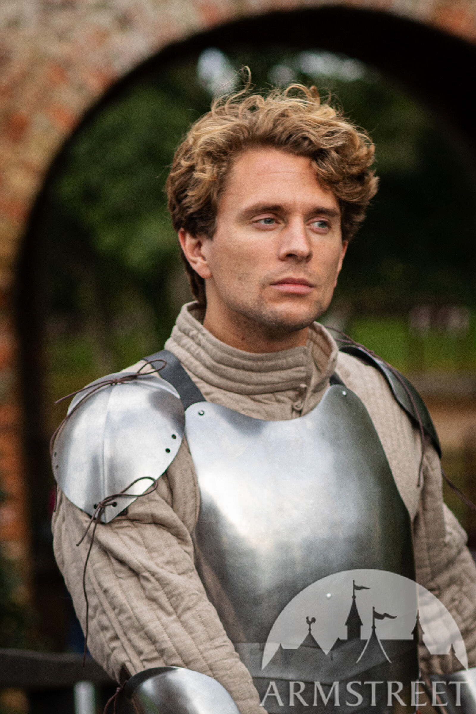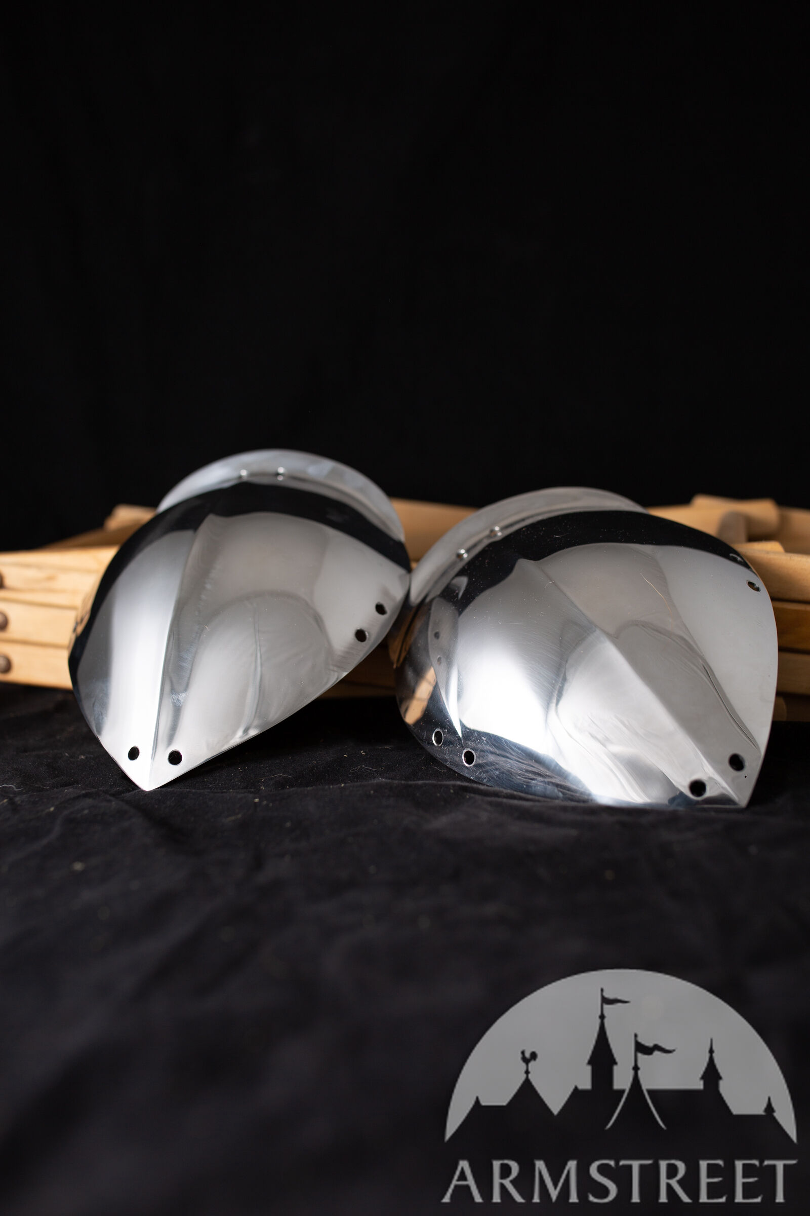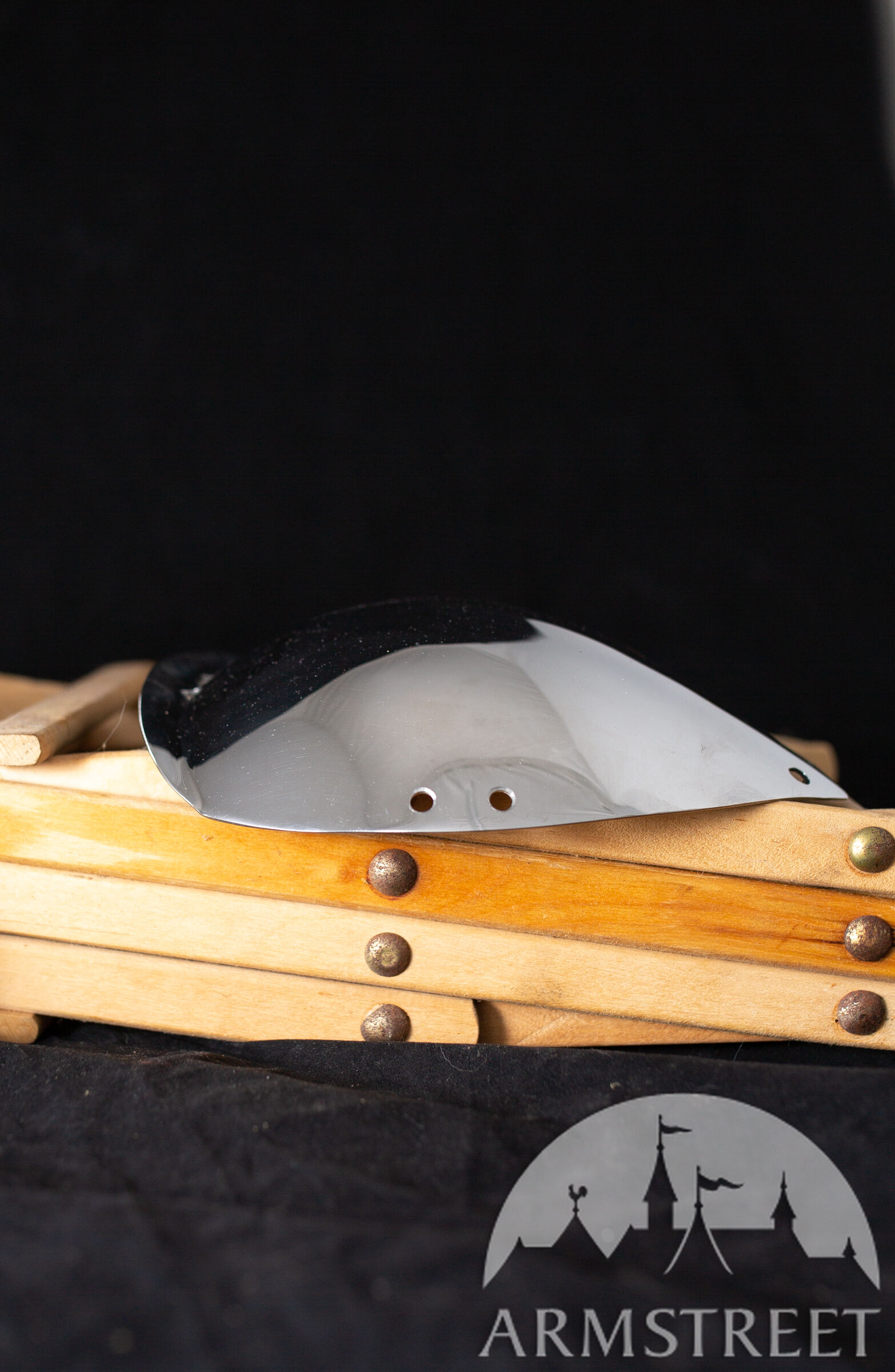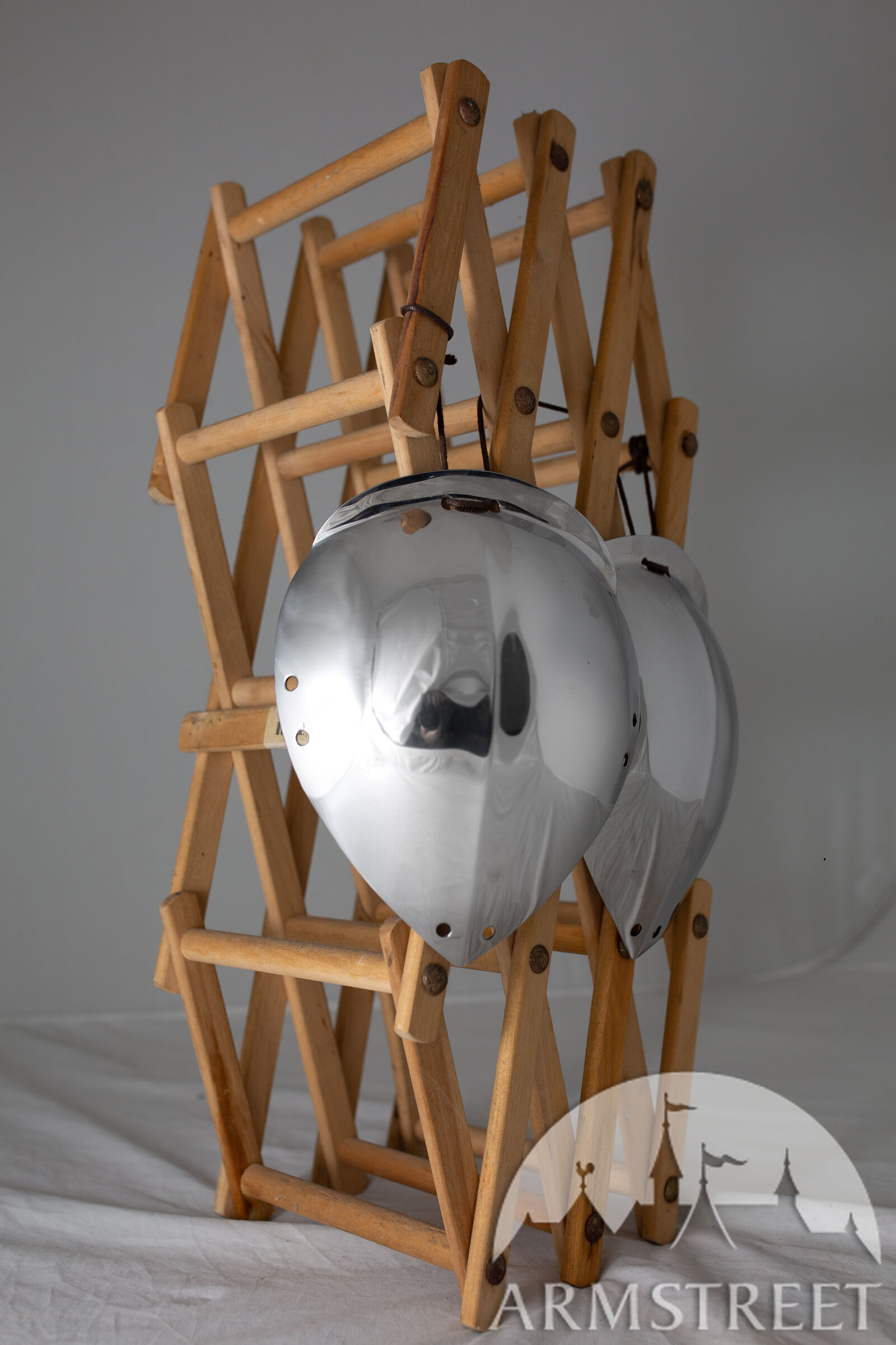 Diese Schulterstücke sind die einfachste Variante unserer Schulterschützer. Sie sind schlicht, haben an allen Kanten Ösen zur Befestigung an Gambeson oder HEMA-Jacke und bestehen standardmäßig aus gehärtetem Federstahl, wodurch sie besonders leicht und komfortabel sind. Nach ein paar Testkämpfen werden Sie sie wahrscheinlich gar nicht mehr bemerken. Die geschwärzte (oder messingvergoldete) Version finden Sie hier.