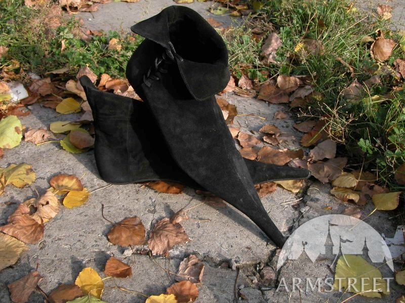 Diese Velourslederschuhe sind ein bestechend schönes Zubehörteil unserer Gotik-Kollektion. Sie sind in Übereinstimmung mit der original historischen Vorlage erstaunlich kunstfertig gearbeitet. Diese Schuhe verleihen Ihrem Mittelalter- oder Gotik-Kostüm den letzten Schliff und sorgen für einen vollendeten Auftritt. Die Schuhe sind nach moderner Schuhmacherkunst gefertigt, so dass sich heutiger Komfort perfekt mit dem mittelalterlichen Stil verbindet. So sind Sie bestens für jedes Mittelalter-Event oder Rollenspiel gerüstet, ohne den authentischen, mittelalterlichen Look zu beeinträchtigen. Die Sohle besteht aus dünnem Gummi und die Sohlenkanten sind nach historischen Fertigungstechniken gearbeitet, was den Schuhen einen absolut authentischen „ledernen“ Look verleiht, ohne dabei jedoch so glatt und rutschig zu sein wie Ledersohlen.